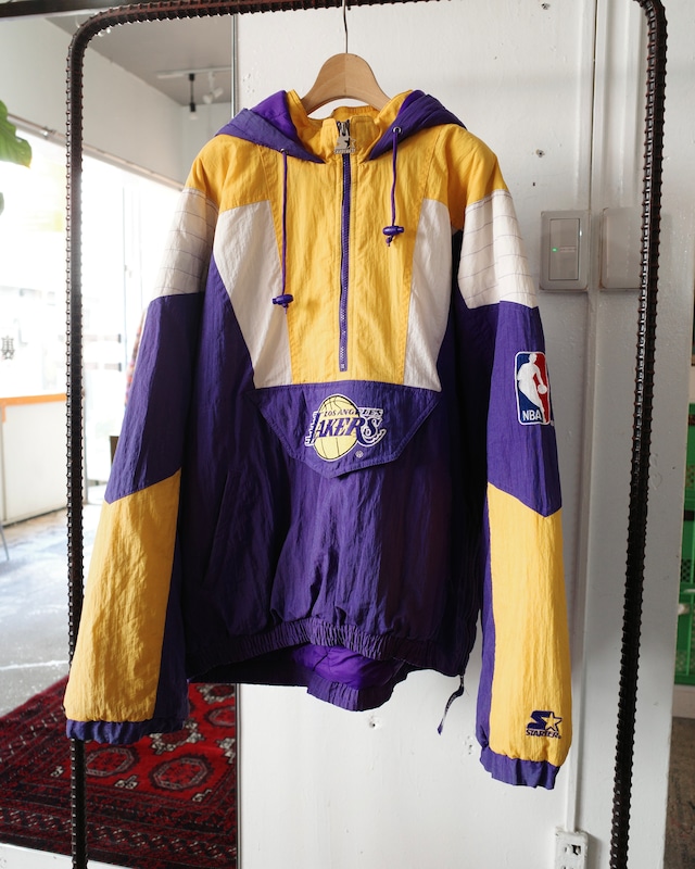 ロサンゼルス・レイカーズのスターター製ナイロンジャケット 紫と黄色のレイカーズカラーが目を引くこちら サイズ感は大きめ、だぼっと 緑などのスラックスで綺麗めに、スニーカーはエアフォースワンで合わせてみたりするのも面白そうです 花柄の古着らしいボトムスも合いそうな、そんなムードの一着です [size] 着丈76cm 身幅77cm 肩幅53cm 袖丈72cm アーム幅35cm 比較的状態の綺麗なアイテムを厳選して買付けておりますが、中にはダメージ等があるものもございます。当店ではこういった使用感も含めて古着のもつ良い雰囲気であると考え販売致しております。ダメージや汚れ等ご心配なお客様はご注文前にメールでお気軽にお問い合わせ下さい。 coug.co.jp