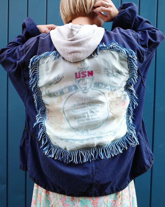 アメリカ海軍のタペストリーを背面にあしらった贅沢なリメイクシャツ リバーシブルになっており表はネイビー、裏はブラックになっています 袖の形状、ドローコードの位置どこをとってもかわいい一着 丸首なのでフードを重ねたり様々なレイヤードスタイルを楽しんでいただけます スペシャルな一着、ぜひご検討くださいませ ※引っ掛け傷が数箇所ございます予めご了承くださいませ [size] 着丈73.5cm 身幅70cm 肩幅55cm 袖丈54.5cm アーム幅35cm 比較的状態の綺麗なアイテムを厳選して買付けておりますが、中にはダメージ等があるものもございます。当店ではこういった使用感も含めて古着のもつ良い雰囲気であると考え販売致しております。ダメージや汚れ等ご心配なお客様はご注文前にメールでお気軽にお問い合わせ下さい。 coug.co.jp