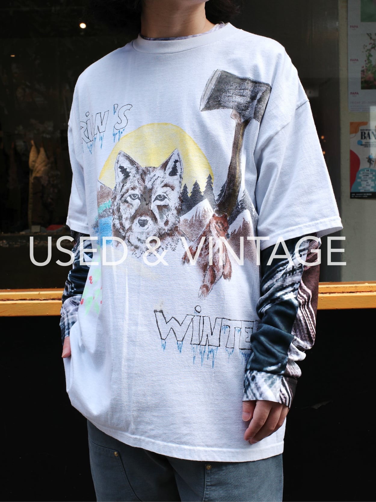 グレイトフル・デッド"Europe '72"に登場するアイスクリームキッドが刺繍されたTシャツ 日焼けや生地の風合い、ビンテージな風合いです グレイトフル・デッドらしいサイケな色合いにポップなキャラクターが可愛いです 大きめサイズ、一枚でワンピースみたいに着てもよいです 白黒ボーダーロンTを重ね着とかしてもグッドです [サイズ] 着丈79cm 身幅59cm 肩幅60cm 袖丈27cm アーム幅29.5cm [素材] コットン100% [コンディション] 両肩部分にダメージ、日焼けあり 古着特有の風合いとしてご理解いただける方におすすめです ダメージはありますが、着用自体に問題はありません ※細かい状態が気になる方は右下のメッセージマークからお問い合わせくださいませ 比較的状態の綺麗なアイテムを厳選して買付けておりますが、中にはダメージ等があるものもございます。当店ではこういった使用感も含めて古着のもつ良い雰囲気であると考え販売致しております。ダメージや汚れ等ご心配なお客様はご注文前にお気軽にお問い合わせ下さい。 また、こちらの商品は実店舗と在庫共有を行なっているため、売り切れやお届けまでお時間を頂戴してしまう可能性がございます。予めご了承ください。 coug.co.jp