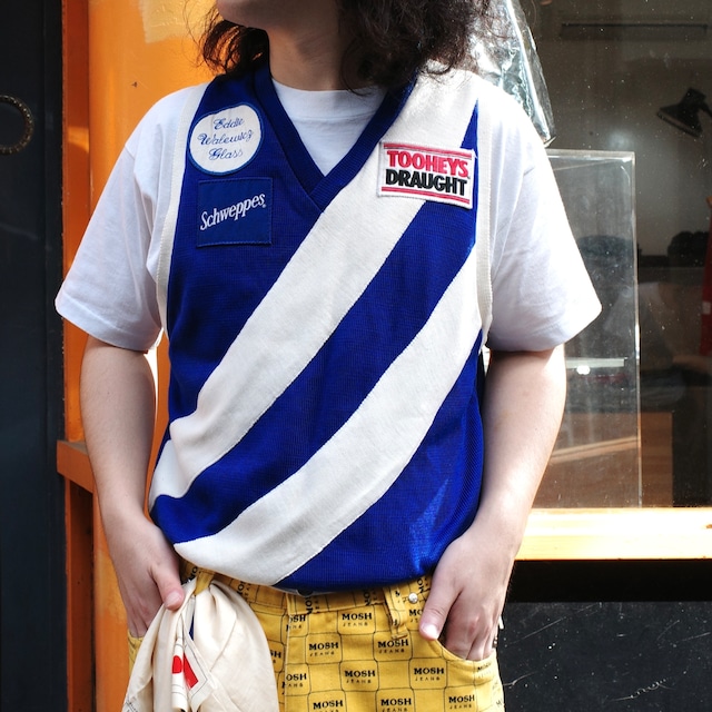 鮮やかなロイヤルブルーにホワイトの斜めサッシュ2本が走る、スポーツユニフォーム由来のニットベスト。 胸にはSchweppes、Tooheys Draught、Eddie Walewicz Glassのパッチが付き、背面にはナンバーパネル風の切り替えを配置。 軽やかなニットゲージとVネックで、Tシャツやシャツの上に重ねるだけでアイキャッチに仕上がります。 [size] 着丈79cm 身幅50cm 肩幅33cm アーム幅32cm 比較的状態の綺麗なアイテムを厳選して買付けておりますが、中にはダメージ等があるものもございます。当店ではこういった使用感も含めて古着のもつ良い雰囲気であると考え販売致しております。ダメージや汚れ等ご心配なお客様はご注文前にメールでお気軽にお問い合わせ下さい。 こちらの商品は実店舗と在庫共有を行なっているため、売り切れや、お届けまでお時間を頂戴してしまう可能性がございます。予めご了承ください。 また、その他ご不明な点等ございましたら、ご注文前にメールでお気軽にお問い合わせ下さいませ。 coug.co.jp