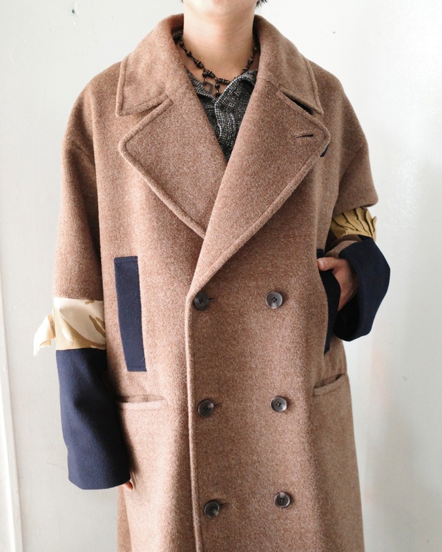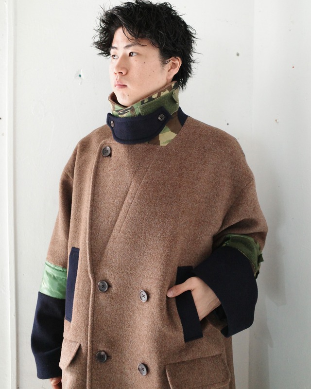 アルパカ70%、ウール30%の”MOON”と名付けられたデッドストック極上素材で仕立てたPコート。 程よい毛足のあるイギリス製。 こちらはRE;LIGHT PROJECTによる当店オリジナルのアイテムとなっております。 重厚感のある素材に遊びゴゴロを加えたミリタリーやユーズドアイテムを配置。 チンストラップを留めると、裏衿のカモ柄素材がのぞきます。 総裏仕立ての、重厚さと鮮やかさの色合いを楽しめるPコートとなっております。 brand YEAH RIGHT!! item BRWN ALPAKA SHAGGY P-COAT color BROWN size 02 総丈114cm 身幅65cm 肩幅59cm 袖丈56cm アーム幅24cm 日本製 古着を使用したリメイクアイテムのため、シミや傷等がある場合がございます。 古着の風合いとしてお楽しみ頂きたい部分ですのでその点は予めご了承ください。 こちらの商品は実店舗と在庫共有を行なっているため、売り切れや、お届けまでお時間を頂戴してしまう可能性がございます。 商品をご用意出来ない場合は別途ご連絡をさせて頂きます。予めご了承ください。 サイズ等ご心配なお客様は、ご注文前にメールでお気軽にお問い合わせ下さいませ。 coug.co.jp