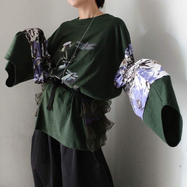 深みのあるダークグリーンをベースに、アーティスティックなプリントが映えるロングスリーブTシャツ。 背面には花瓶やトンボ、植物などをモチーフにしたシュルレアリスム的な静物画風のデザインが施され、幻想的な雰囲気を演出。 袖部分には、パープルとブラウンを基調とした抽象的なフラワーパターンが切り替えとして使用され、TATA CHRISTIANEらしい実験的かつ独創的なスタイルに仕上がっています。 オーバーサイズのシルエットで一枚で存在感を放つだけでなく、インナーとしても活躍するユニークなアイテムです。 brand TATA CHRISTIANE item L/S PRINT T-SHIRTS color GREEN size M 着丈73.5cm 身幅57.5cm 肩幅53cm 袖丈62cm アーム幅29cm COTTON 80% RAYON 18% POLYURETHANE 2% 【TATA CHRISTIANE(タタ・クリスティアン)】 2007年に Julie Bourgeois と Hanri Gabriel の2人によりスタート。 舞台衣装のための作品とファッション・デザインの革新を結合させ,ファンタジーに溢れたコレクションを製作しています。 こちらの商品は実店舗と在庫共有を行なっているため、売り切れや、お届けまでお時間を頂戴してしまう可能性がございます。 商品をご用意出来ない場合は別途ご連絡をさせて頂きます。予めご了承ください。