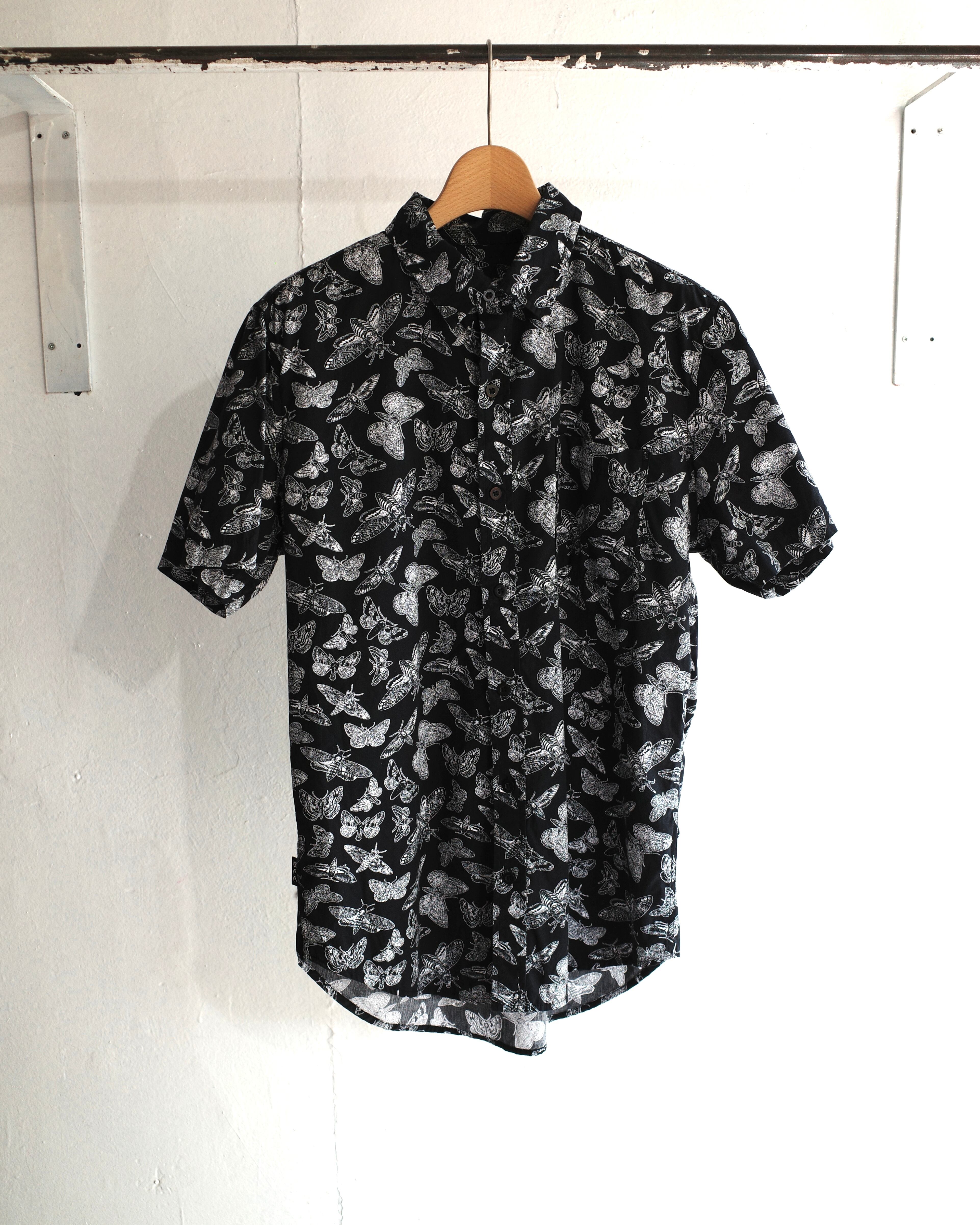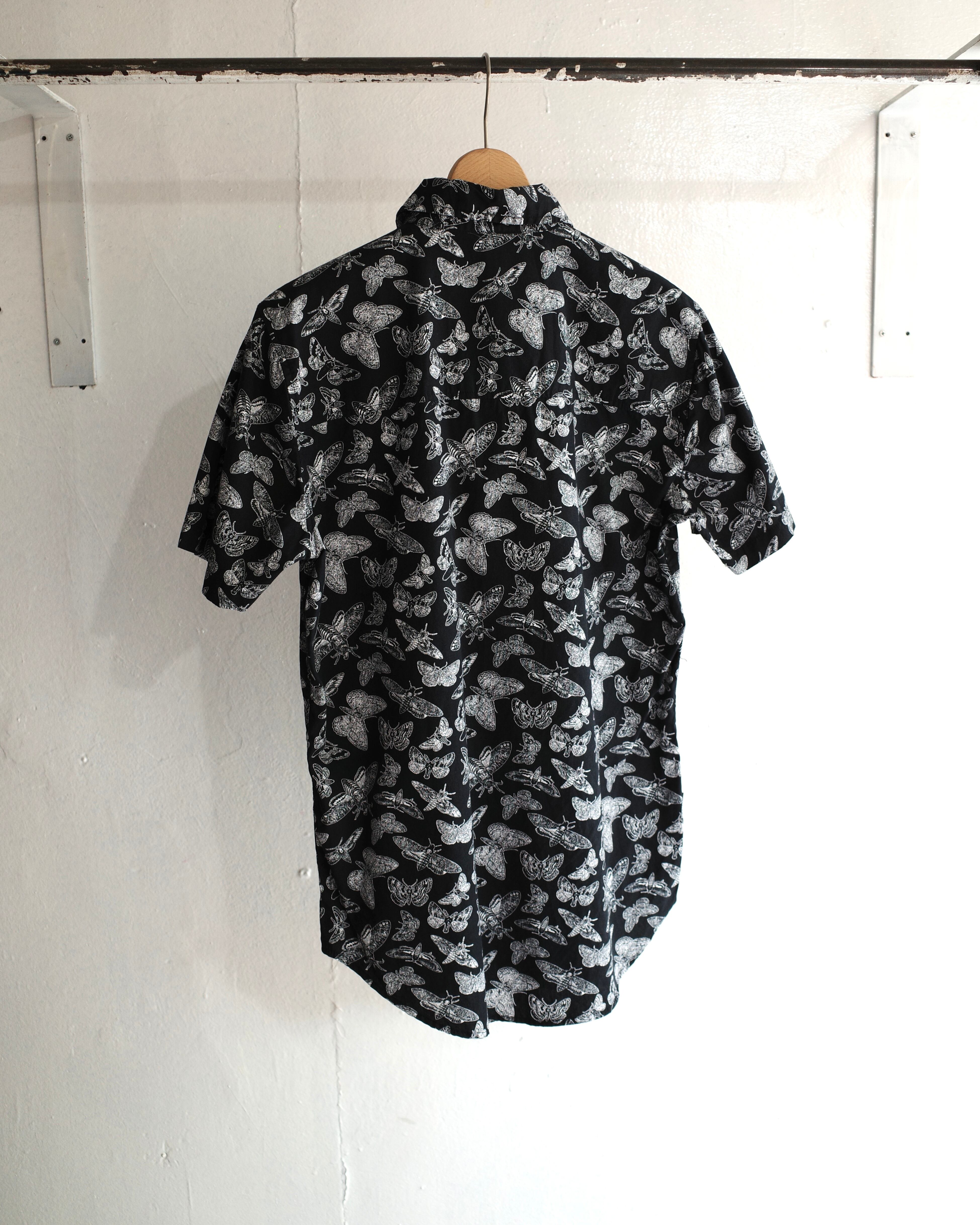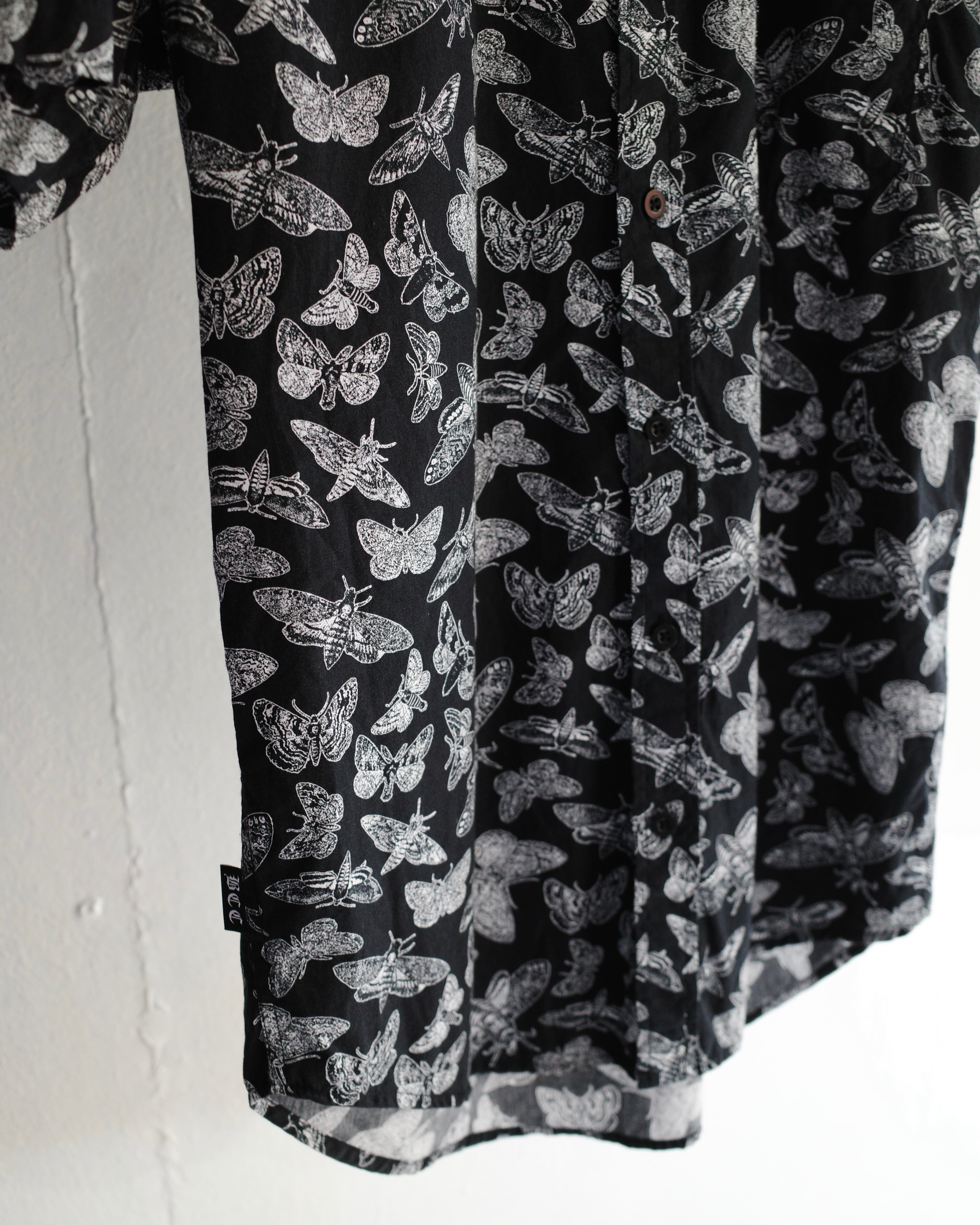 ブラックベースにホワイトで描かれた蝶や蛾の総柄が印象的なシャツ。