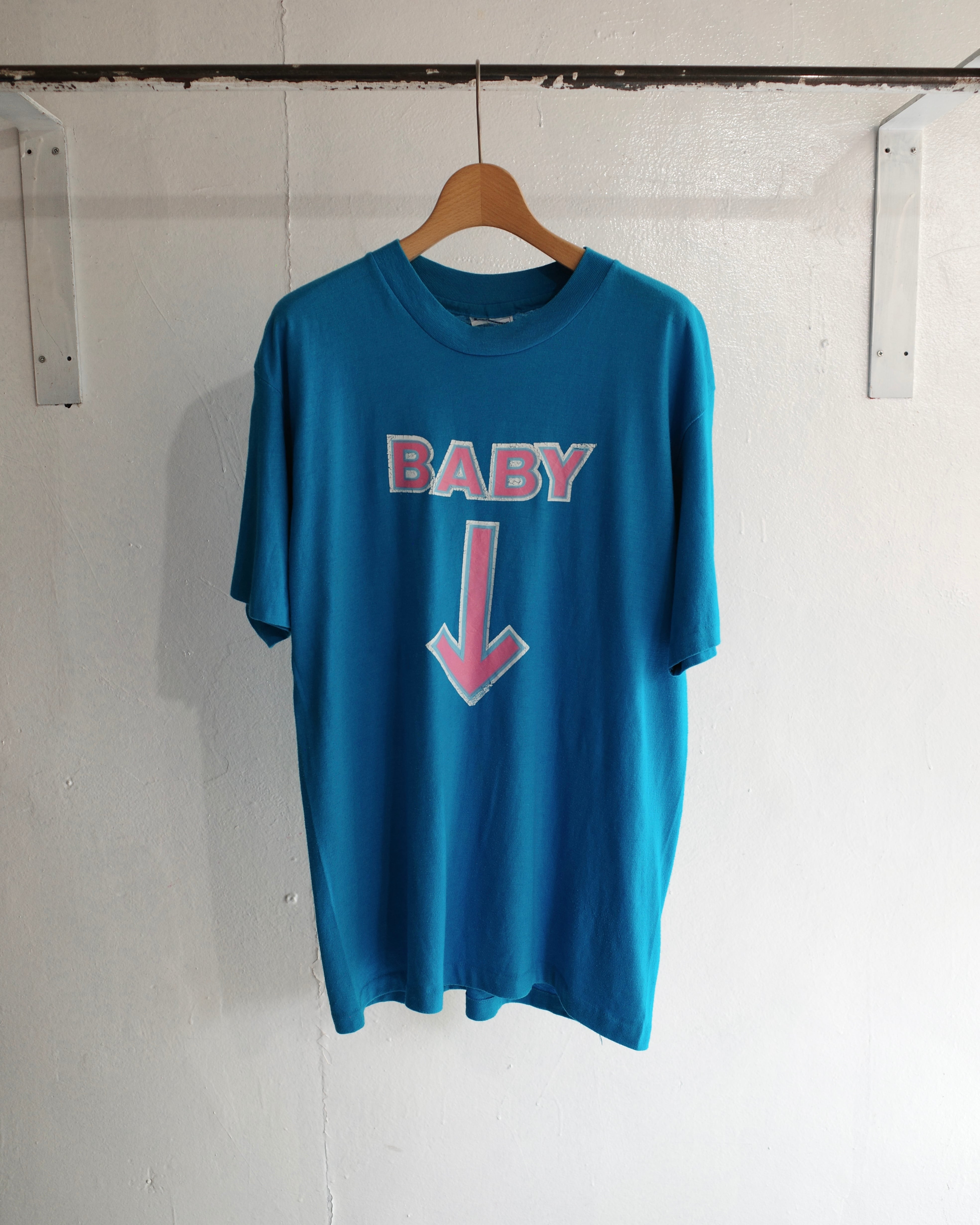 ブルーのボディにピンクとホワイトで「BABY」とアローがプリントされた、ユニークなデザインのTシャツ。