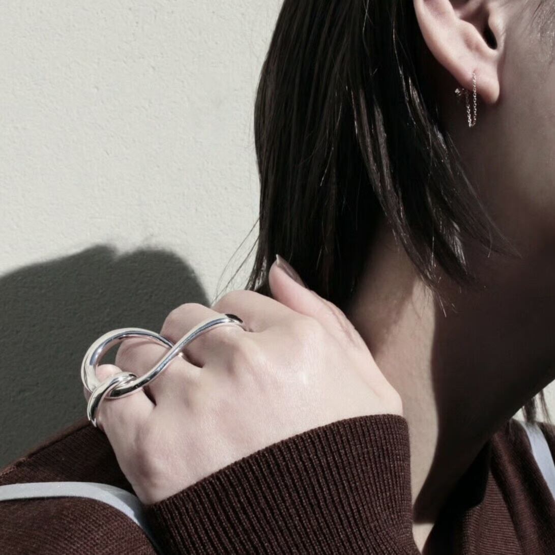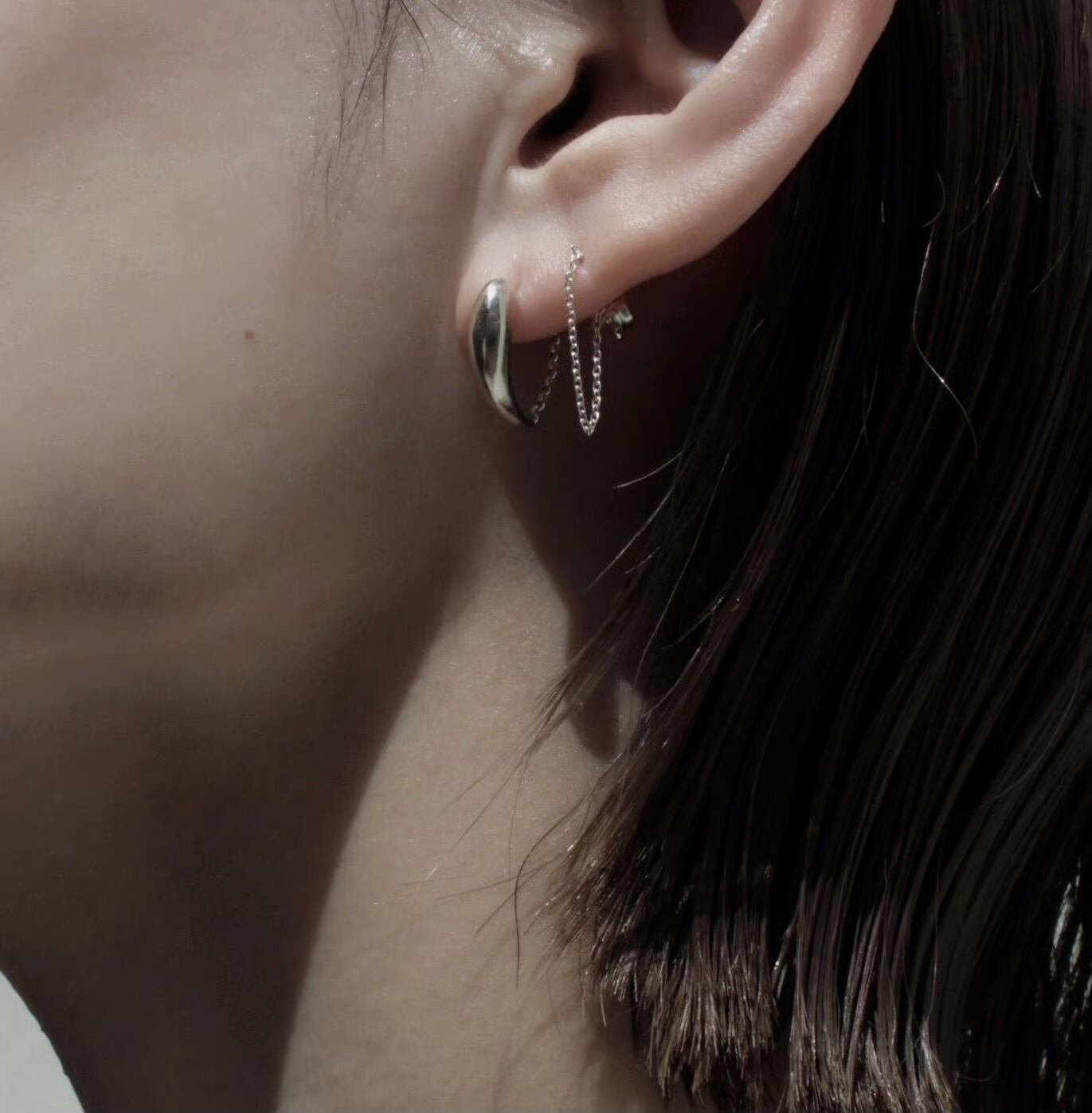 チェーンの先端をポストに通す基本の着用方法のほか、チェーンを垂れ下げてアメリカンピアスとしてもご着用いただけます。