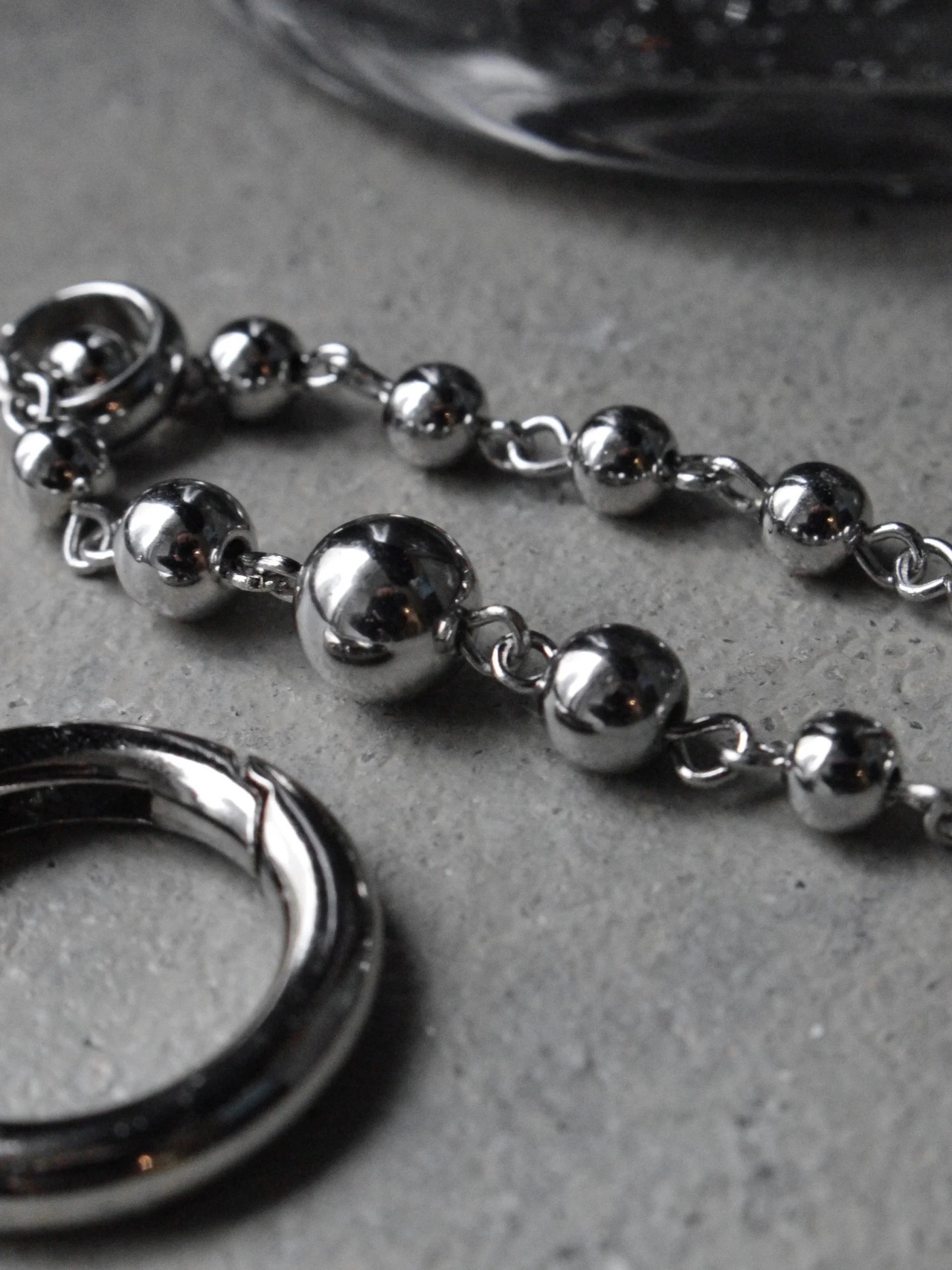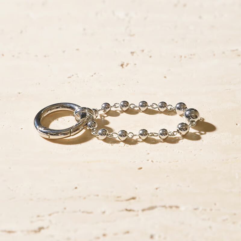 シーンや装いによって、多連に組み合わせる事も、Simpleに着用する事も出来る「Metal ball carabiner series」。見た目のボリュームに反し、中が中空のパーツを使用しているため、付け心地が良いのが特徴です。