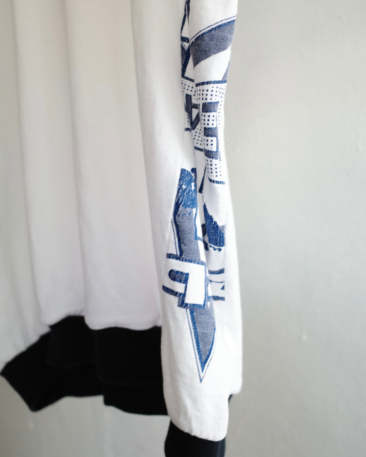 ホワイトを基調に、ネイビーとブラックの切り替えやラインが袖に施され、スポーティかつ個性的なデザインに仕上がっています。