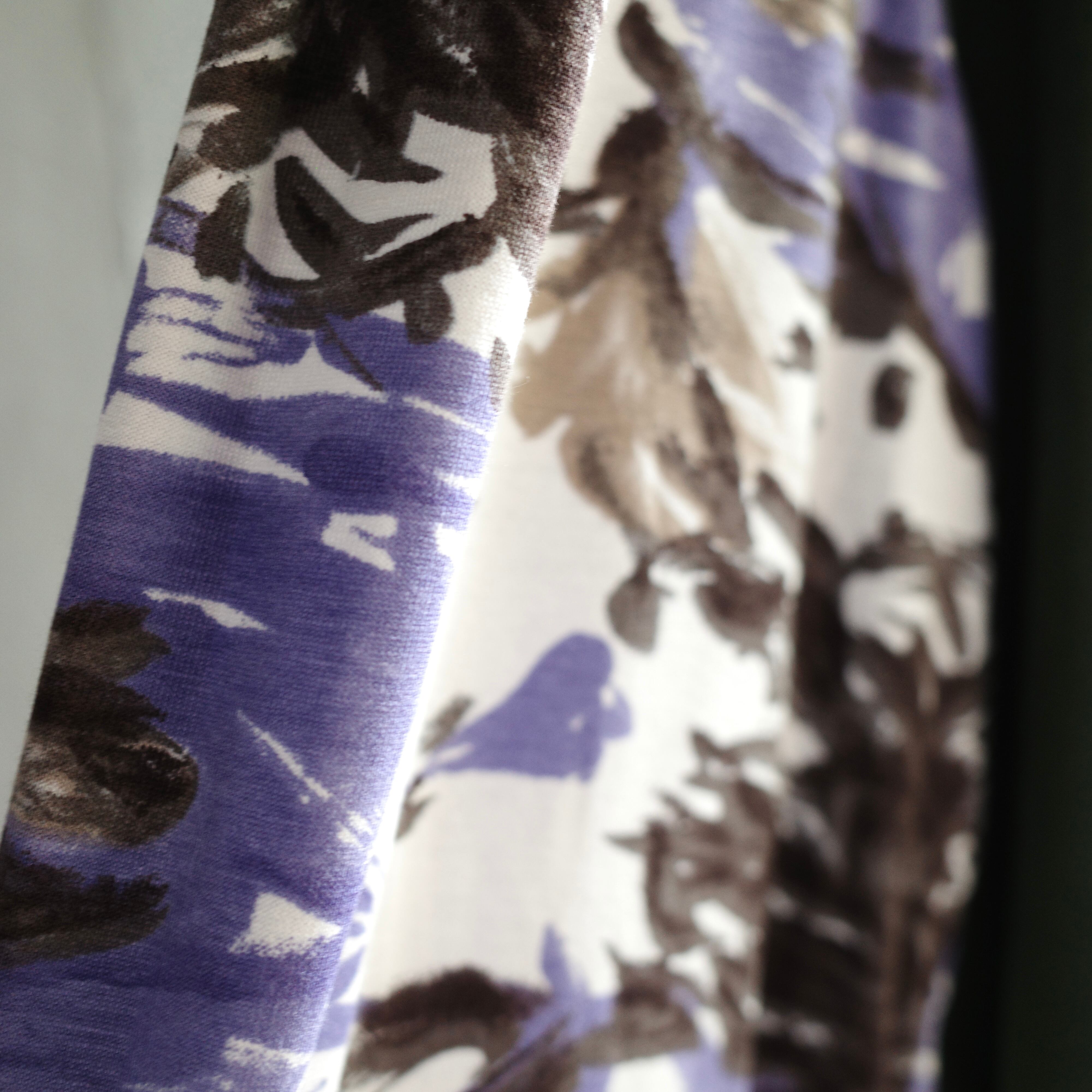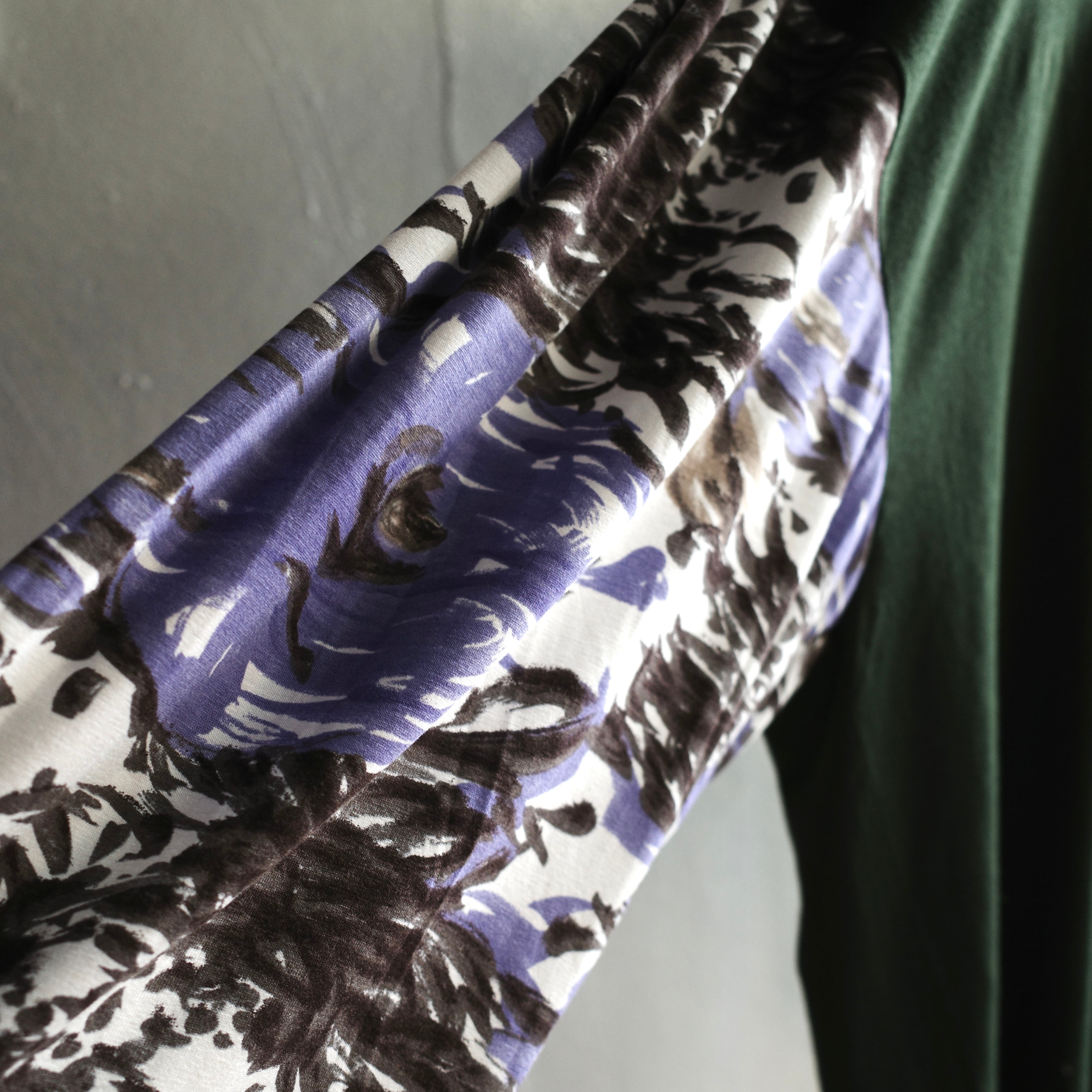 袖部分には、パープルとブラウンを基調とした抽象的なフラワーパターンが切り替えとして使用され、TATA CHRISTIANEらしい実験的かつ独創的なスタイルに仕上がっています。