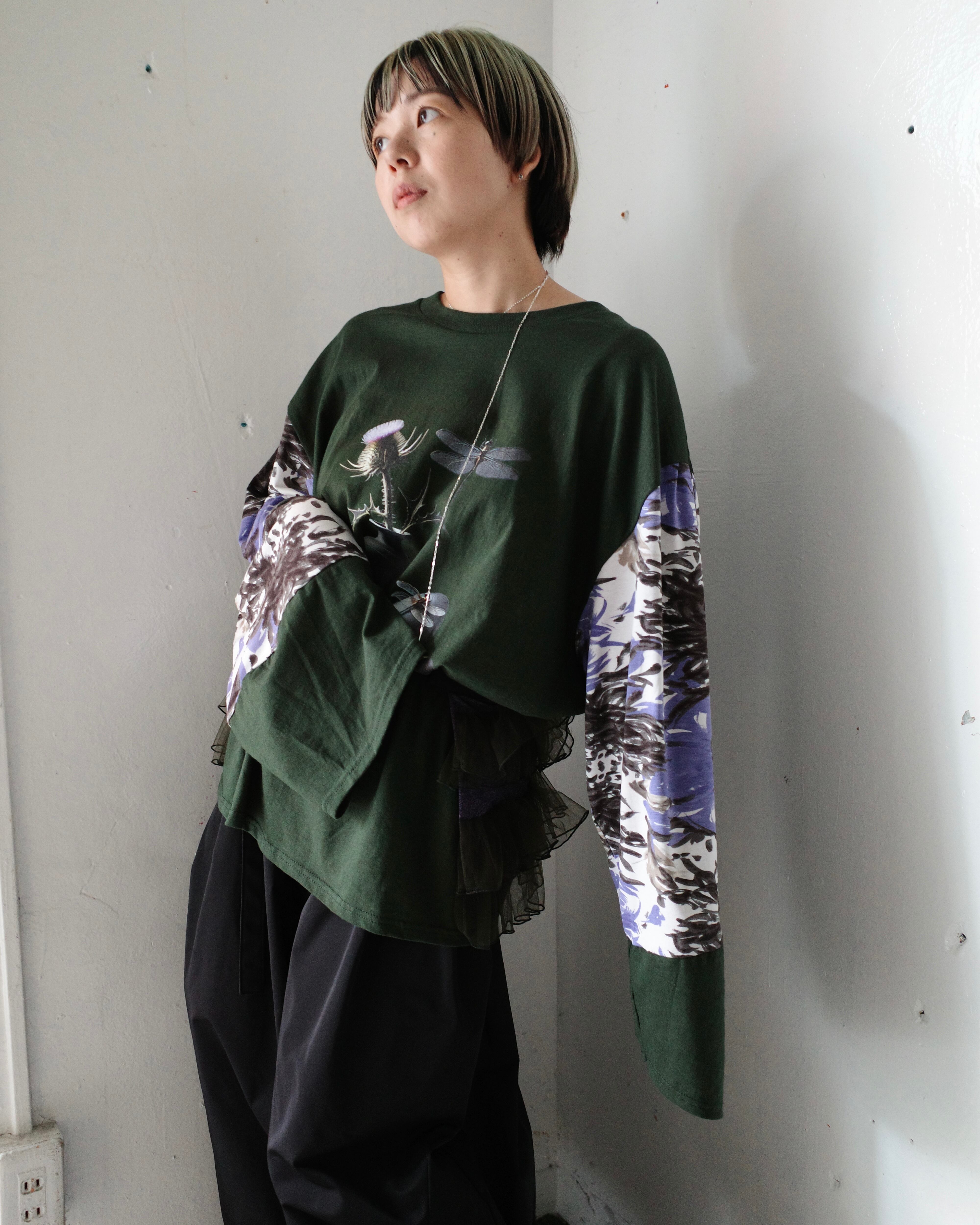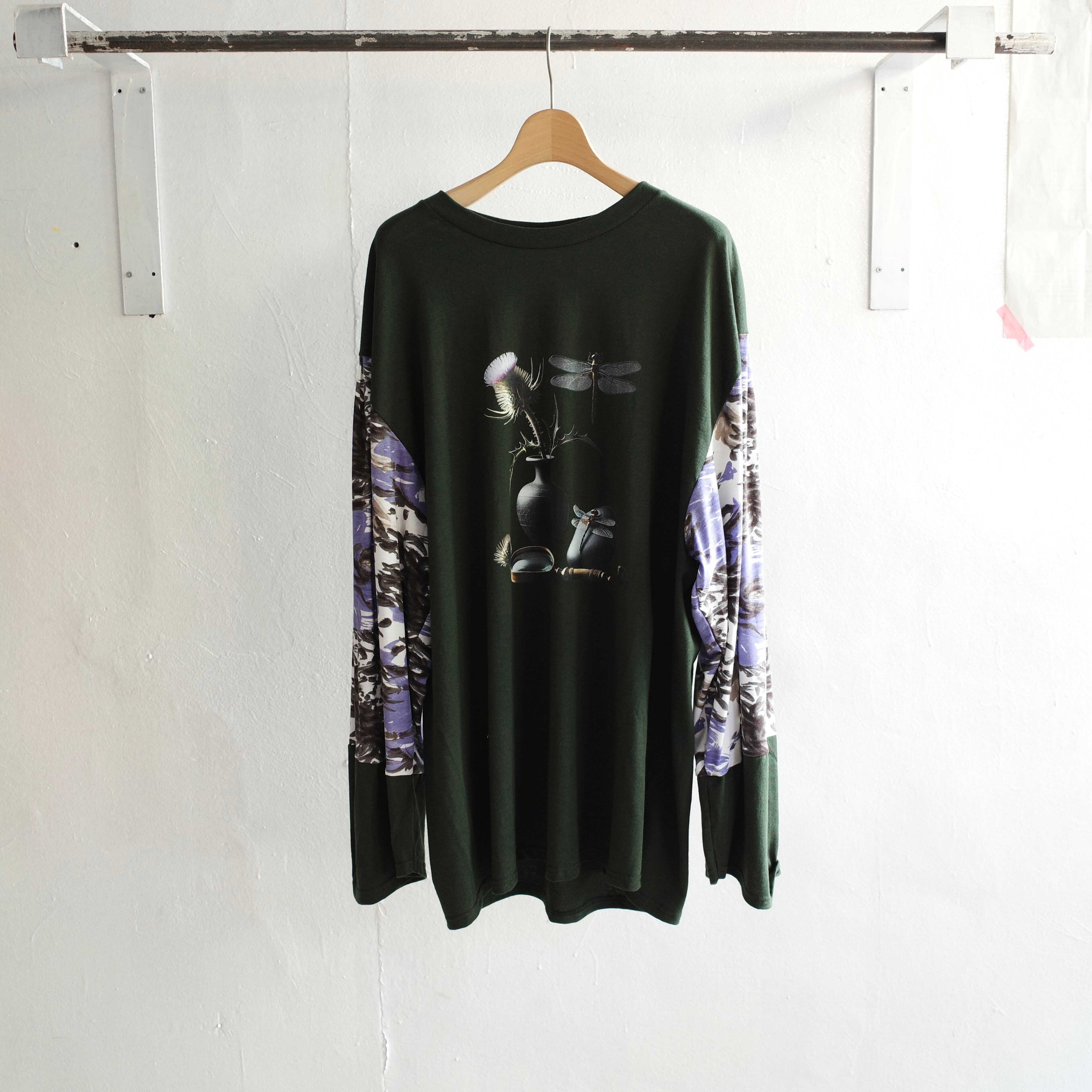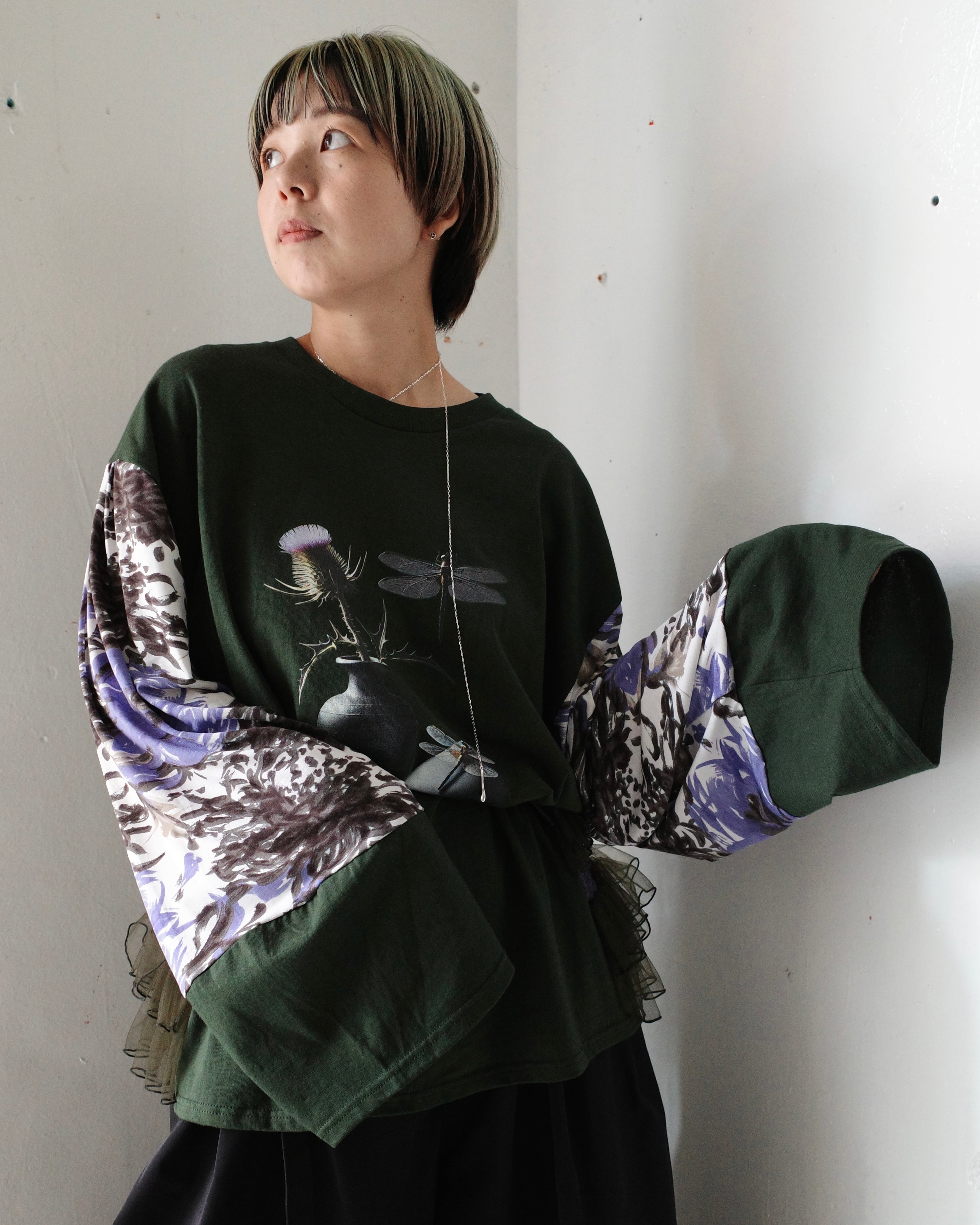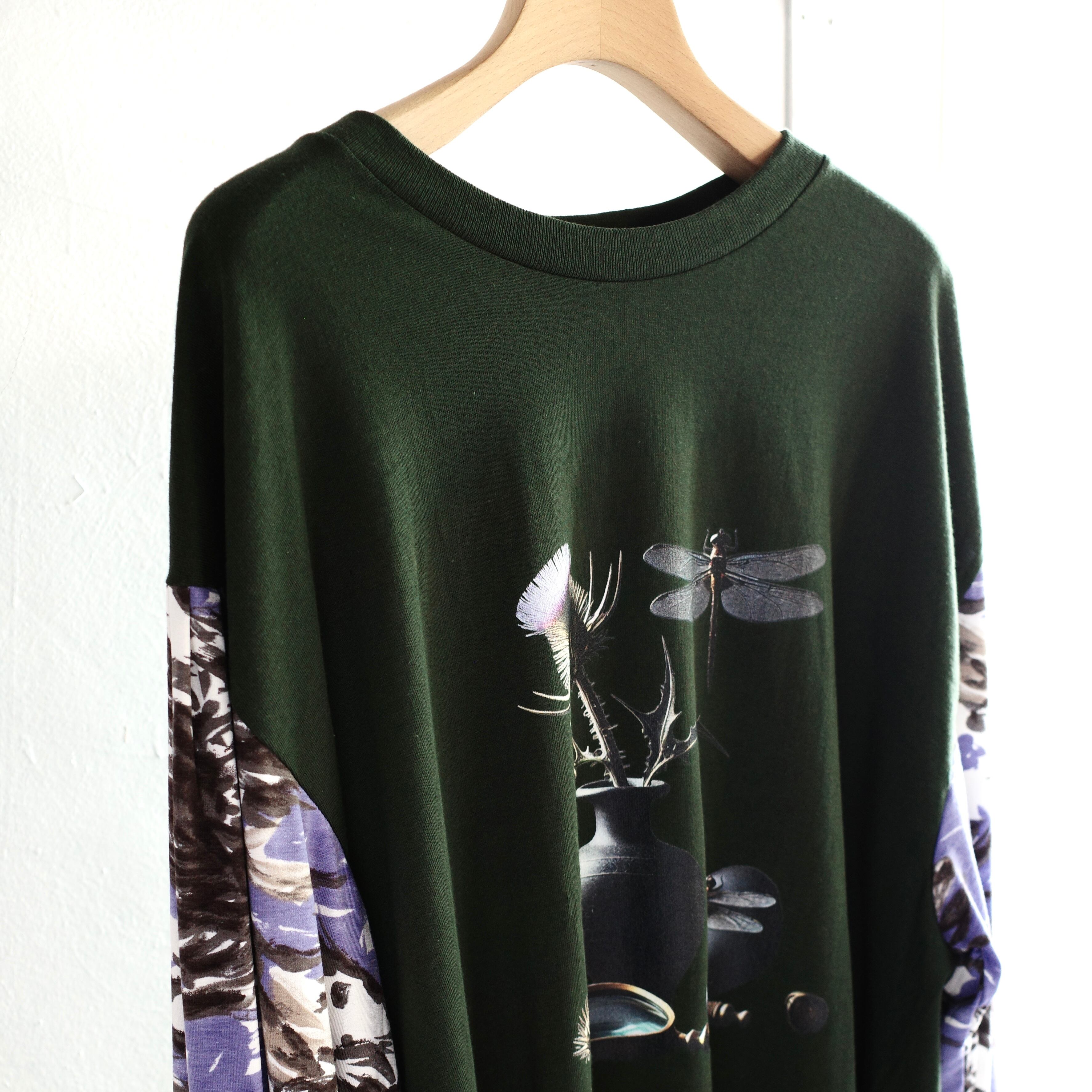 深みのあるダークグリーンをベースに、アーティスティックなプリントが映えるロングスリーブTシャツ。