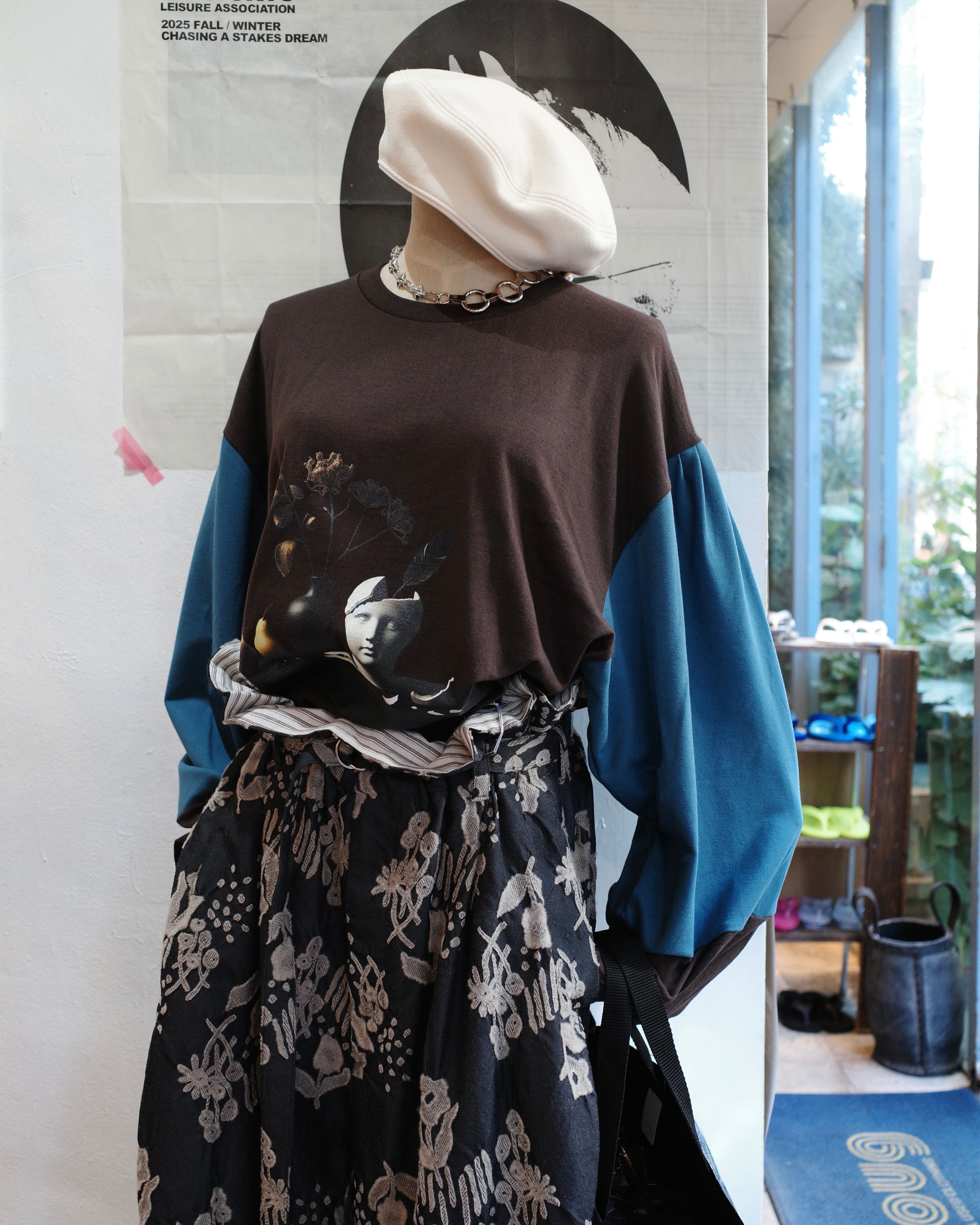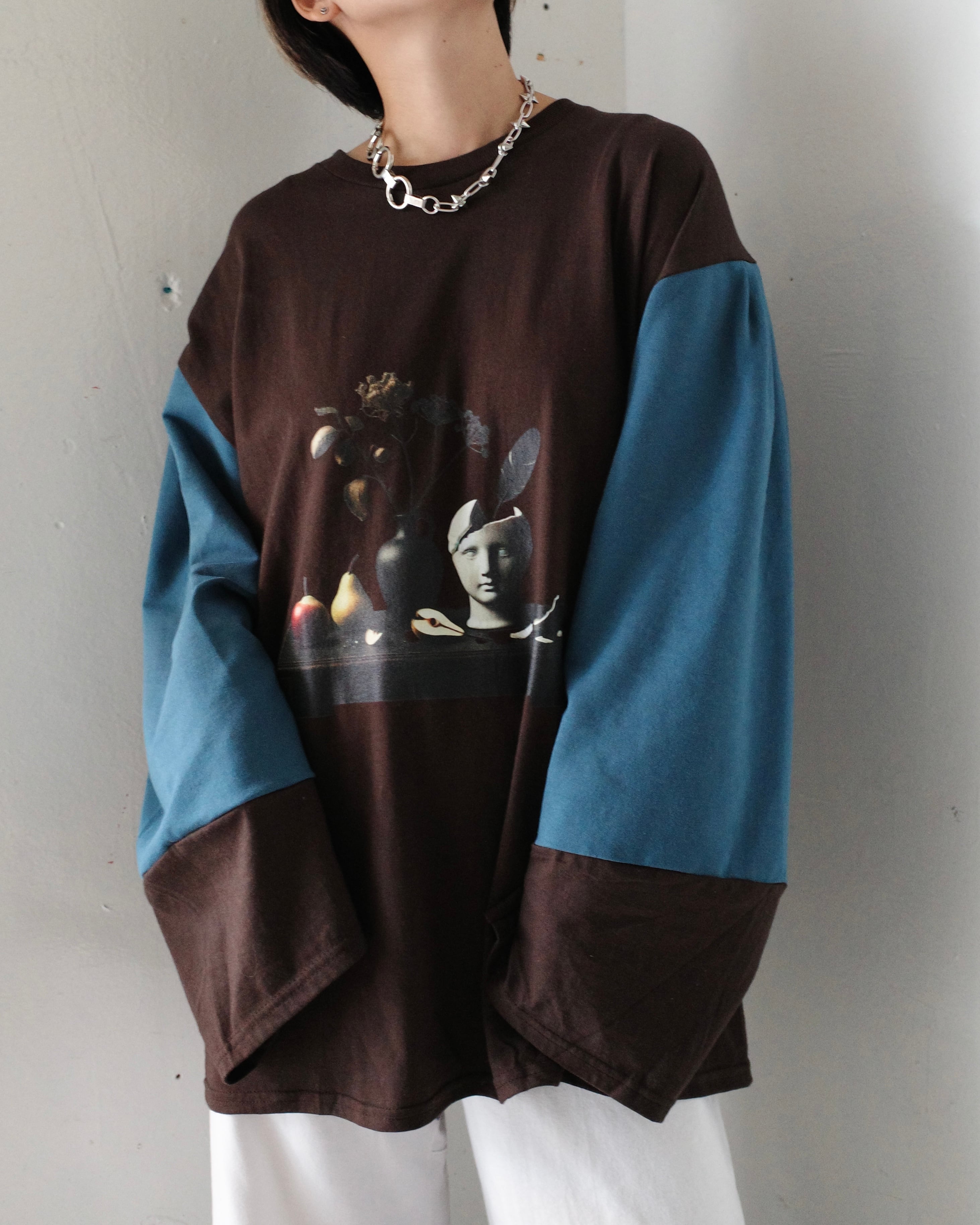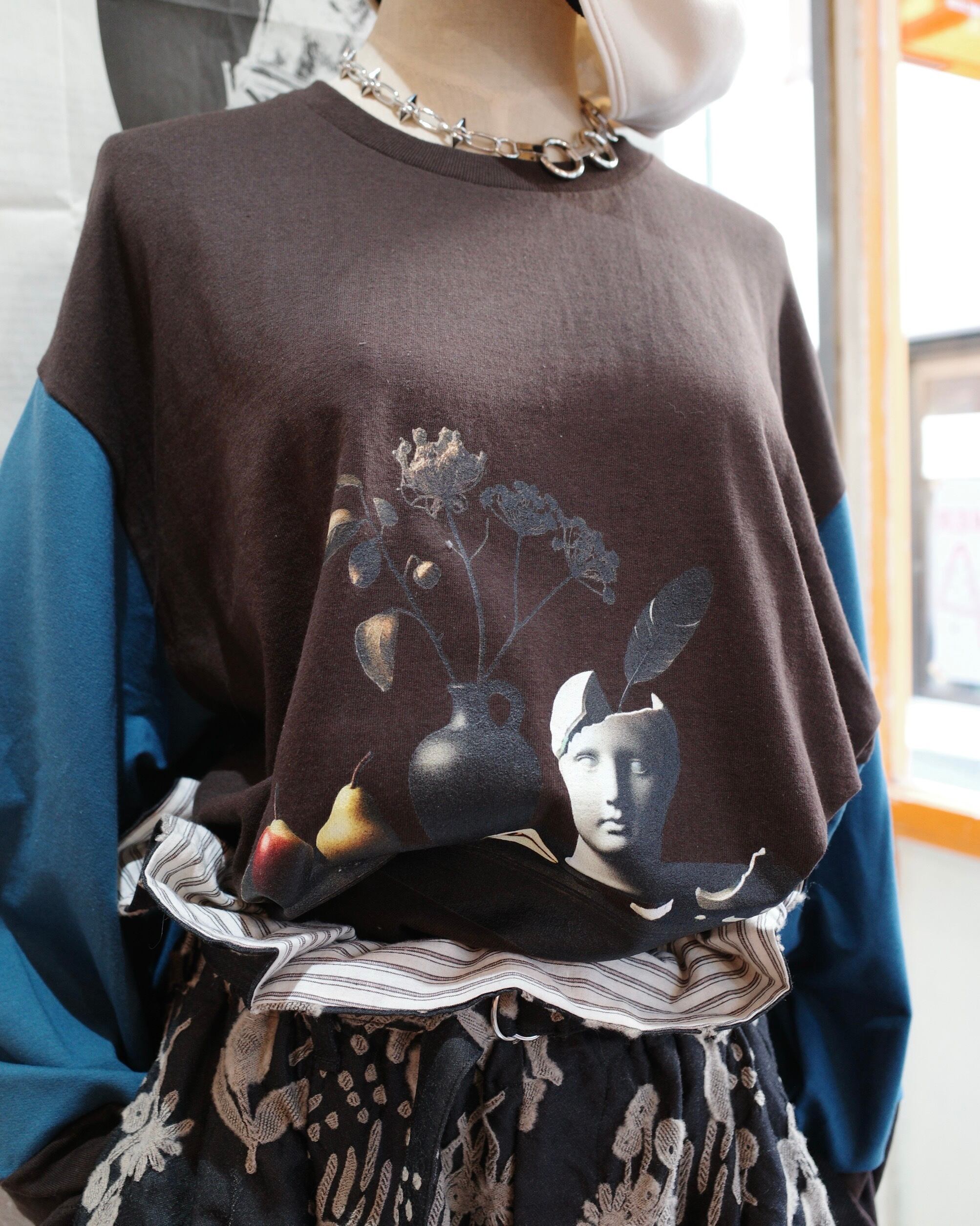 落ち着いたブラウンのボディに、ブルーのスリーブを切り替えた独特の配色が目を引く一枚です。前面には壺やフルーツ、彫刻の断片を描いた静物画風プリントが配され、アートピースのような存在感を放ちます。