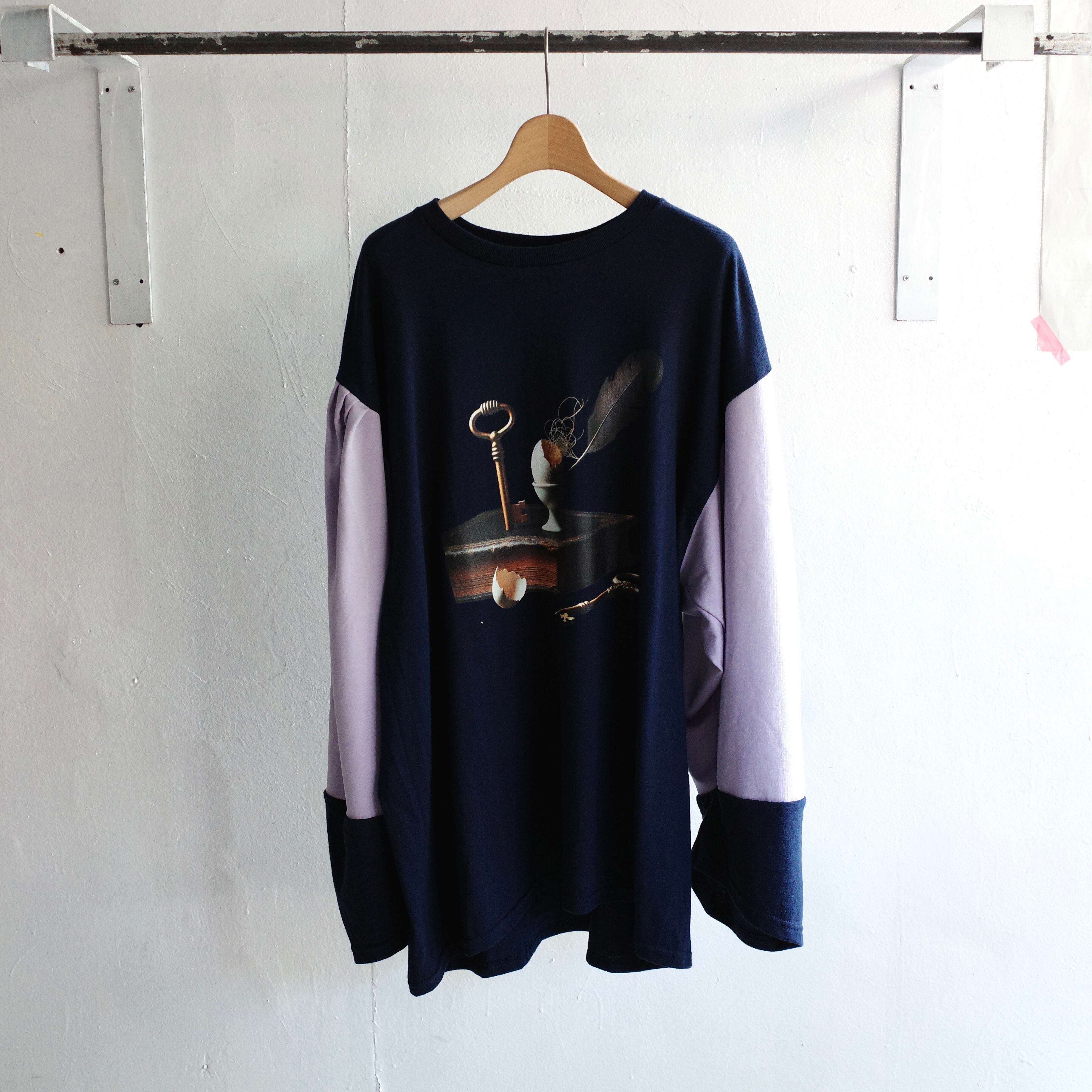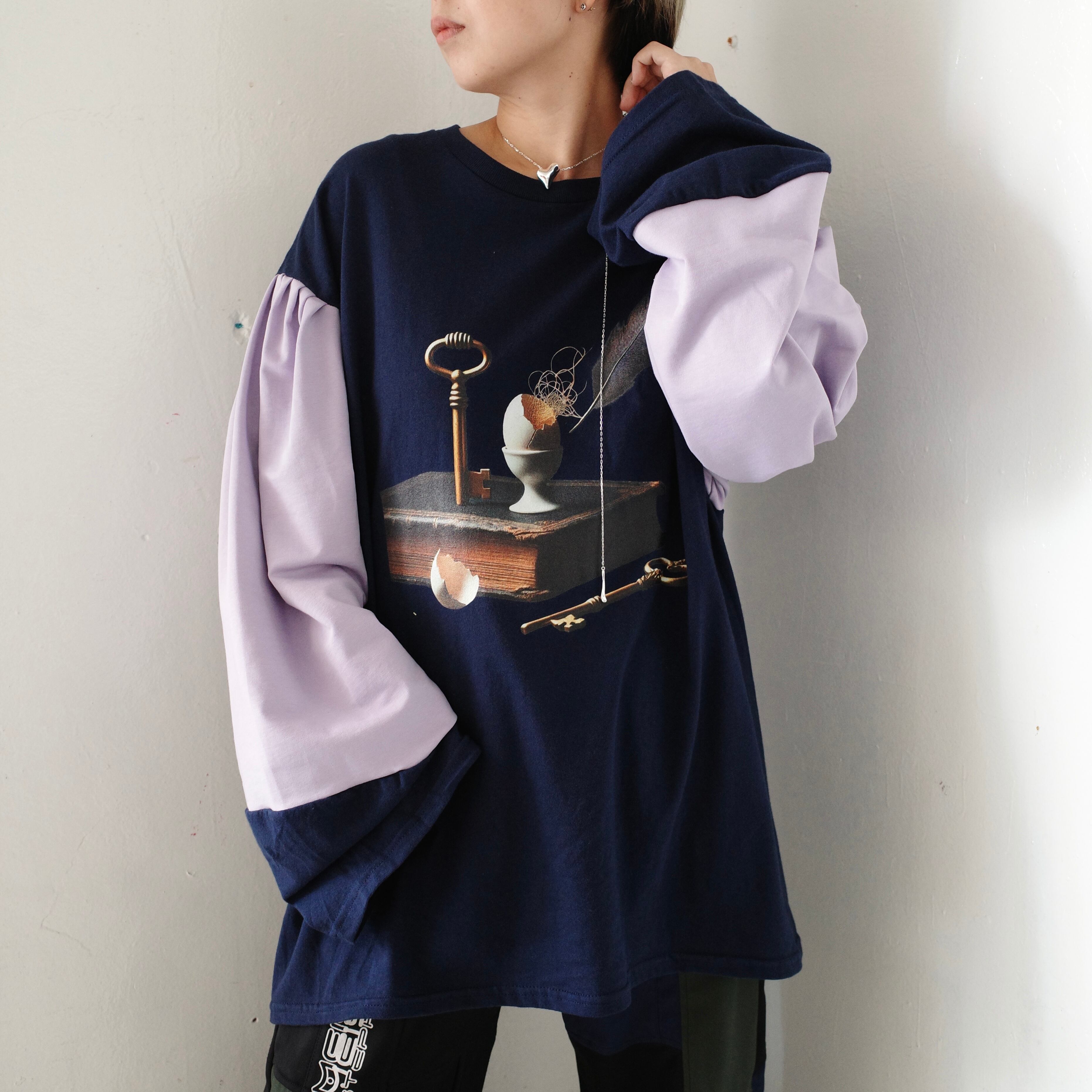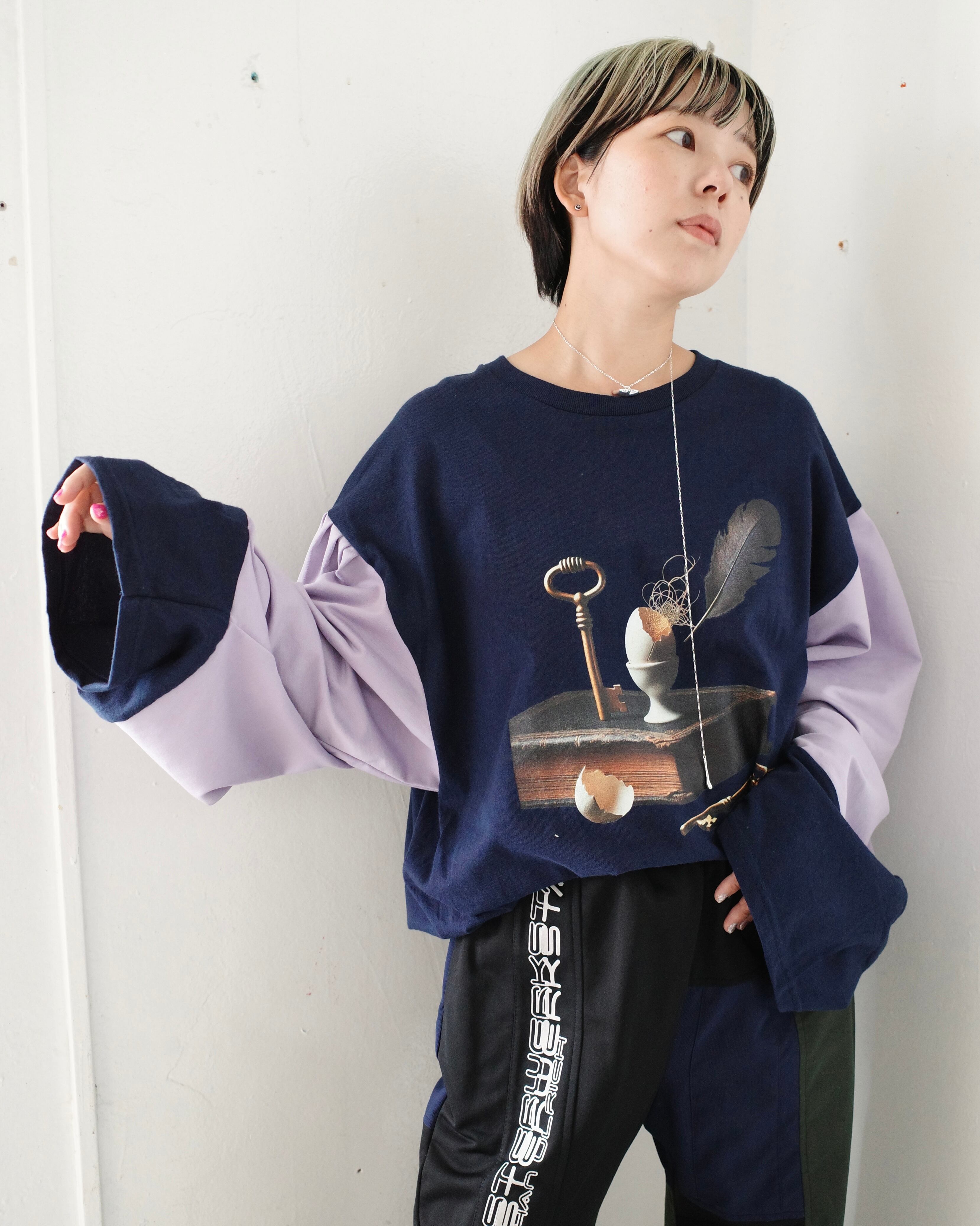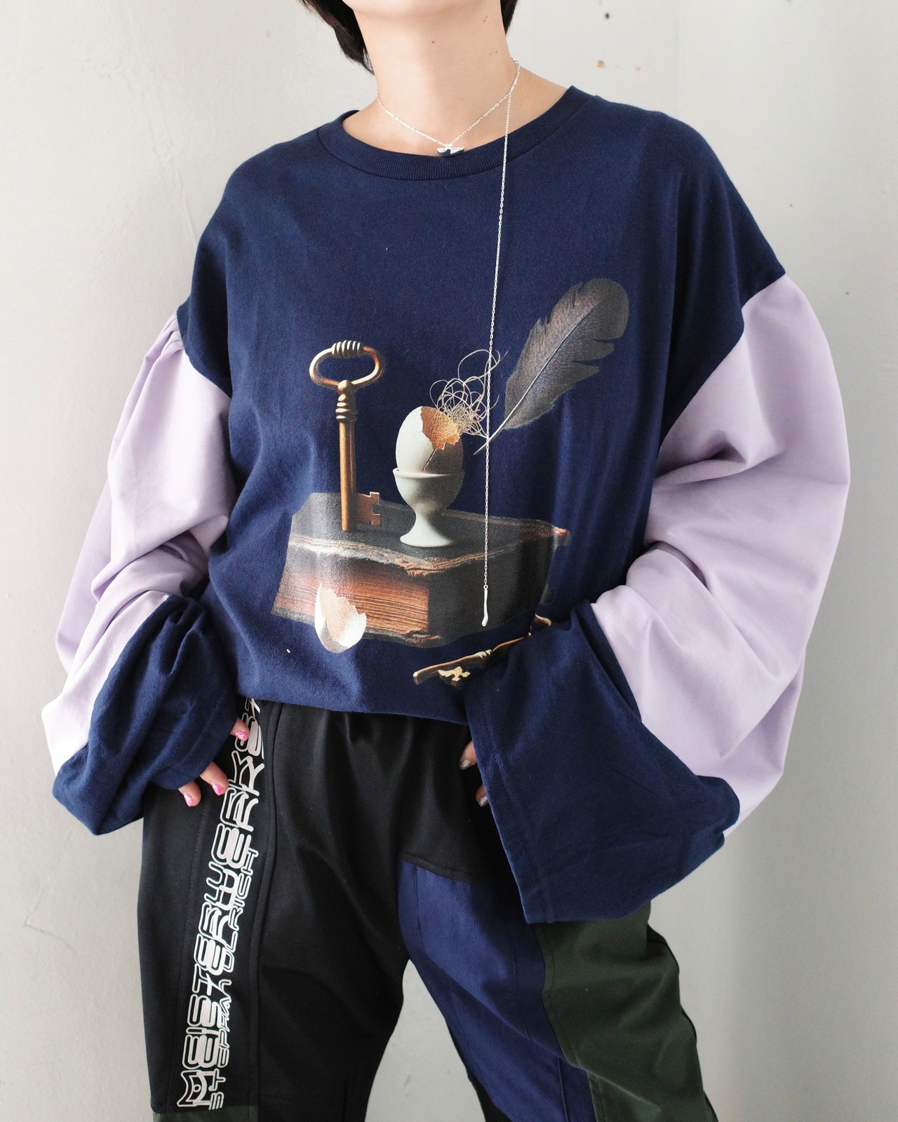 深みのあるネイビーボディに、ラベンダーカラーの切り替えスリーブが映えるデザイン。背面にはアンティークキーや羽根、本、卵殻を組み合わせた幻想的なプリントが施され、どこかシュルレアリスムを感じさせるアートワークに仕上がっています。