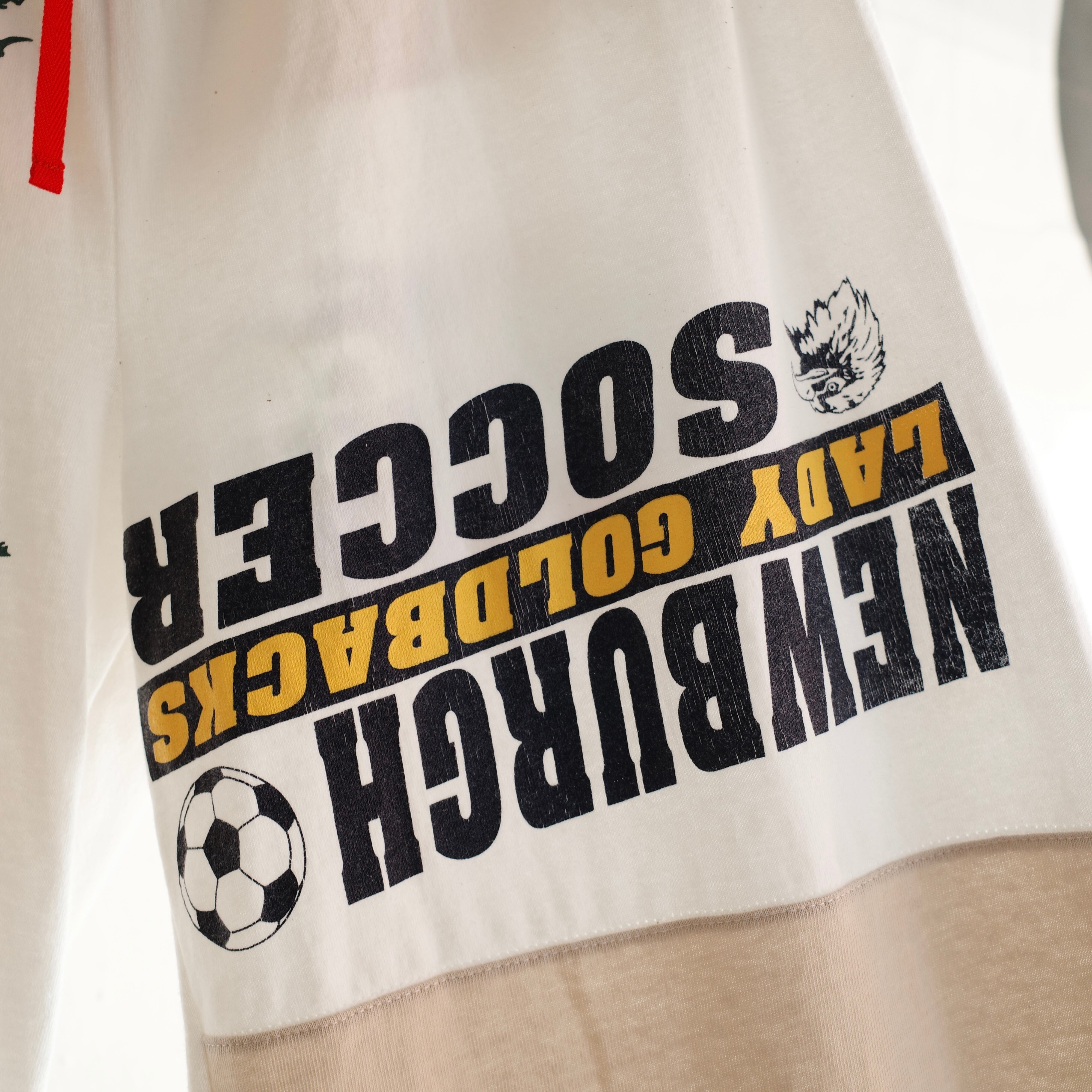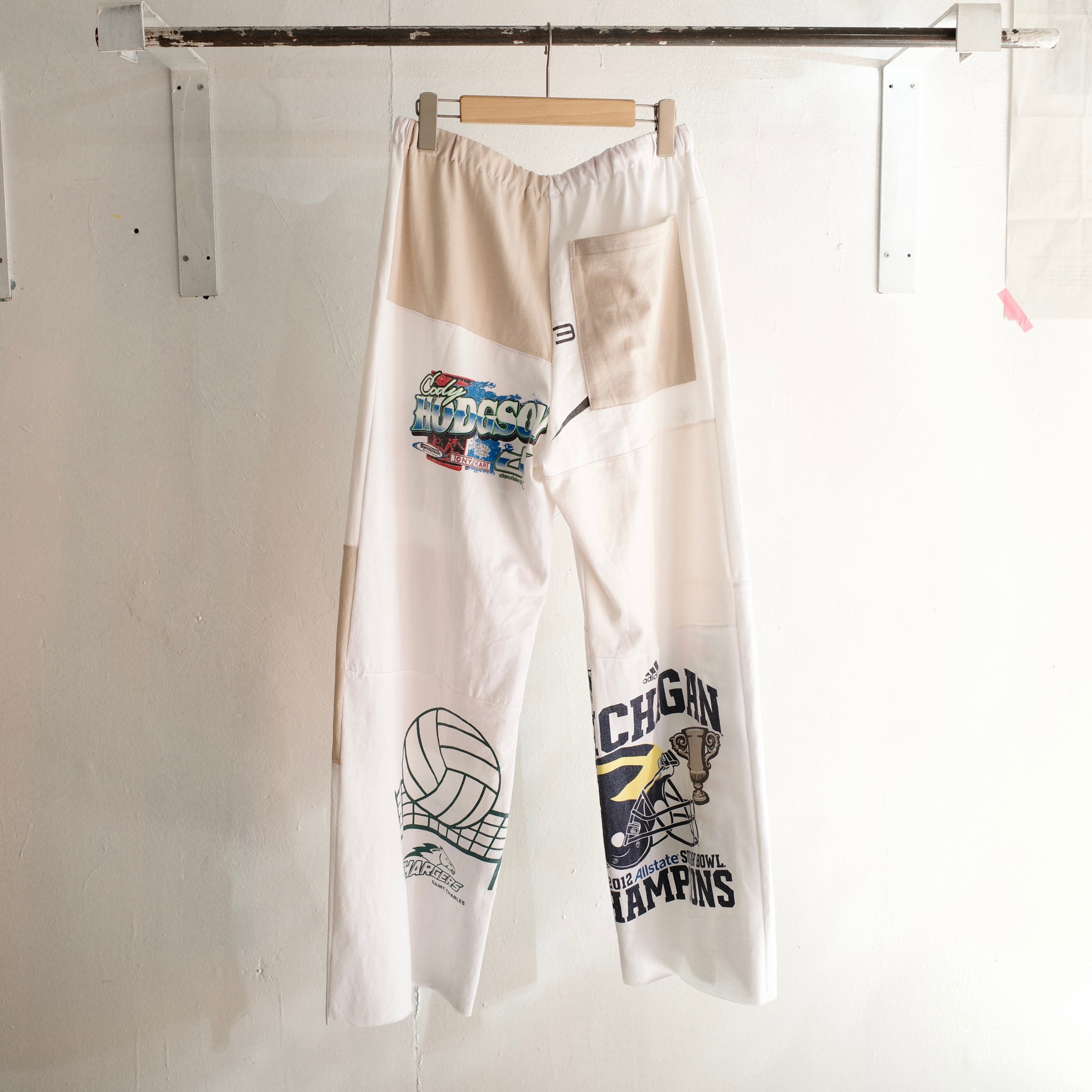 スポーツチームやキャンプ、レースイベントなど様々なユーズドTシャツを解体・再構築して仕立てた、当店オリジナルのリメイクパンツ。