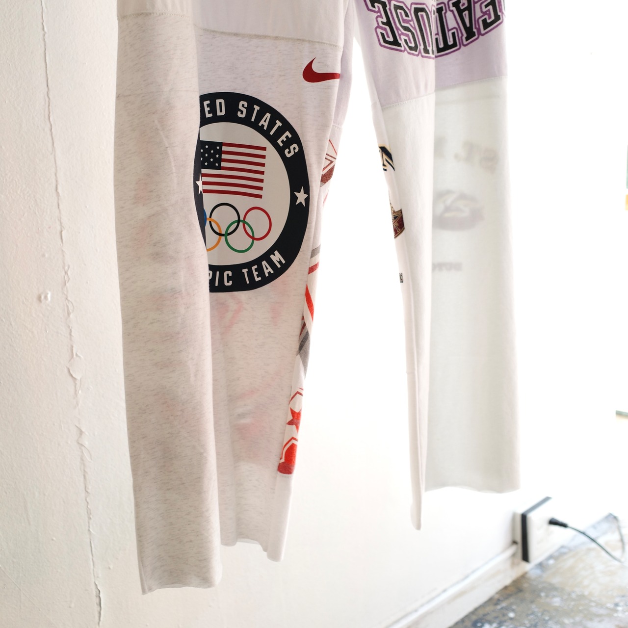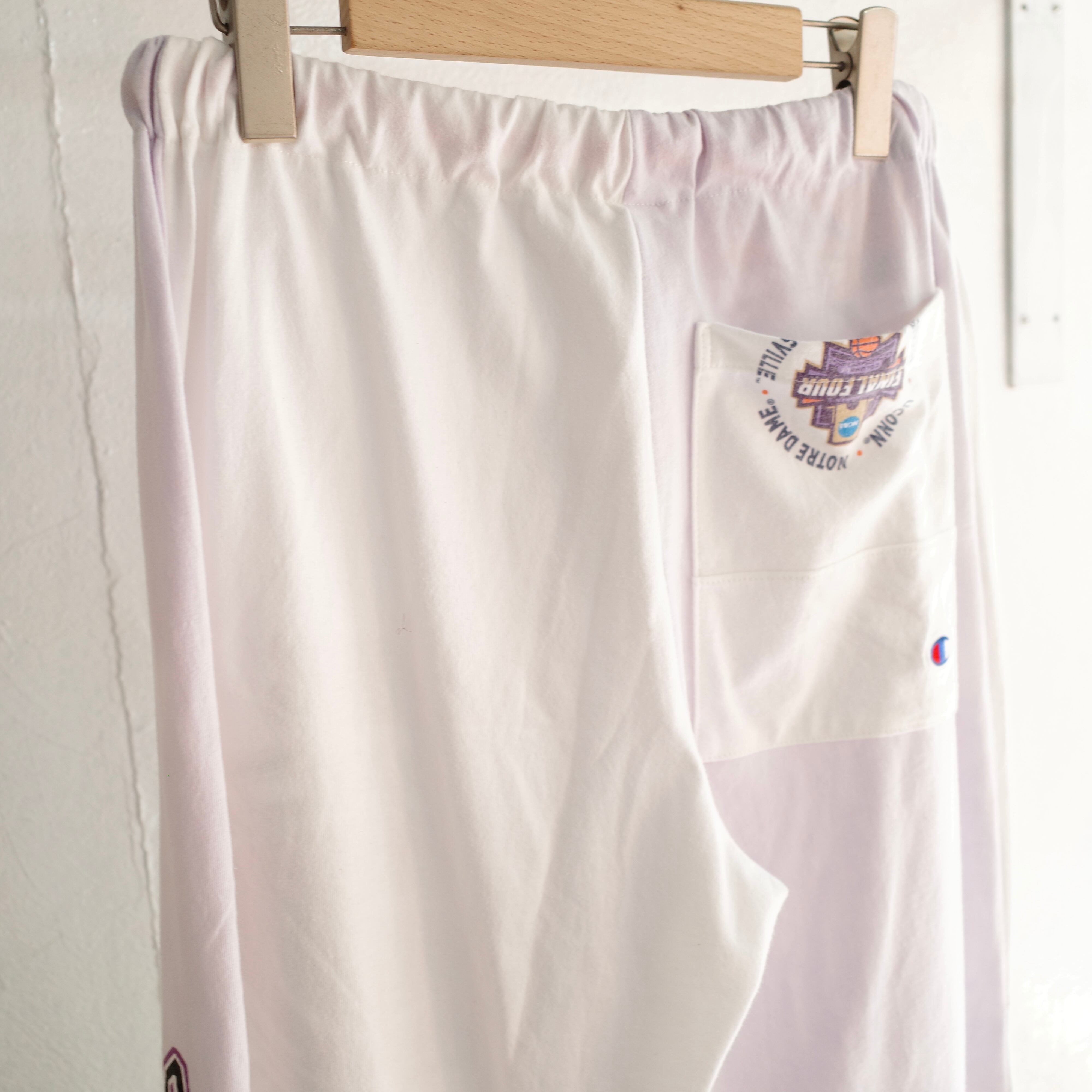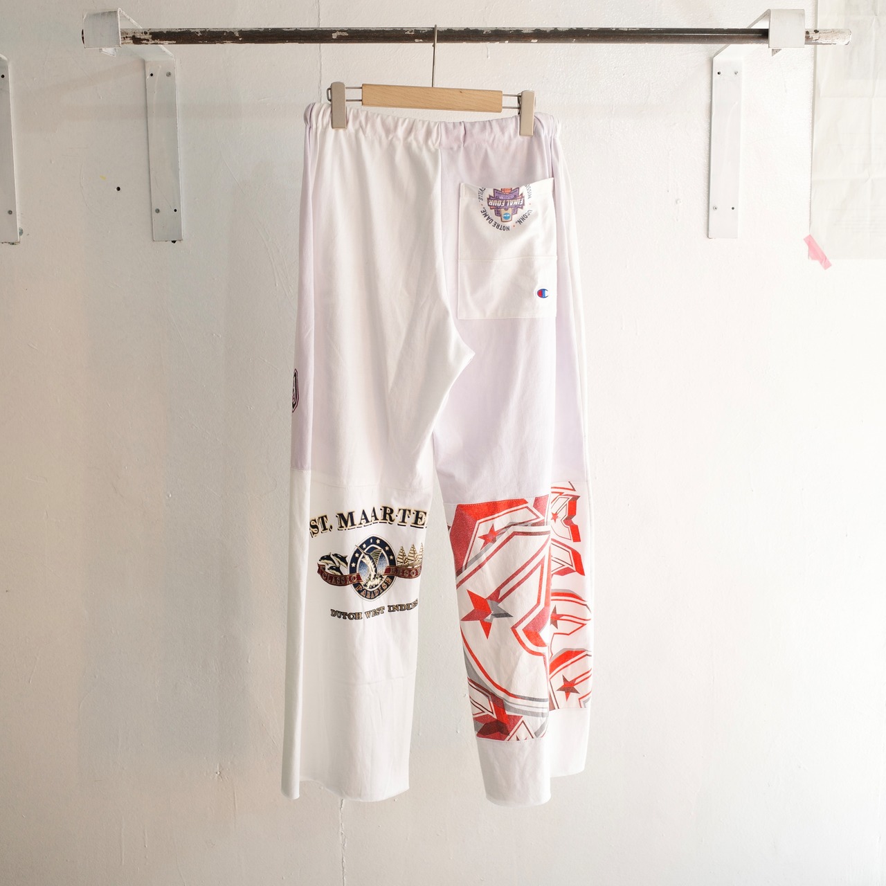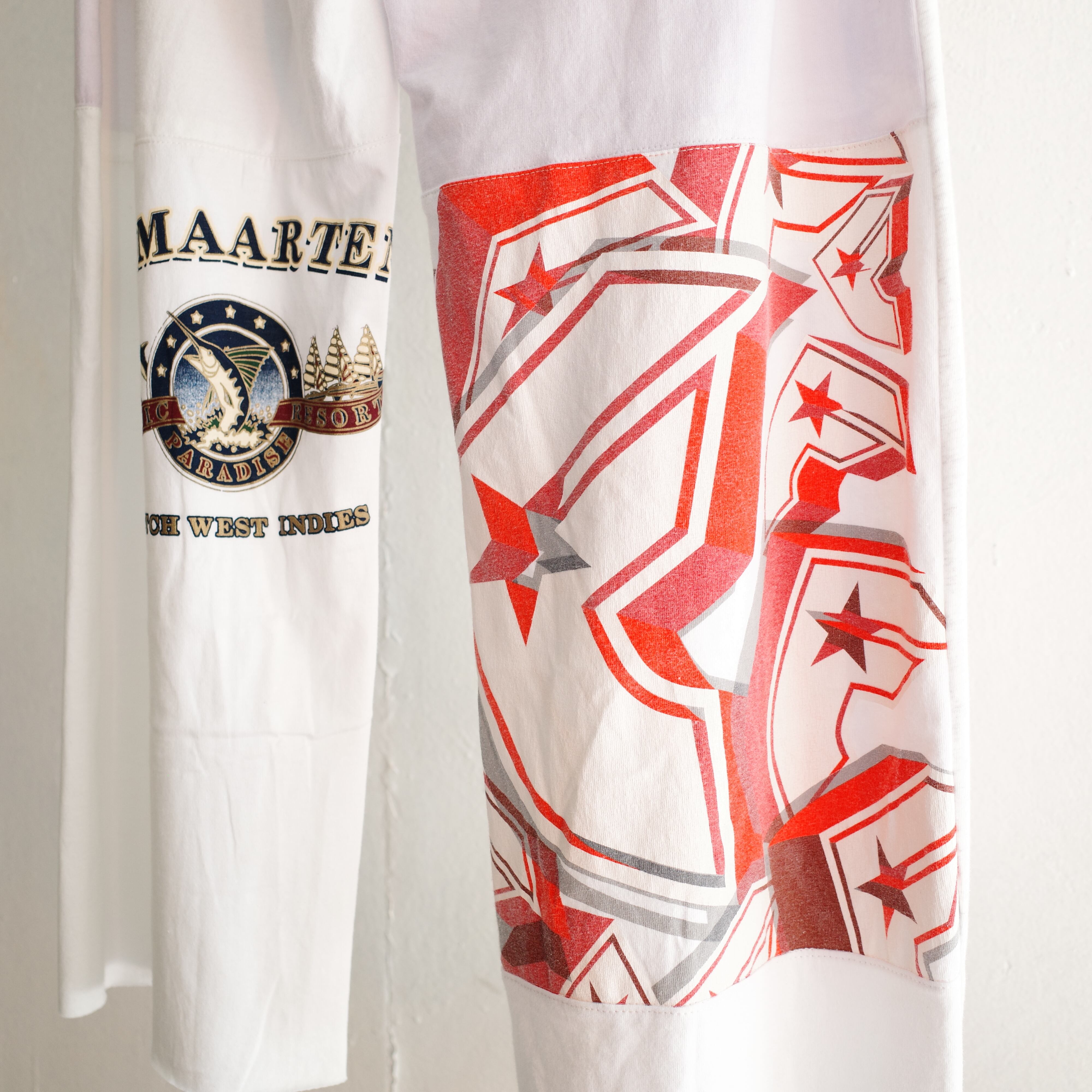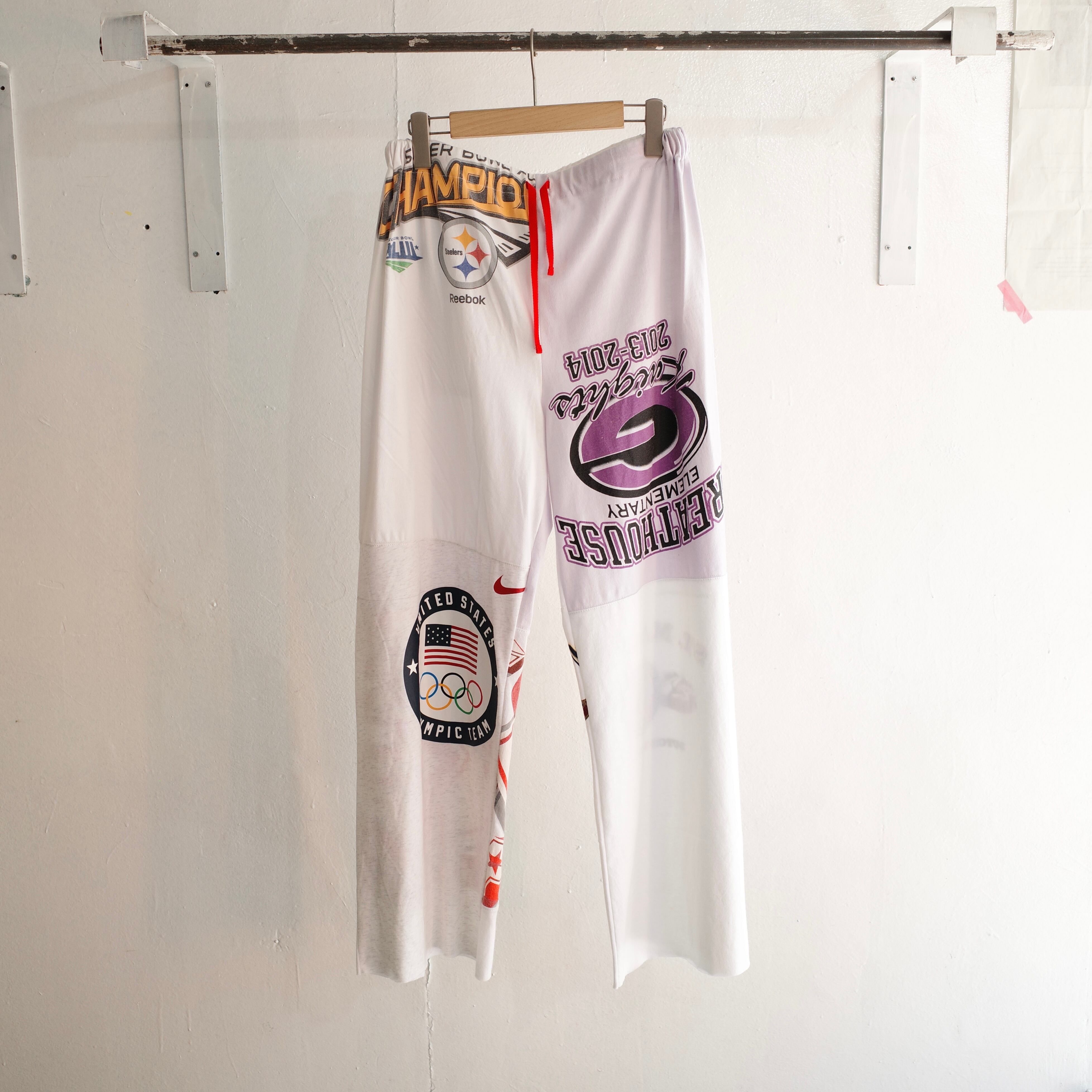 スポーツチームやキャンプ、レースイベントなど様々なユーズドTシャツを解体・再構築して仕立てた、当店オリジナルのリメイクパンツ。
