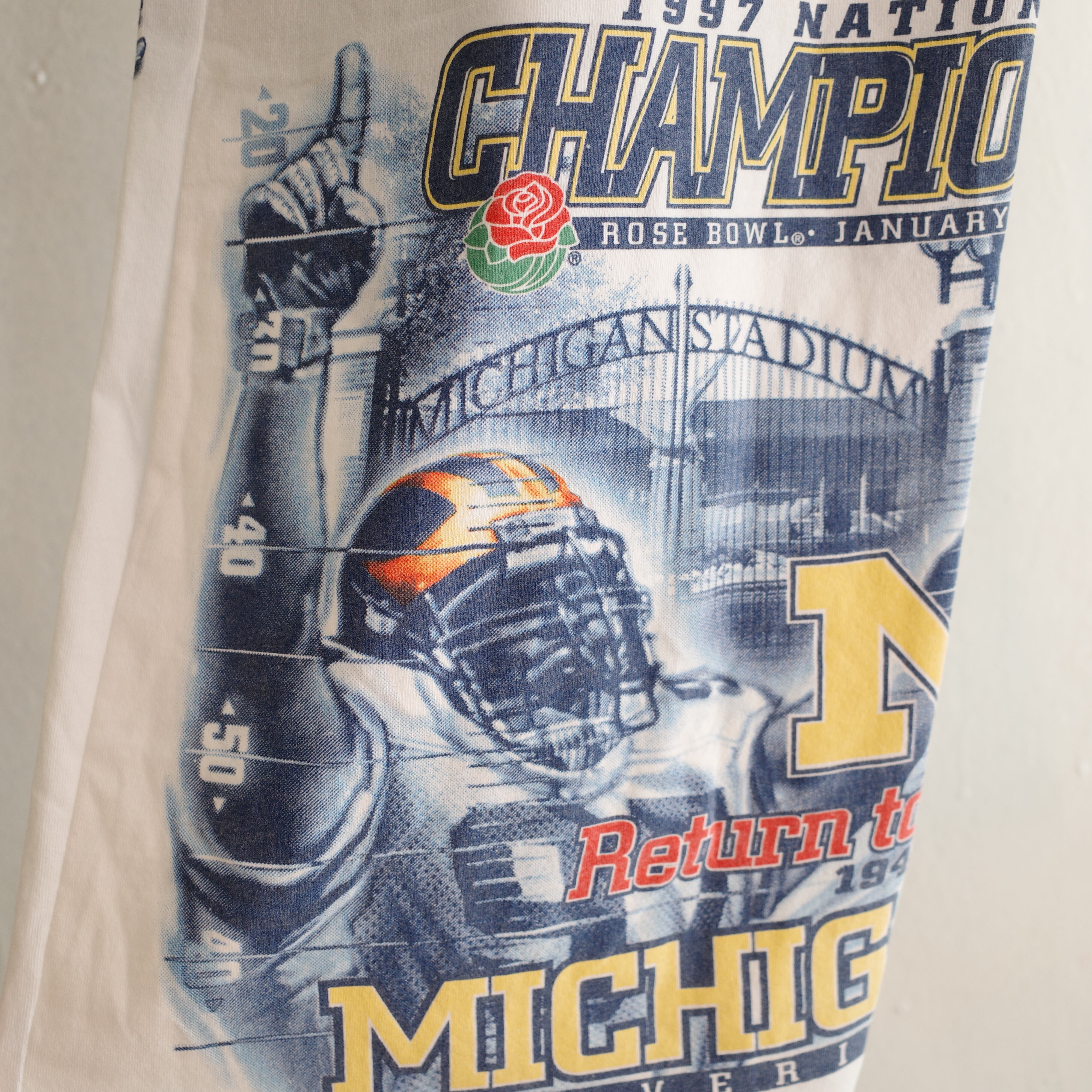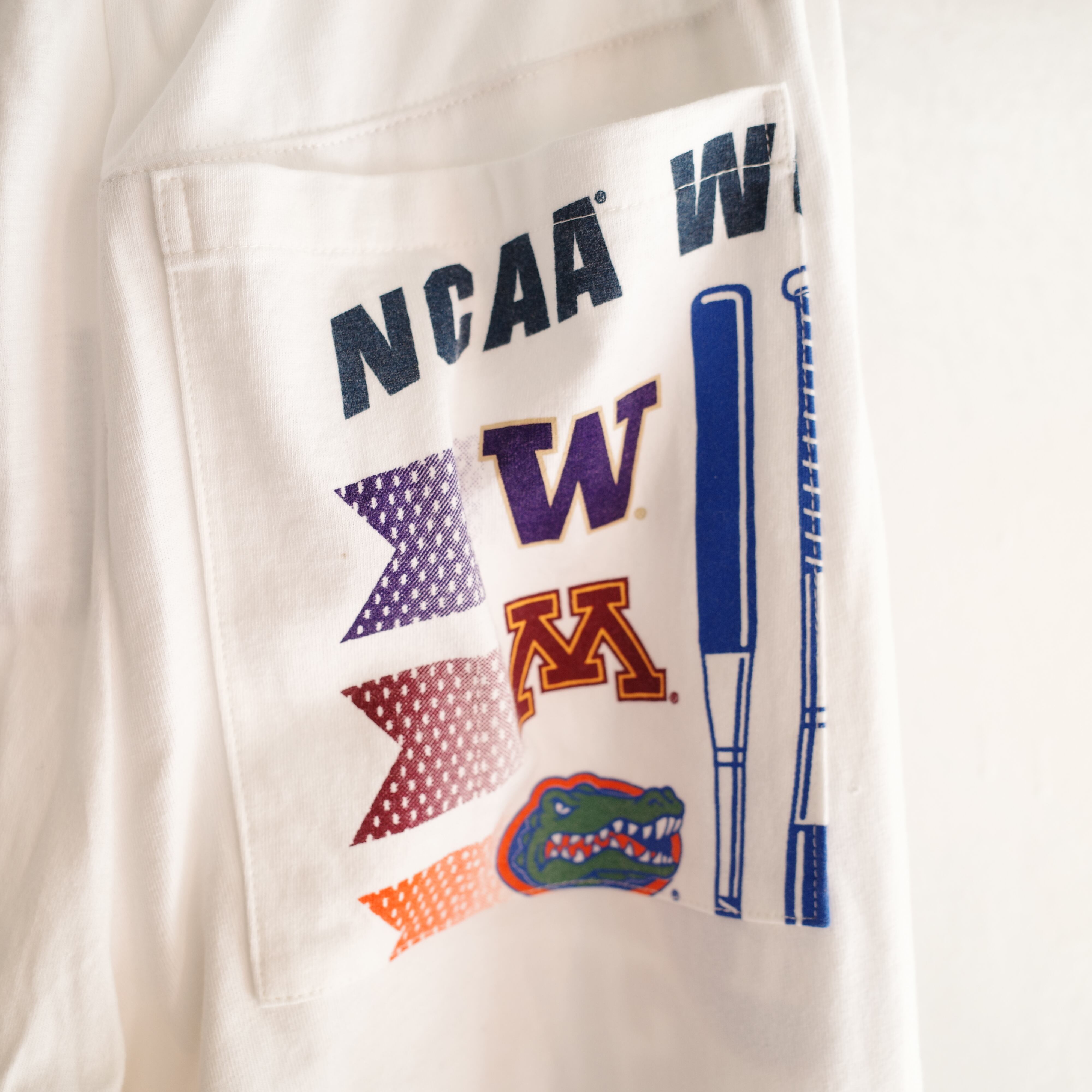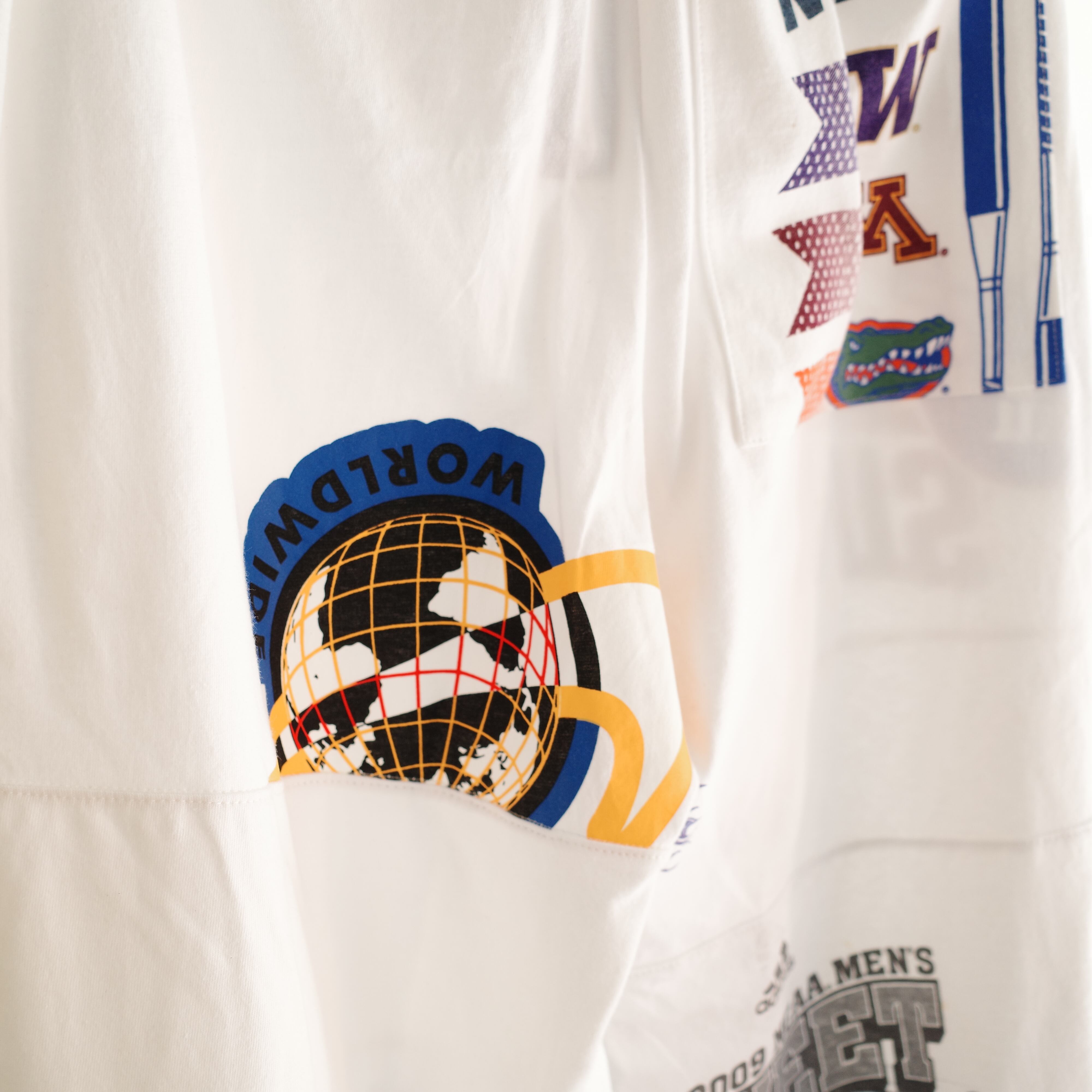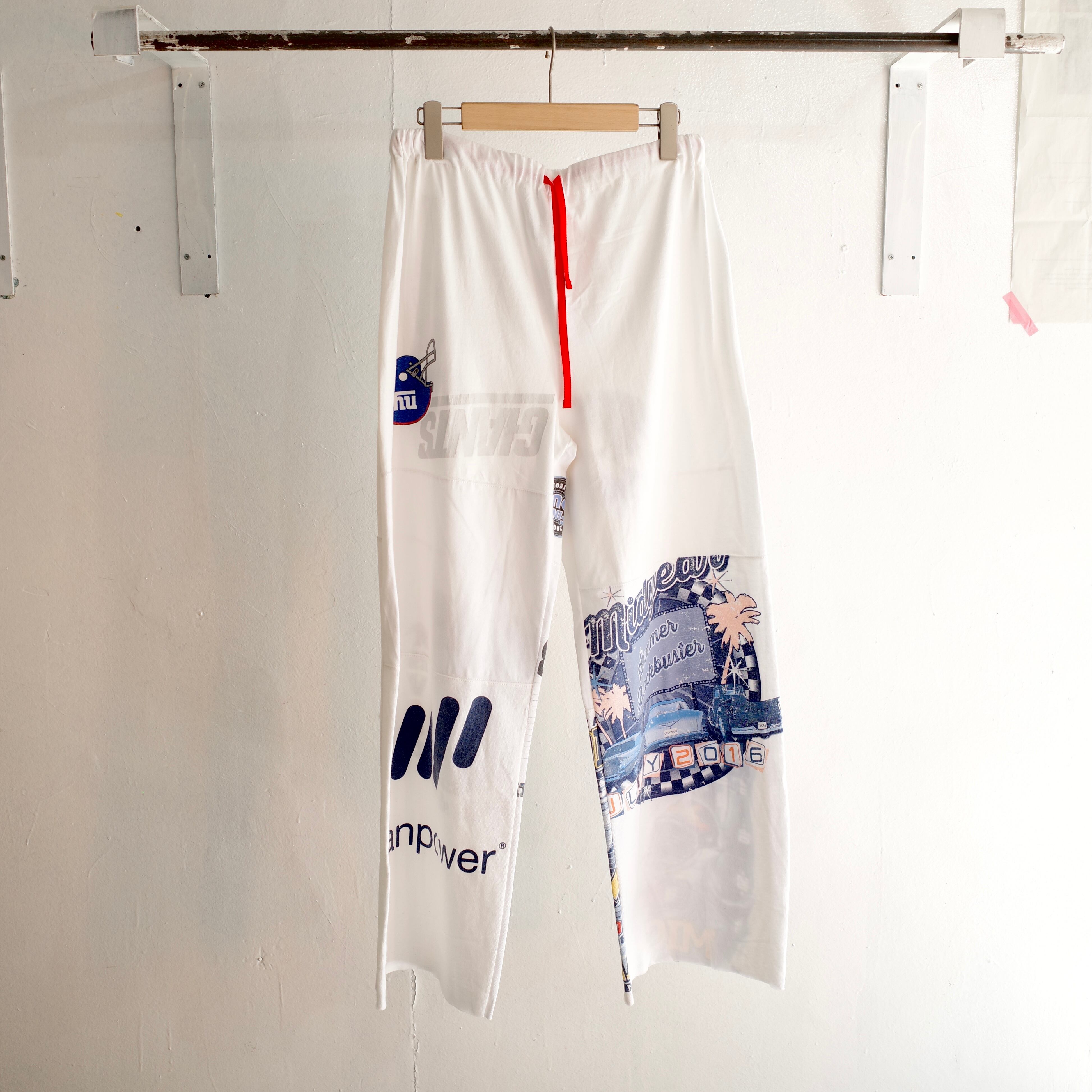 スポーツチームやキャンプ、レースイベントなど様々なユーズドTシャツを解体・再構築して仕立てた、当店オリジナルのリメイクパンツ。
