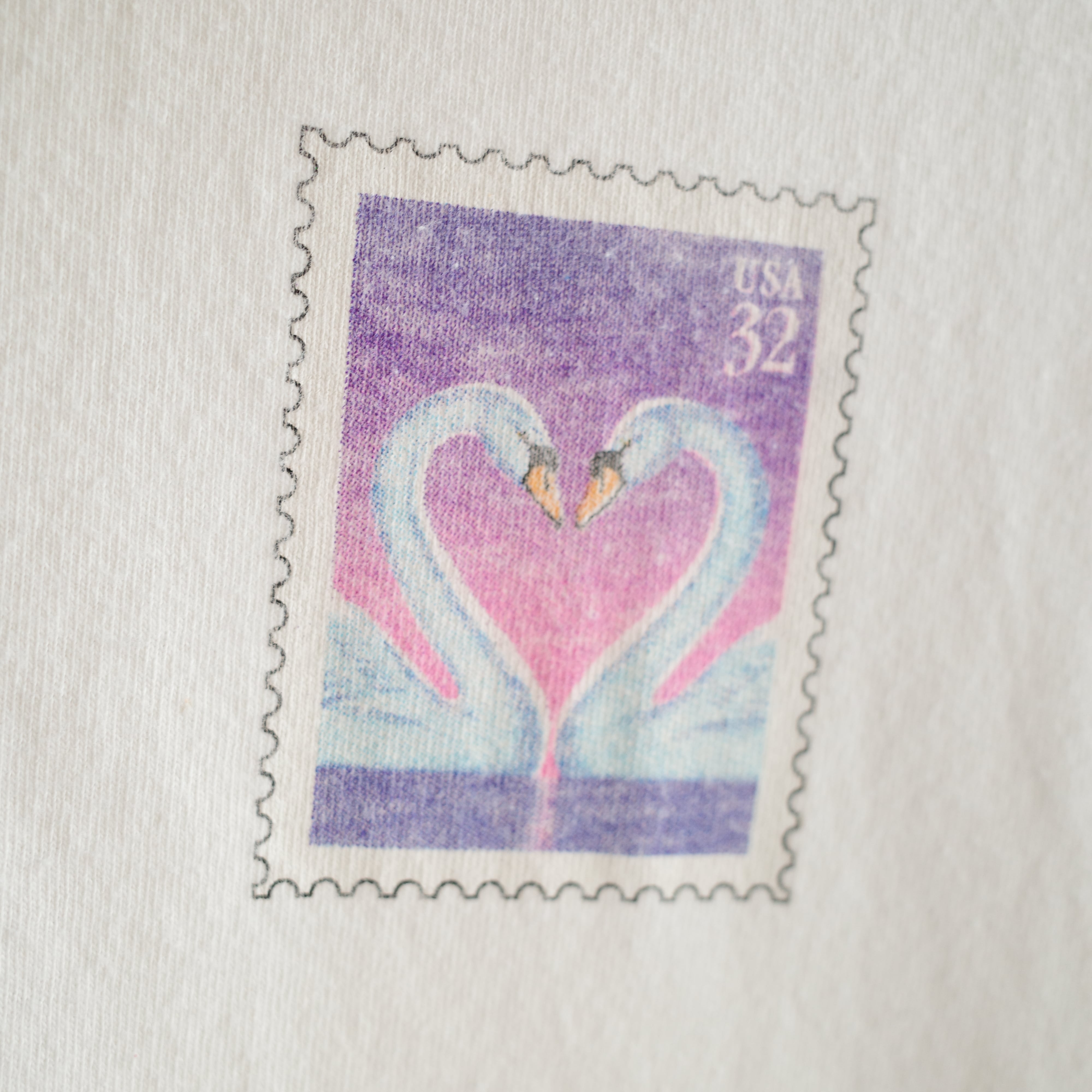 フロントには大きく寄り添うスワンのグラフィック、バックにはUSA 32¢切手モチーフのプリントが施されており、細部までユニークな1枚。