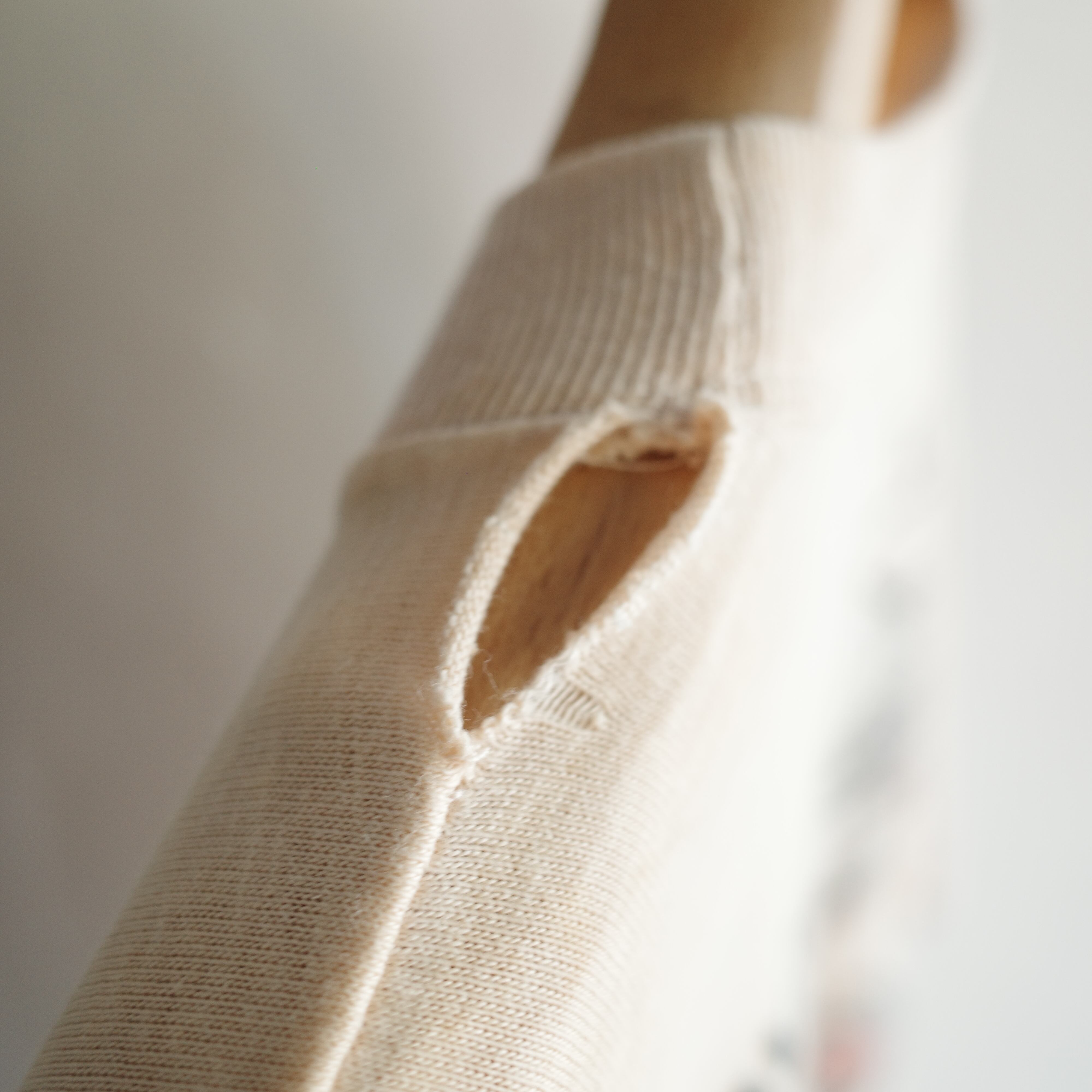 袖口リブや全体に古着らしいフェード感・ダメージ(肩部分の破れなど)があり、リアルな雰囲気を楽しめる一枚です。