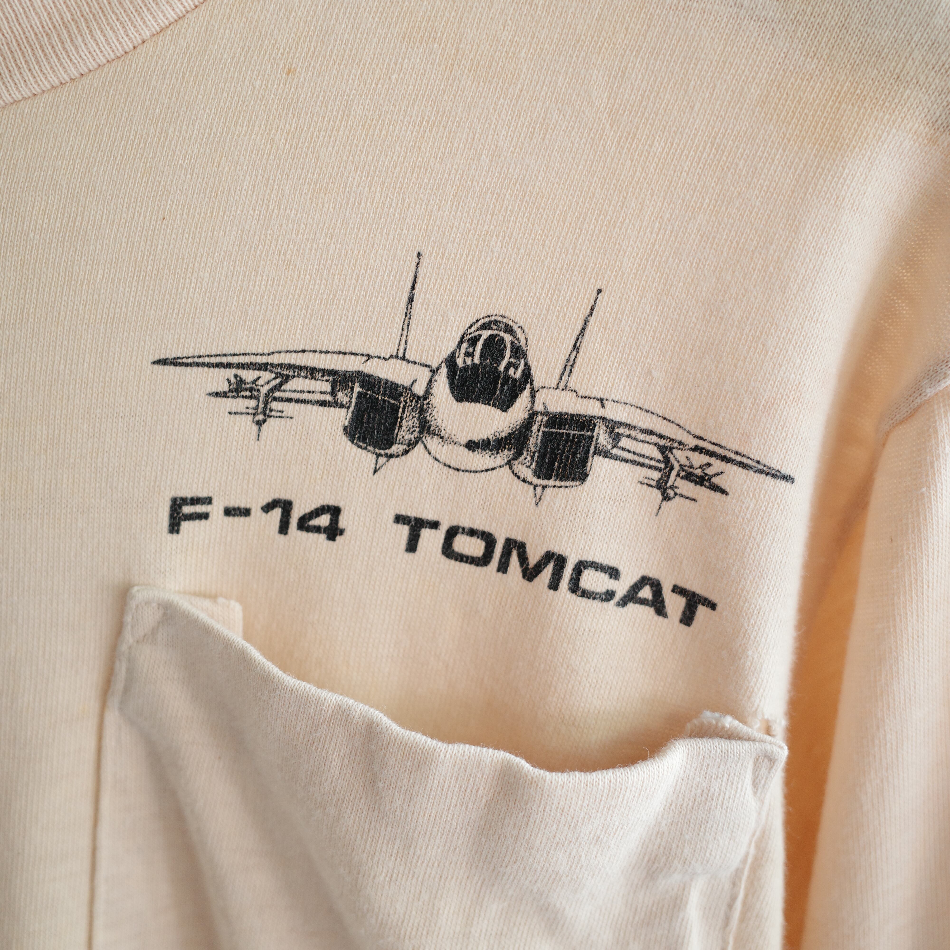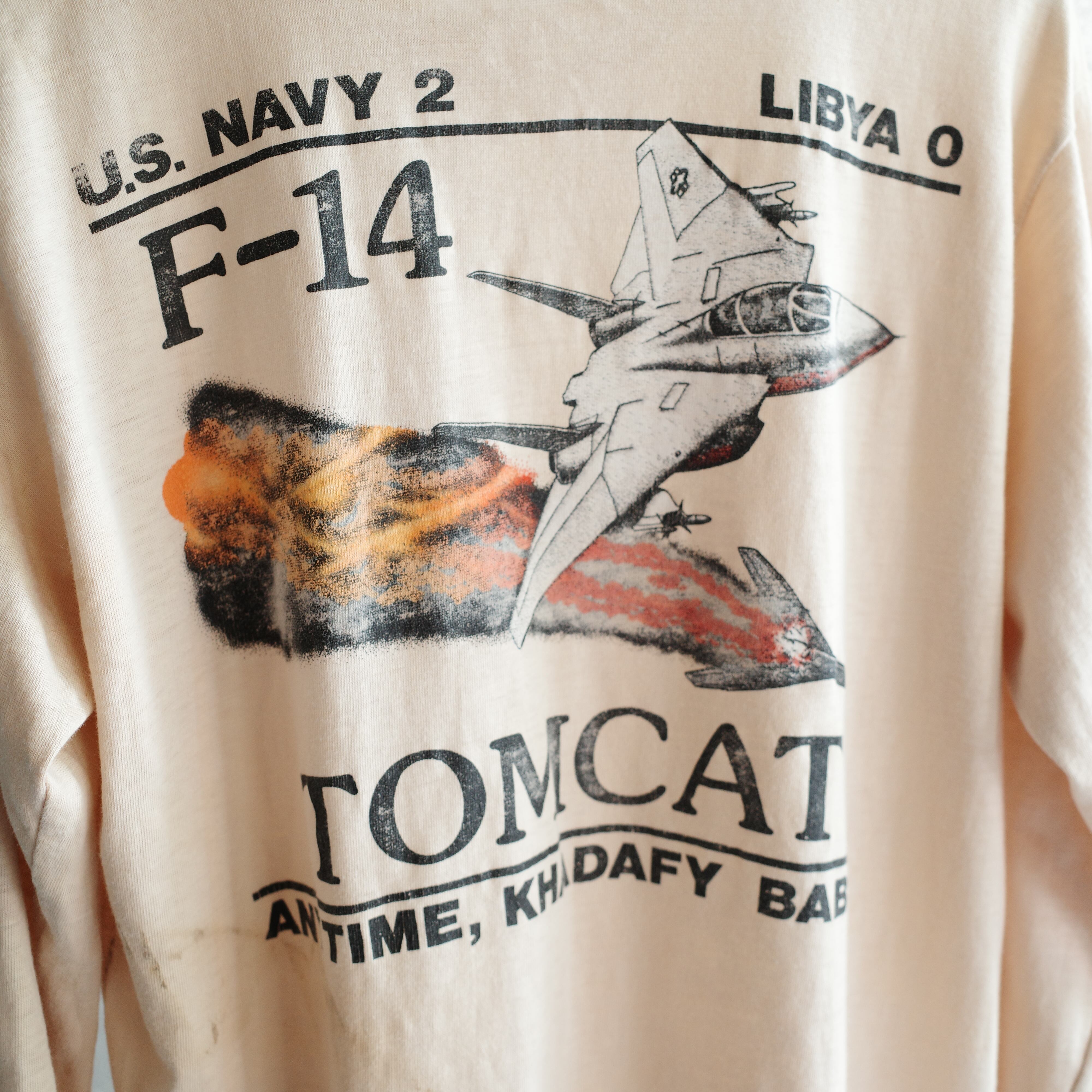 フロントの胸ポケット上には戦闘機F-14のプリント、バックには「U.S. NAVY 2 – LIBYA 0」というスコアを掲げ、炎を上げながら飛ぶF-14の迫力あるグラフィックが施されています。