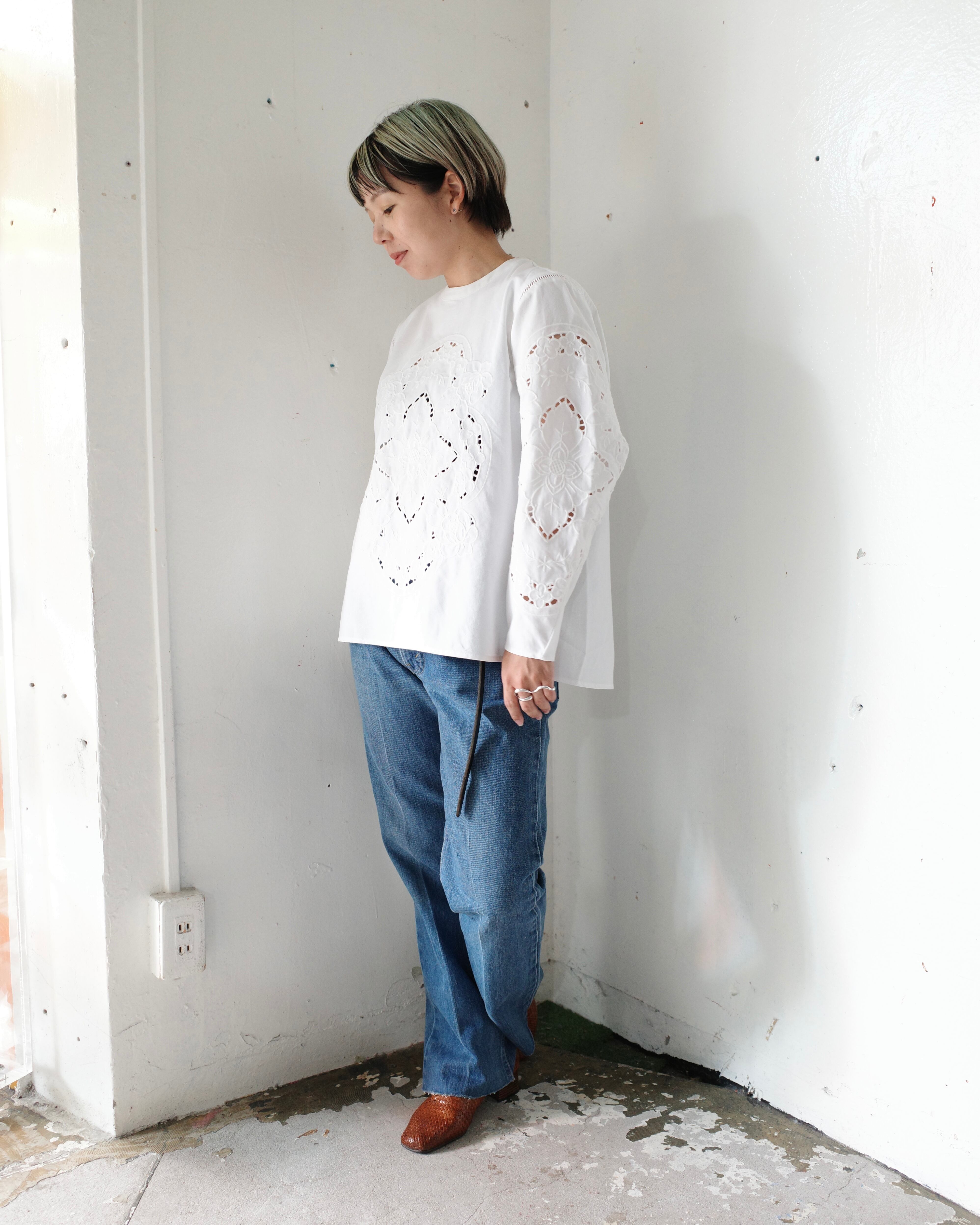 フロントからスリーブにかけて施された繊細なフラワーモチーフのカットワークが印象的で、立体感のある刺繍がエレガントな雰囲気を演出しています。肩や袖に透け感のあるディテールを取り入れ、軽やかさをプラス。バックにはシンプルなボタン留めを配置し、すっきりとしたシルエットで着用できます。