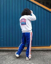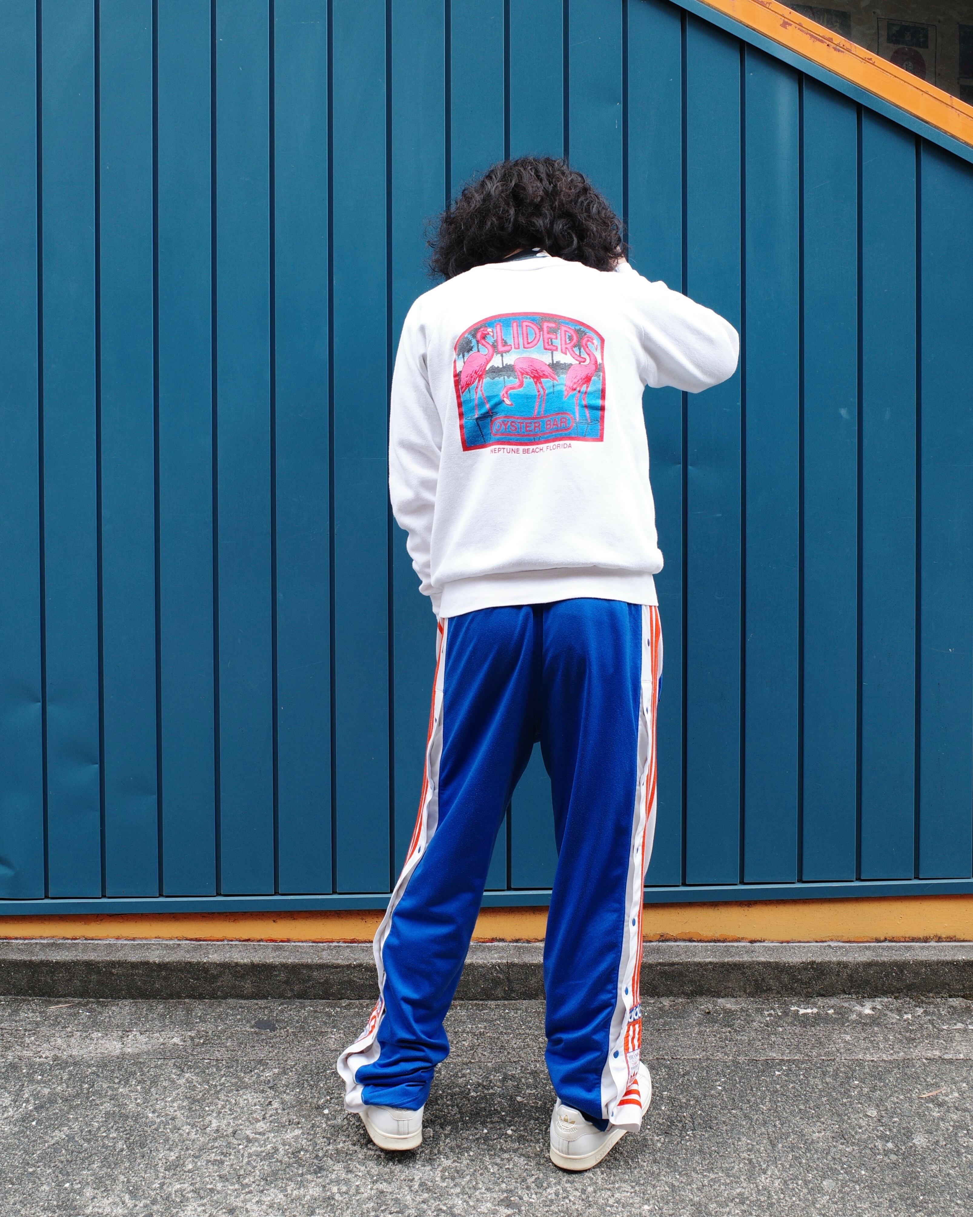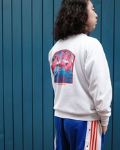 フロントはワンポイントでフラミンゴ、バックには鮮やかなピンクとブルーのフラミンゴプリントが大きく入る存在感あるデザインのスウェットシャツ。