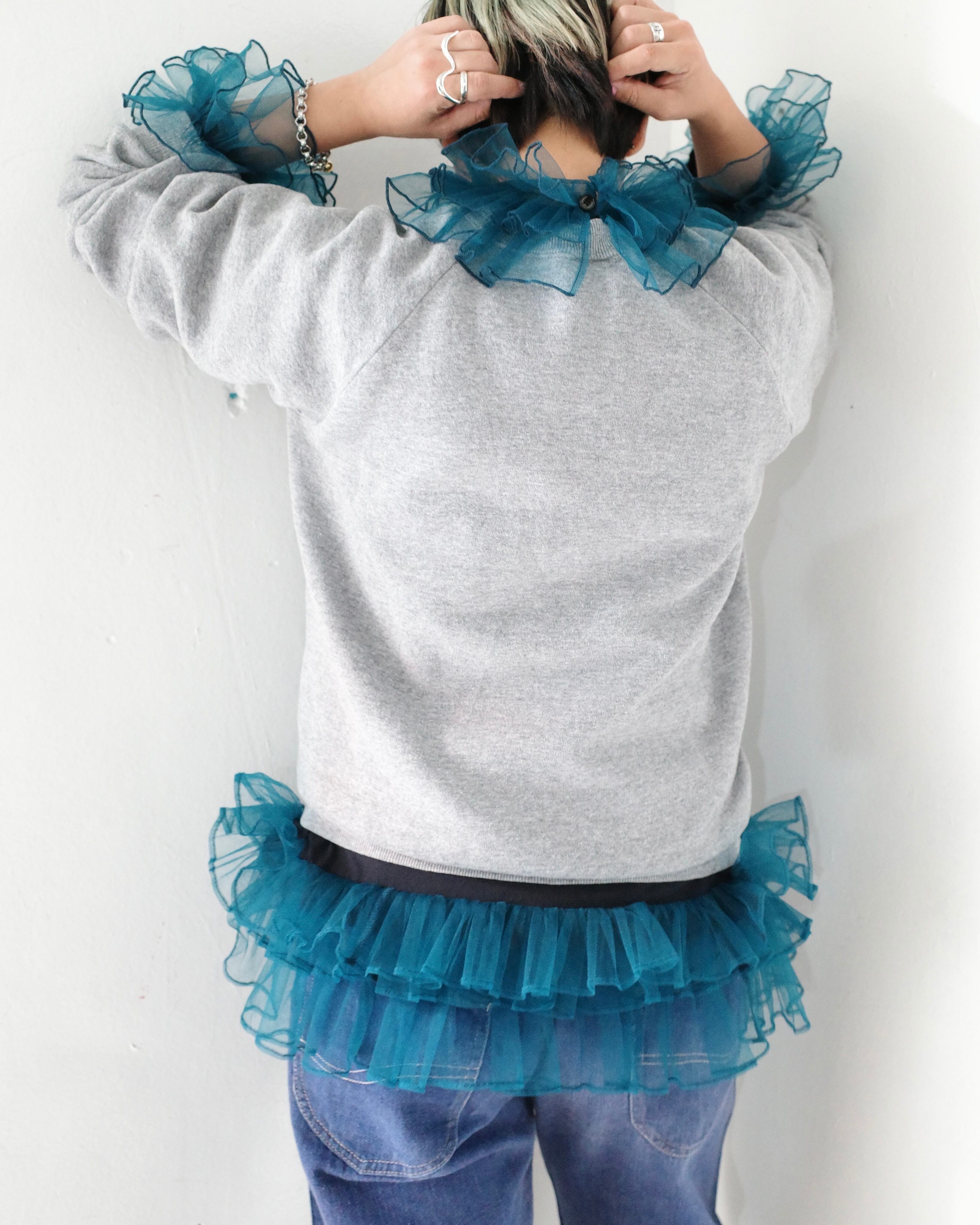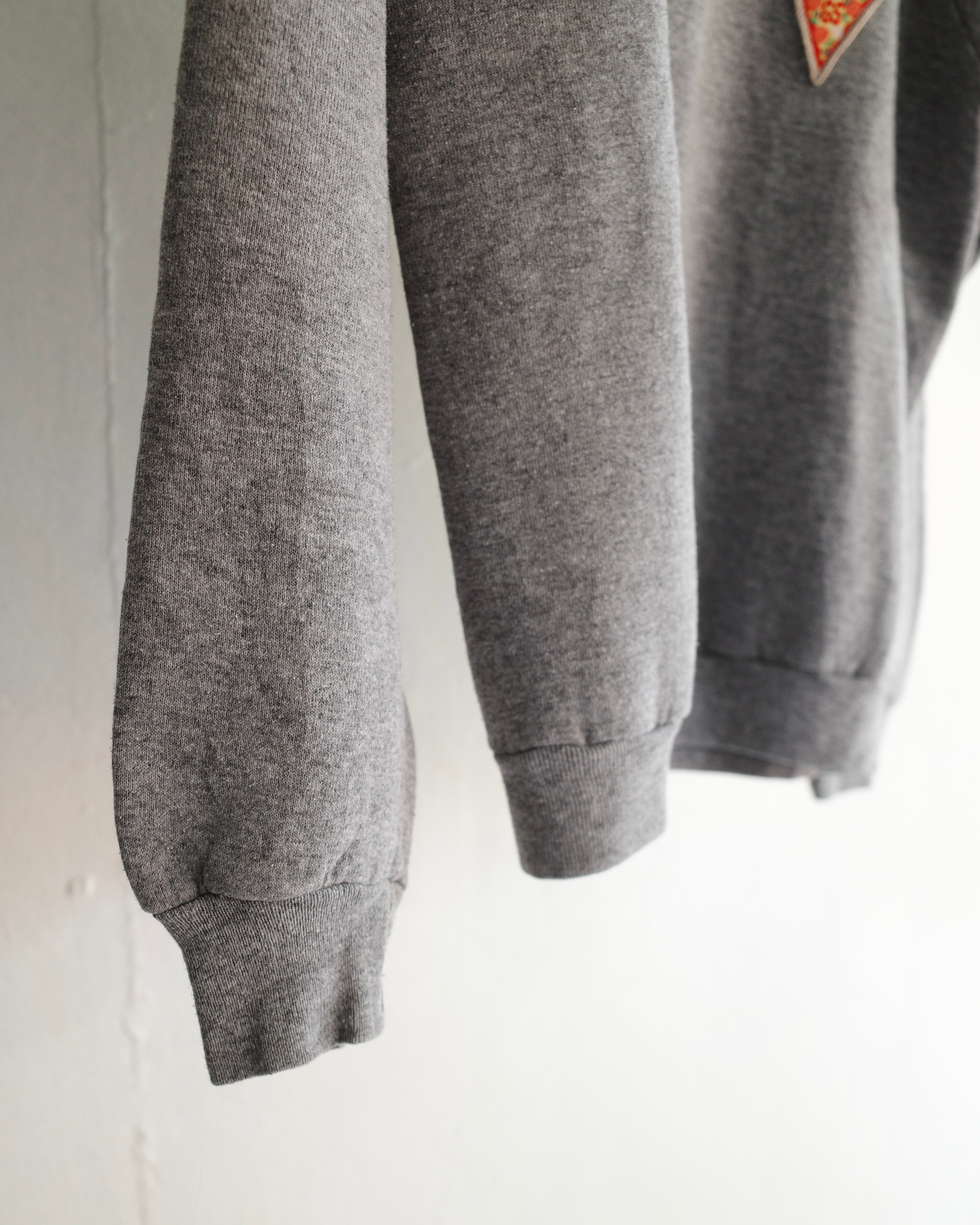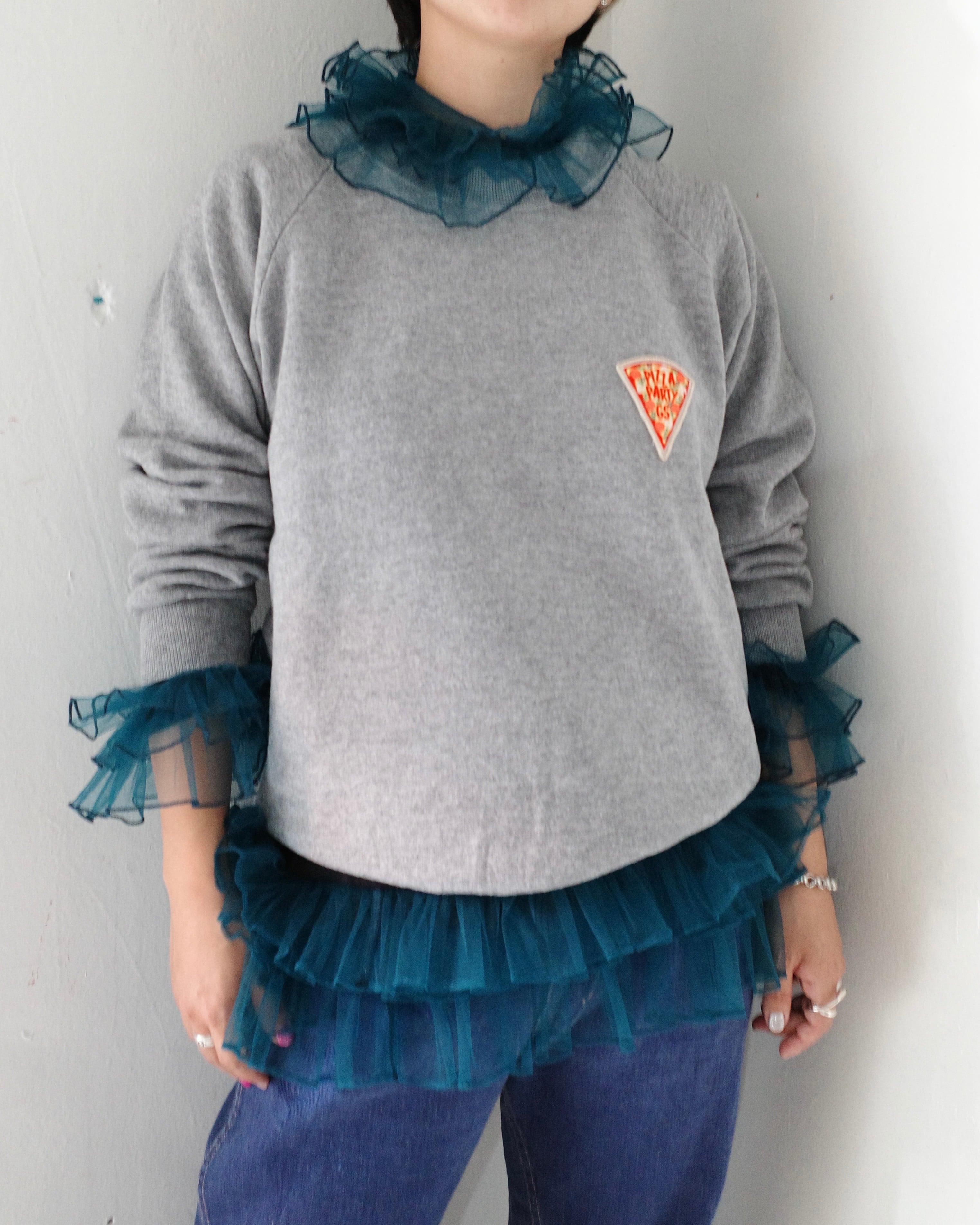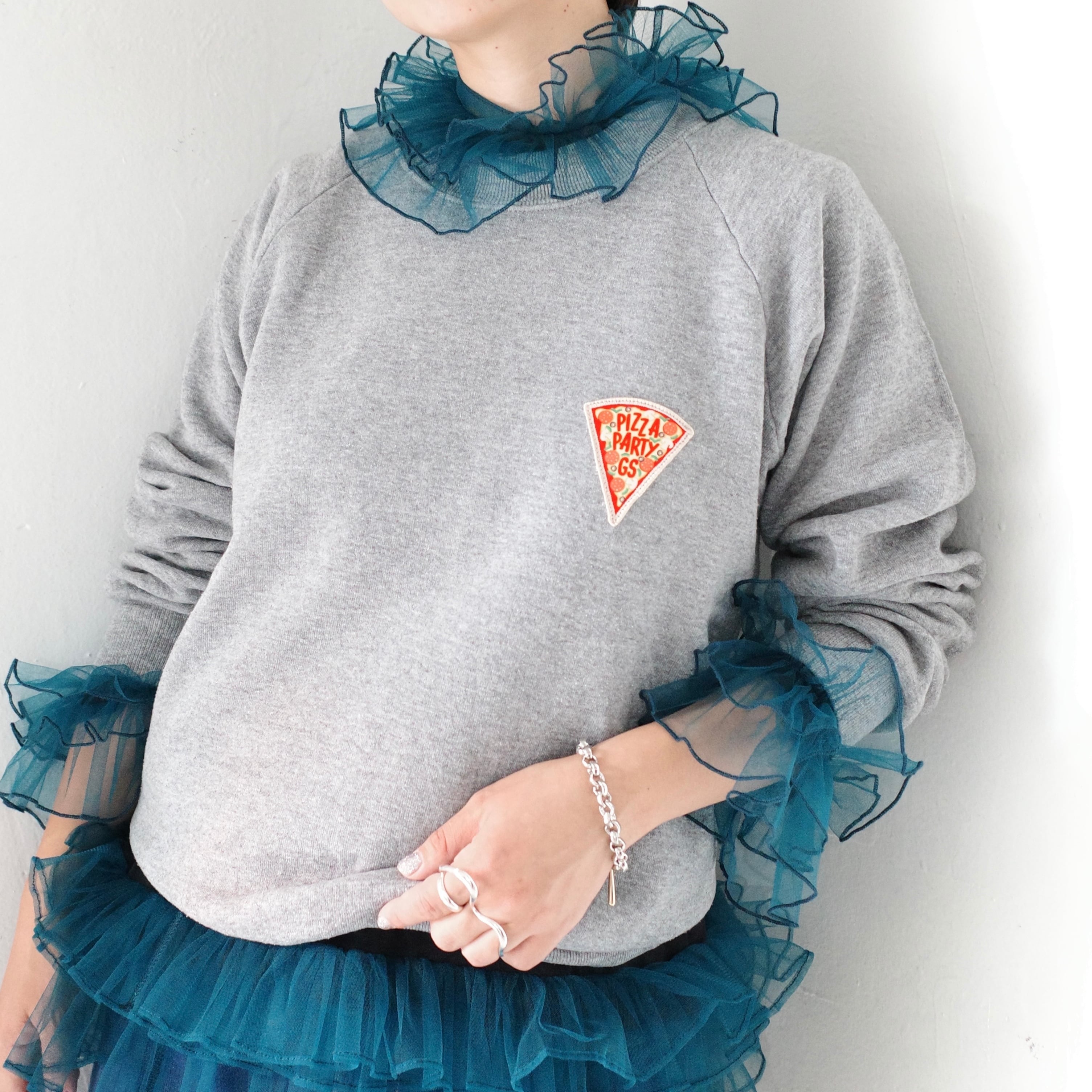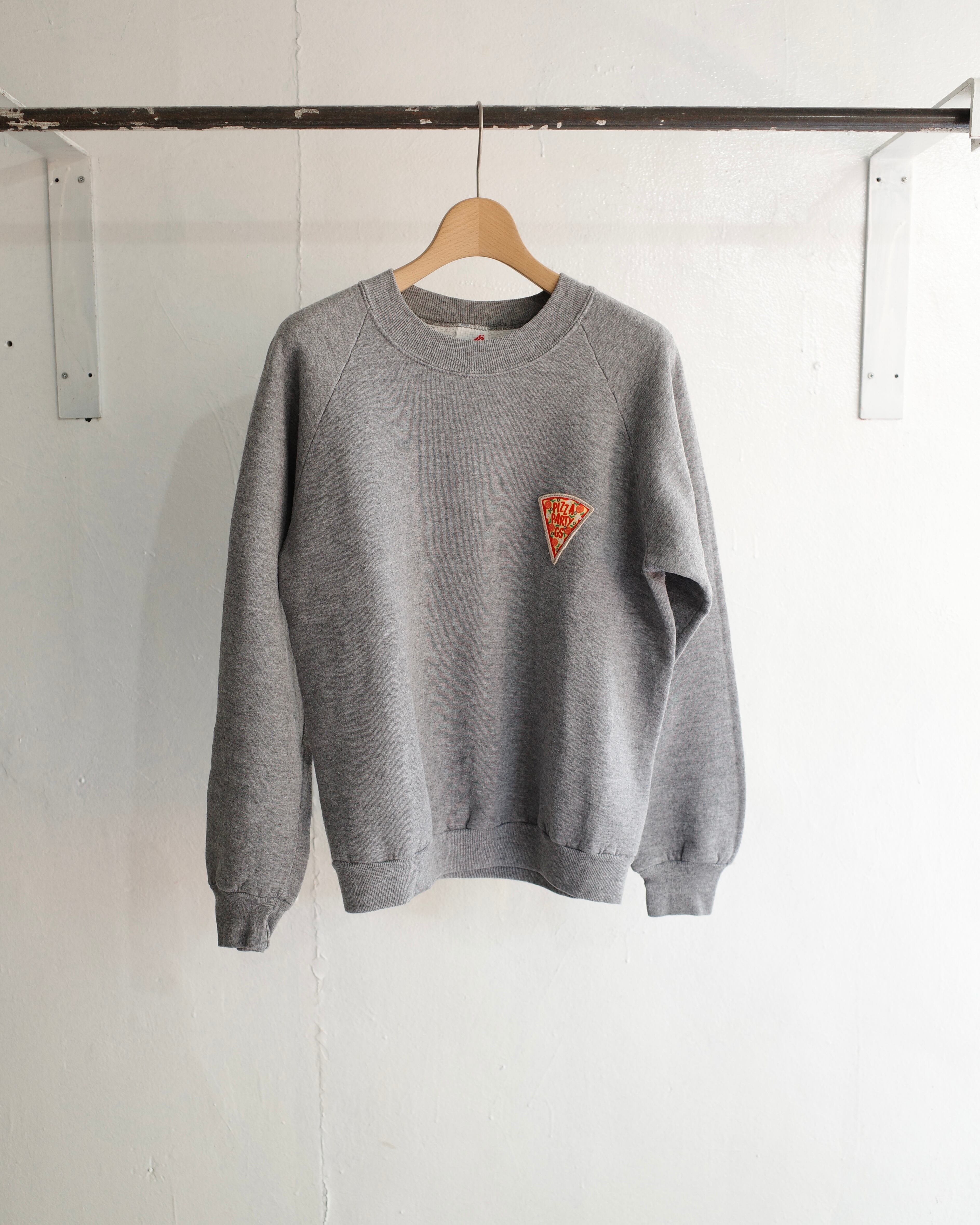 胸元にはピザスライス型のユニークなワッペンが施され、シンプルなグレーのボディに遊び心をプラスしています。