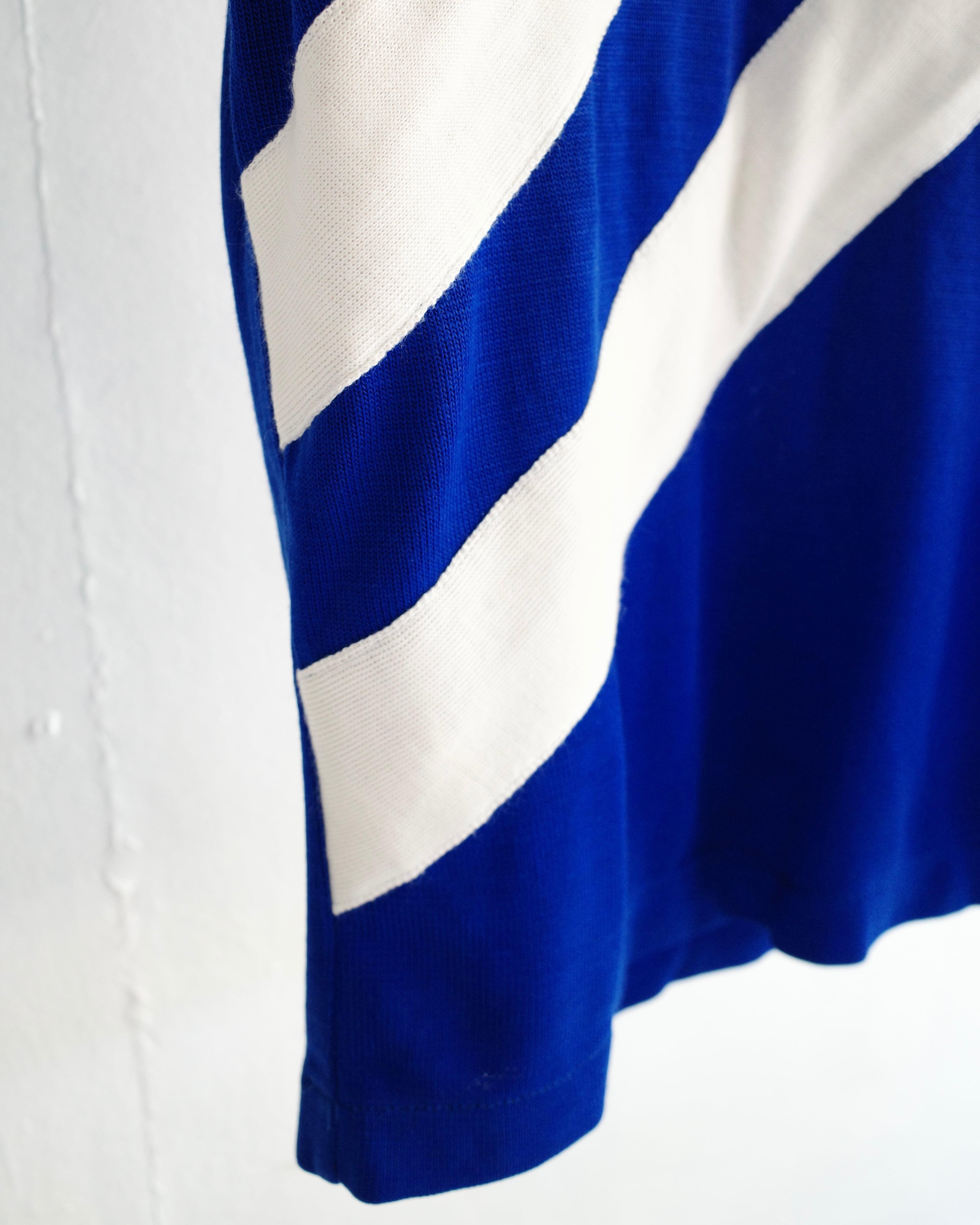 鮮やかなロイヤルブルーにホワイトの斜めサッシュ2本が走る、スポーツユニフォーム由来のニットベスト。