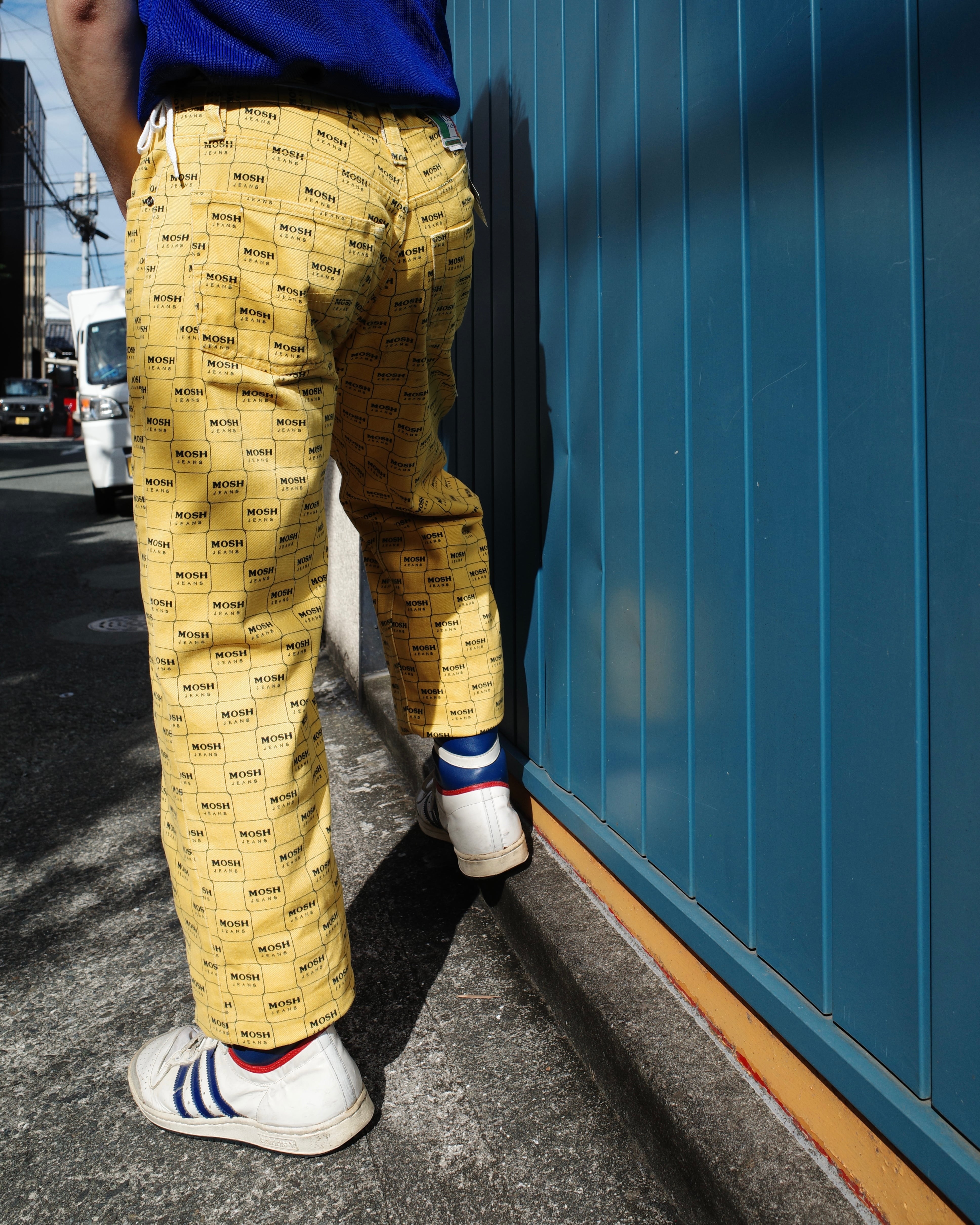 陽気なイエローをベースに、MOSH JEANSのロゴをタイル状に敷き詰めた総柄パンツ。