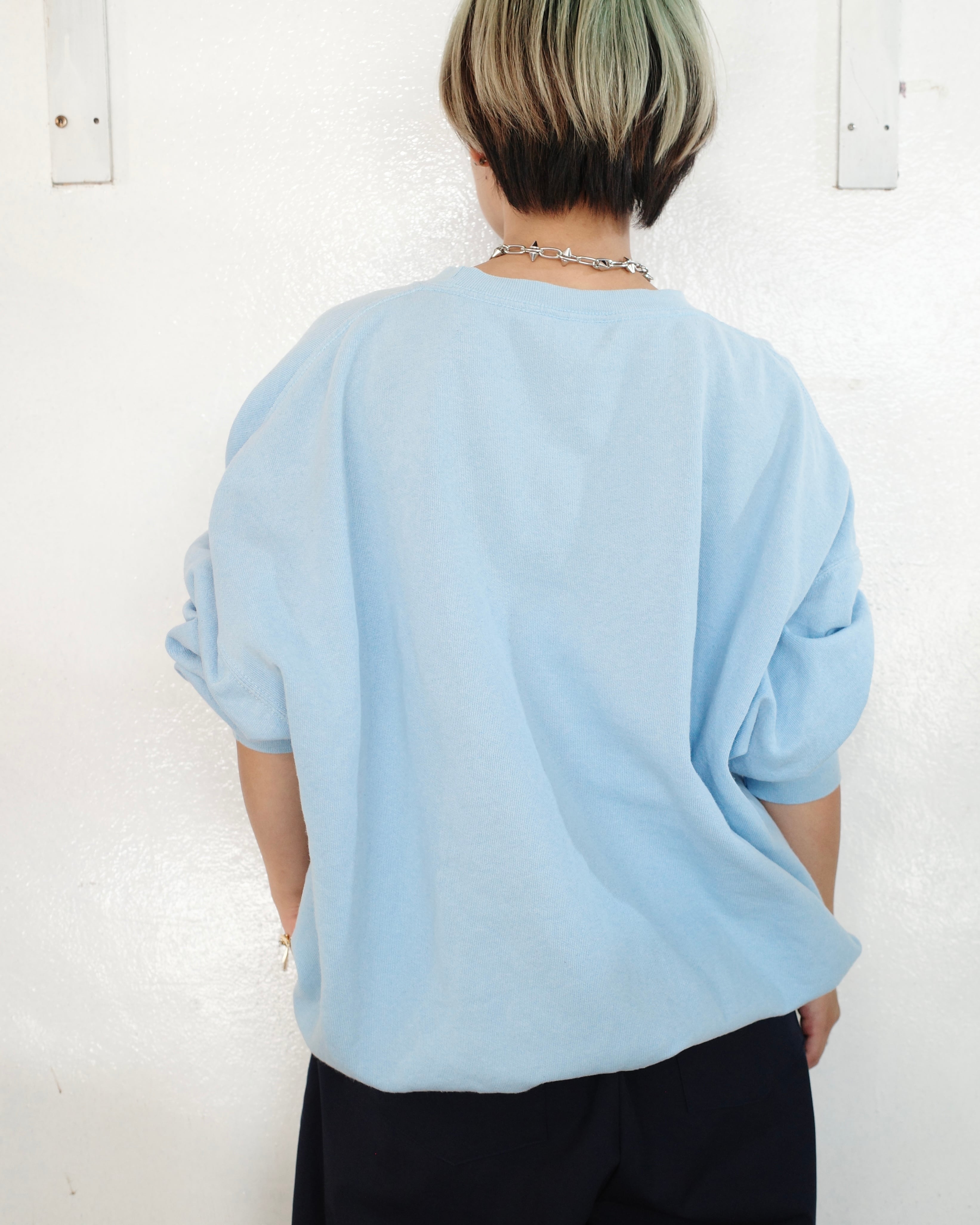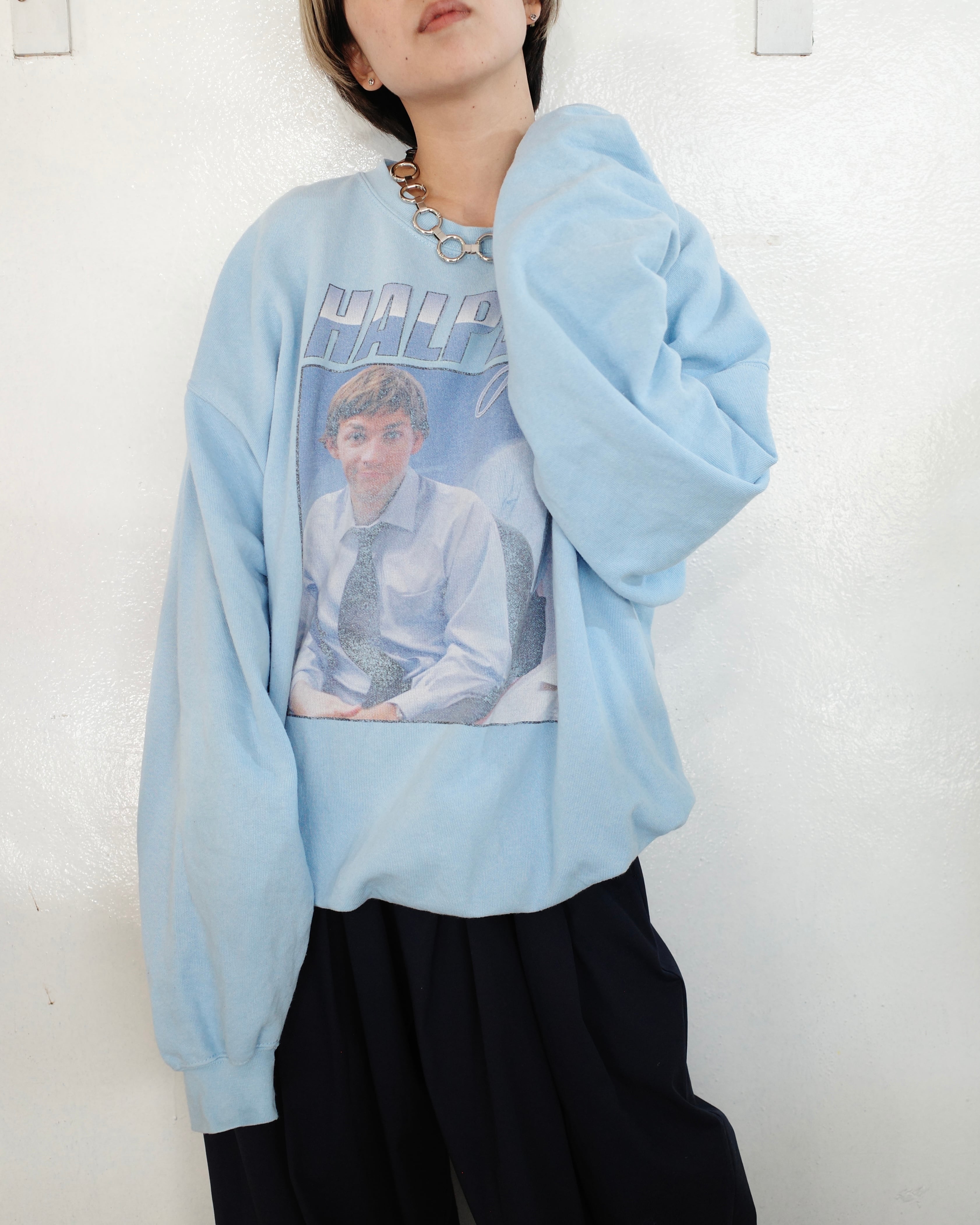 やわらかなライトブルーのボディに、フロントへ大判の“HALPERT Jim”グラフィックが載ったスウェット。