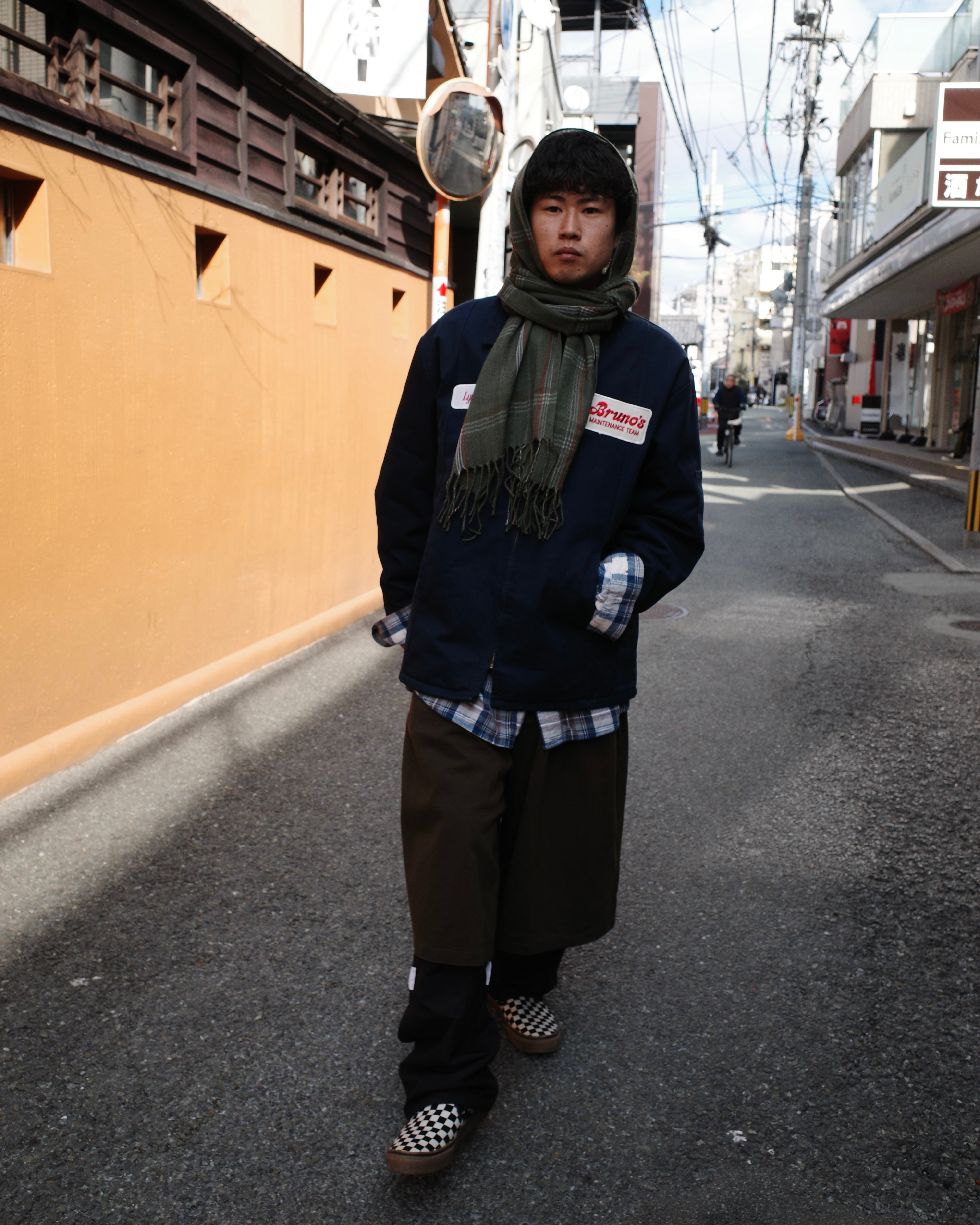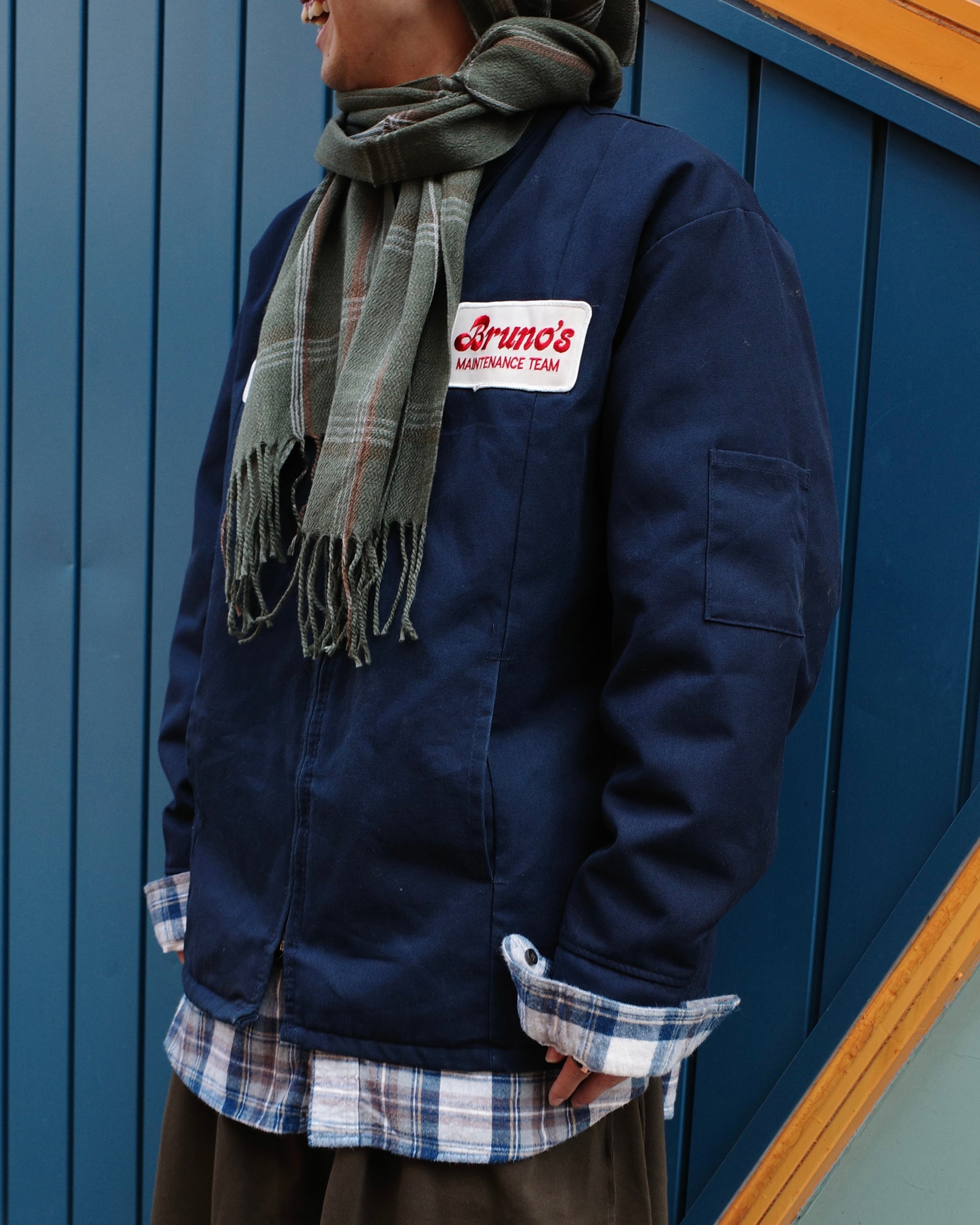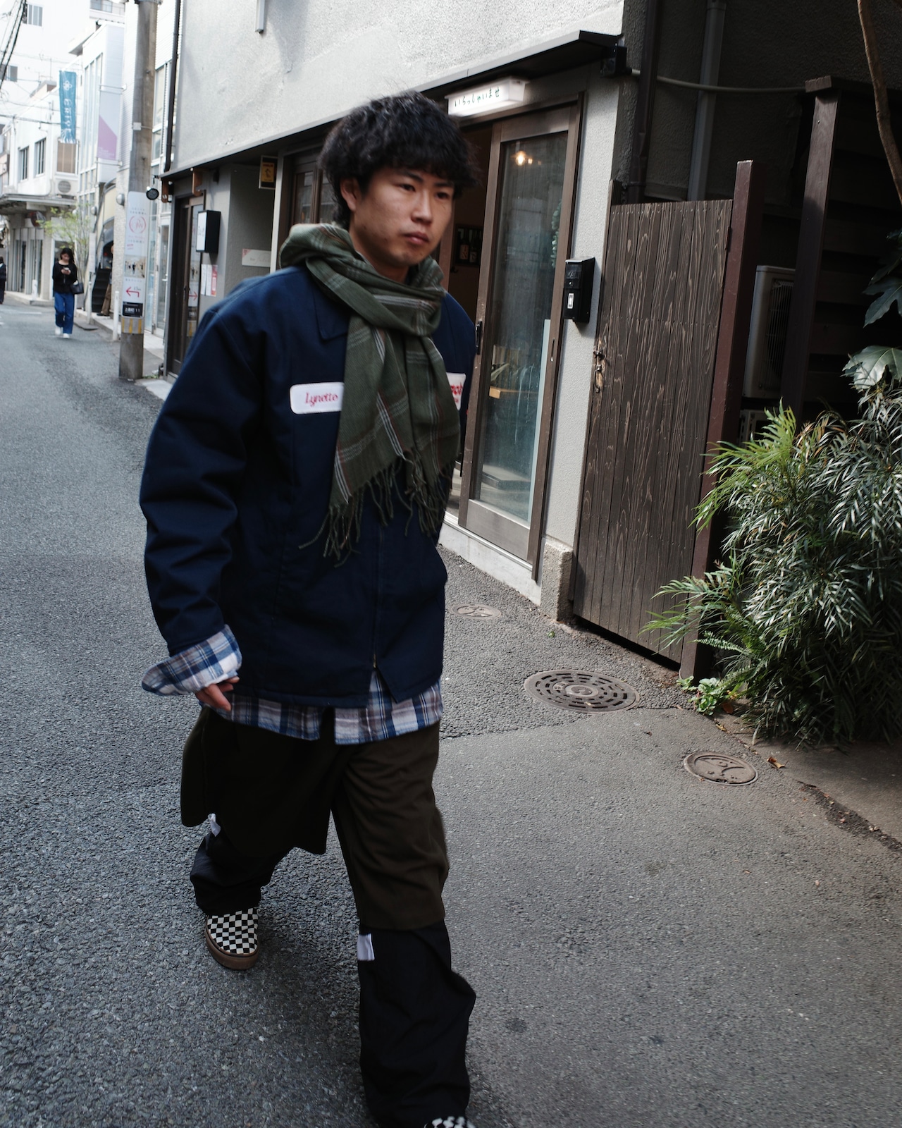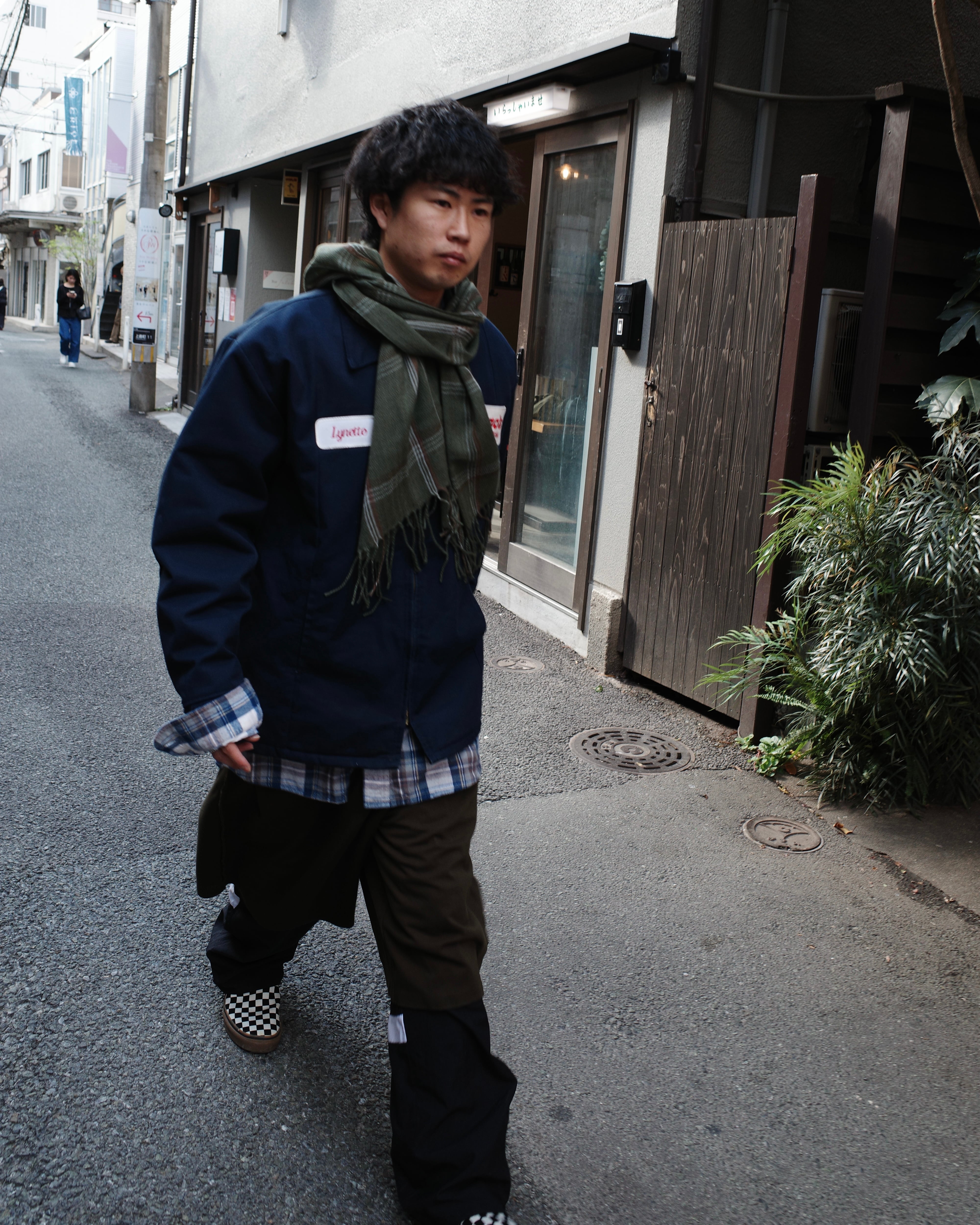 定番なワークジャケットだからこそ重ねばきやメンズスカート、総柄のボトムスなどエッジの効いたスタイリングに合わせていただくのがおすすめです