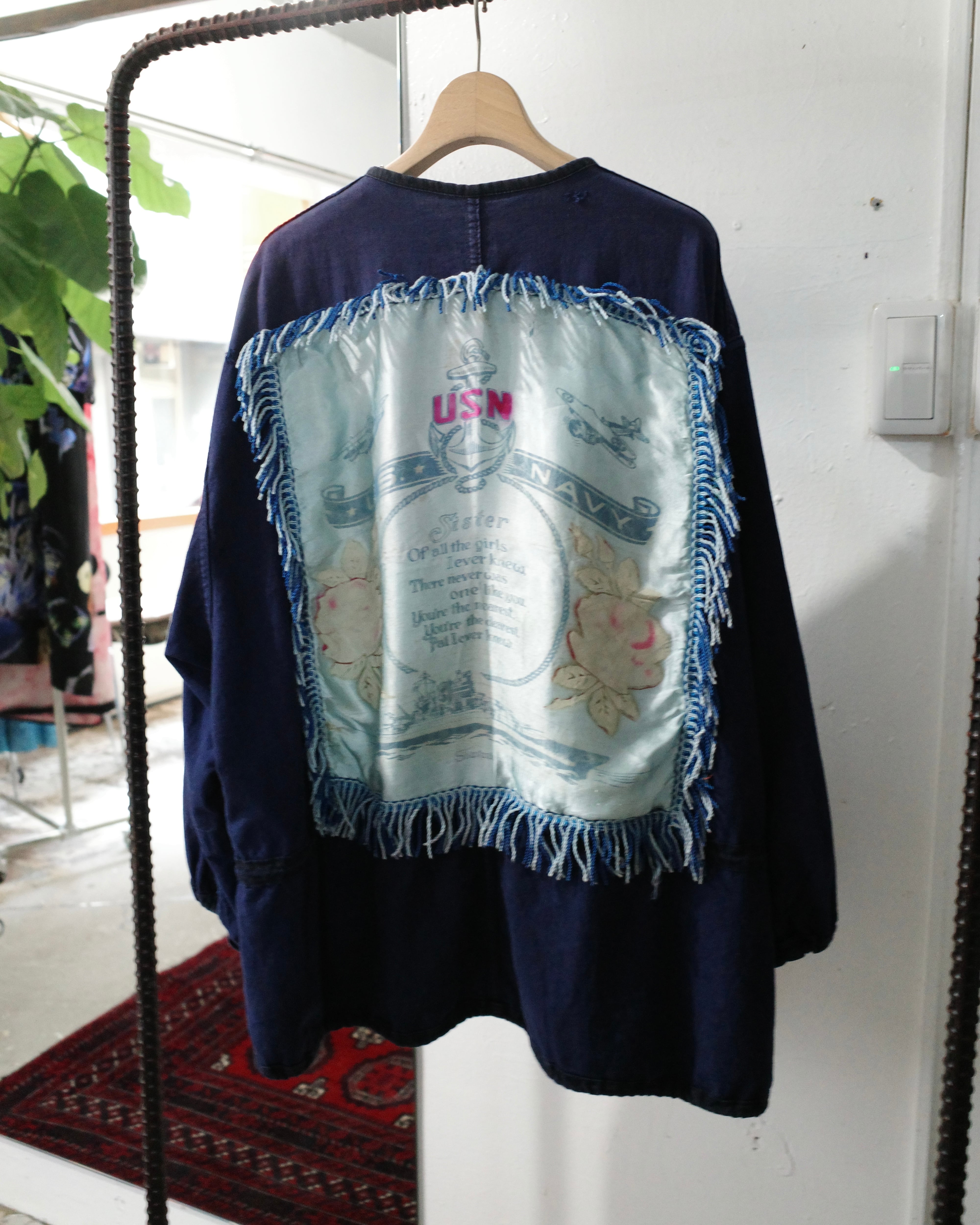 アメリカ海軍のタペストリーを背面にあしらった贅沢なリメイクシャツ