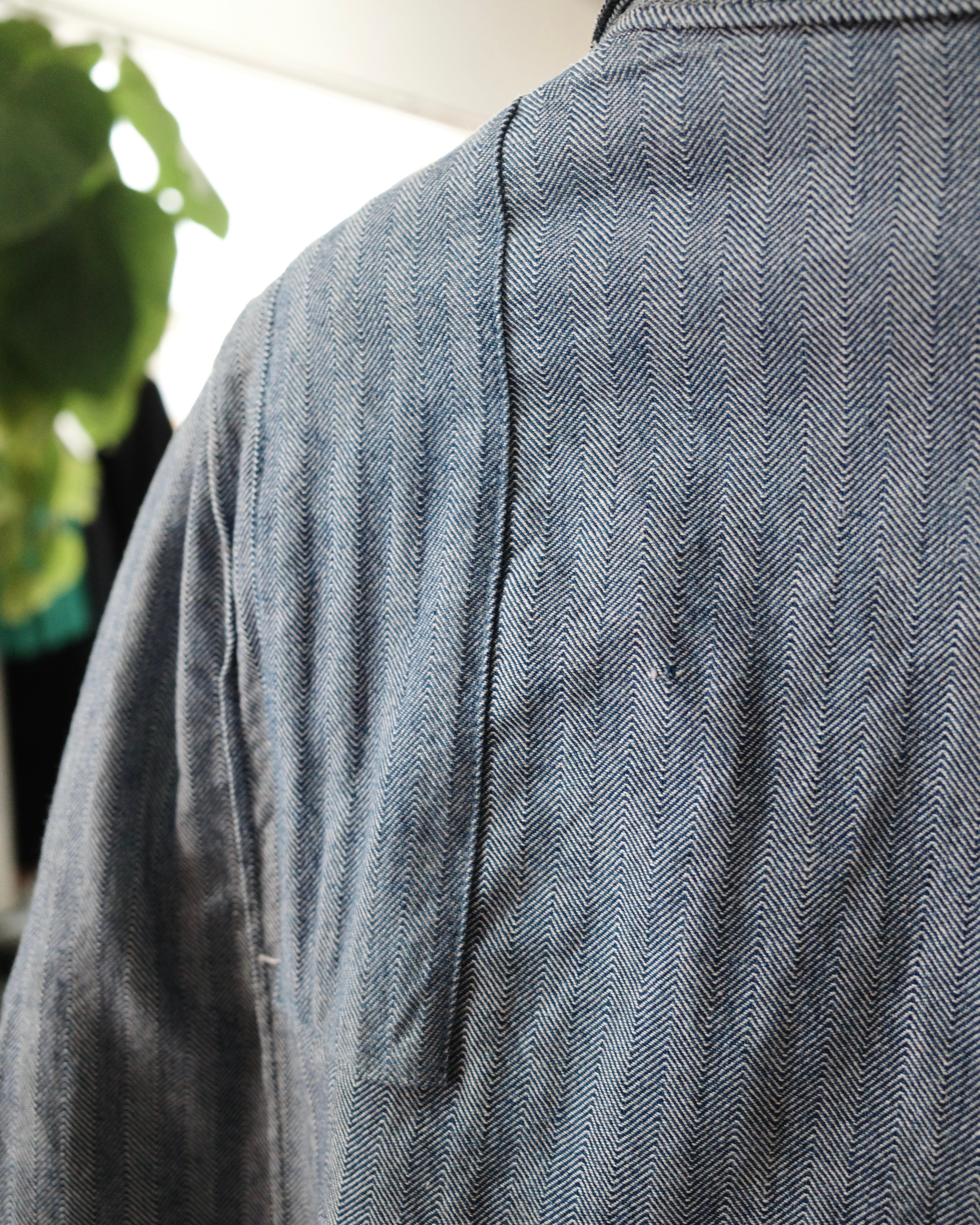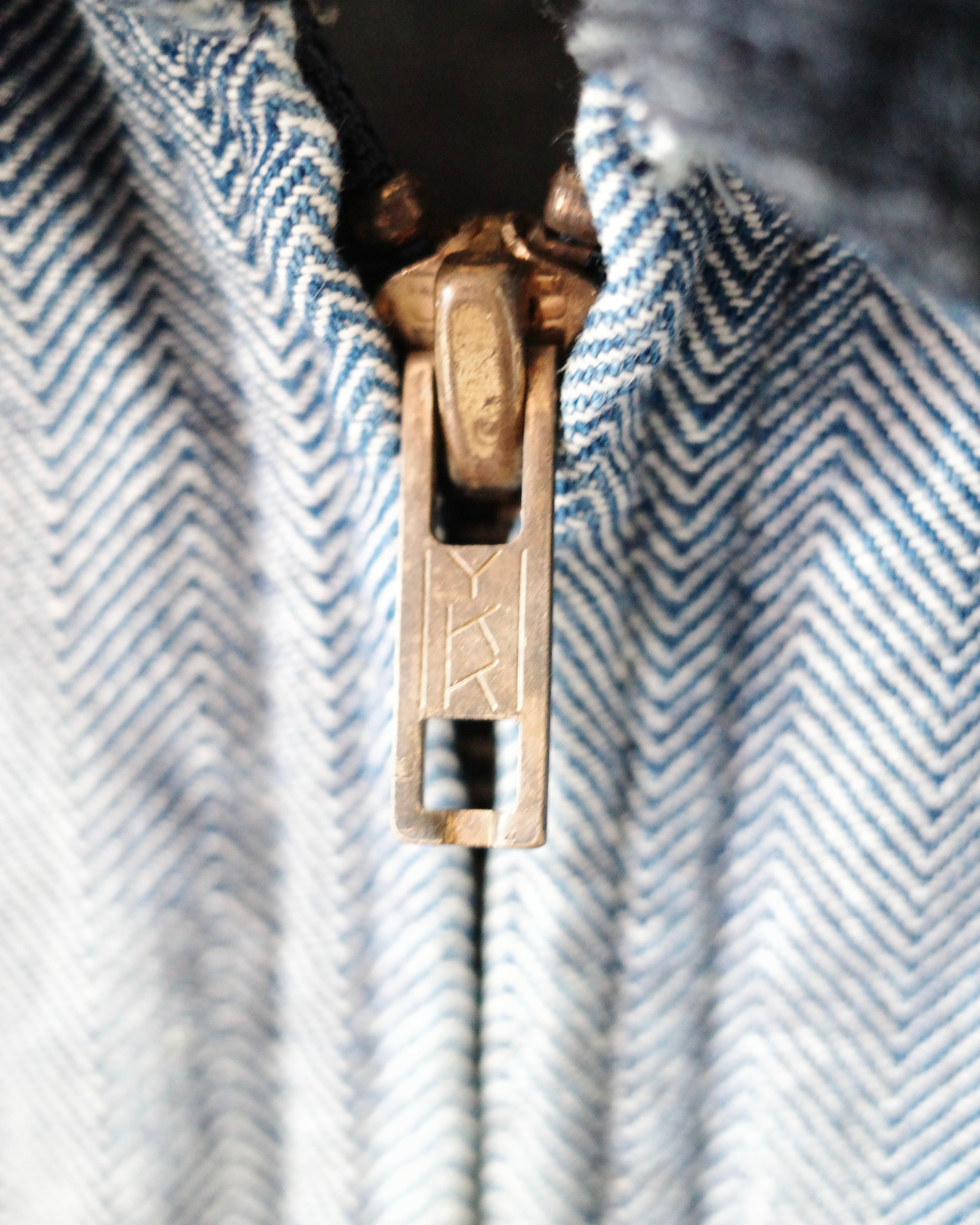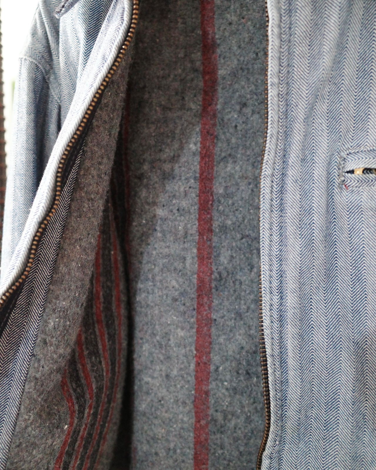 Carharttのデトロイトジャケットを模したデザインにヘリンボーンデニム生地を使用した一着