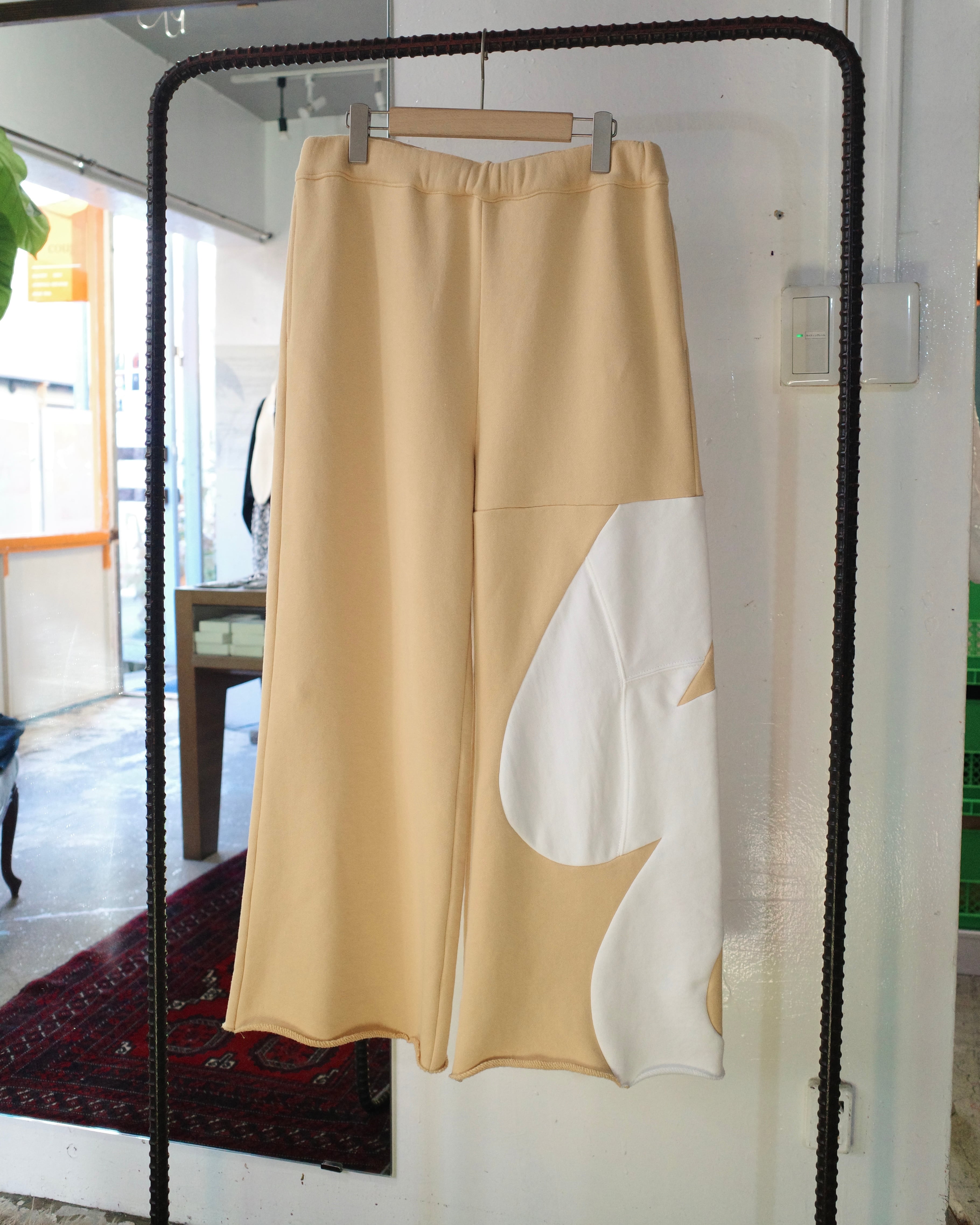 ボリュームのあるスウェットパンツにうねうねした切り替えがグラフィティーのように絡んでいます。