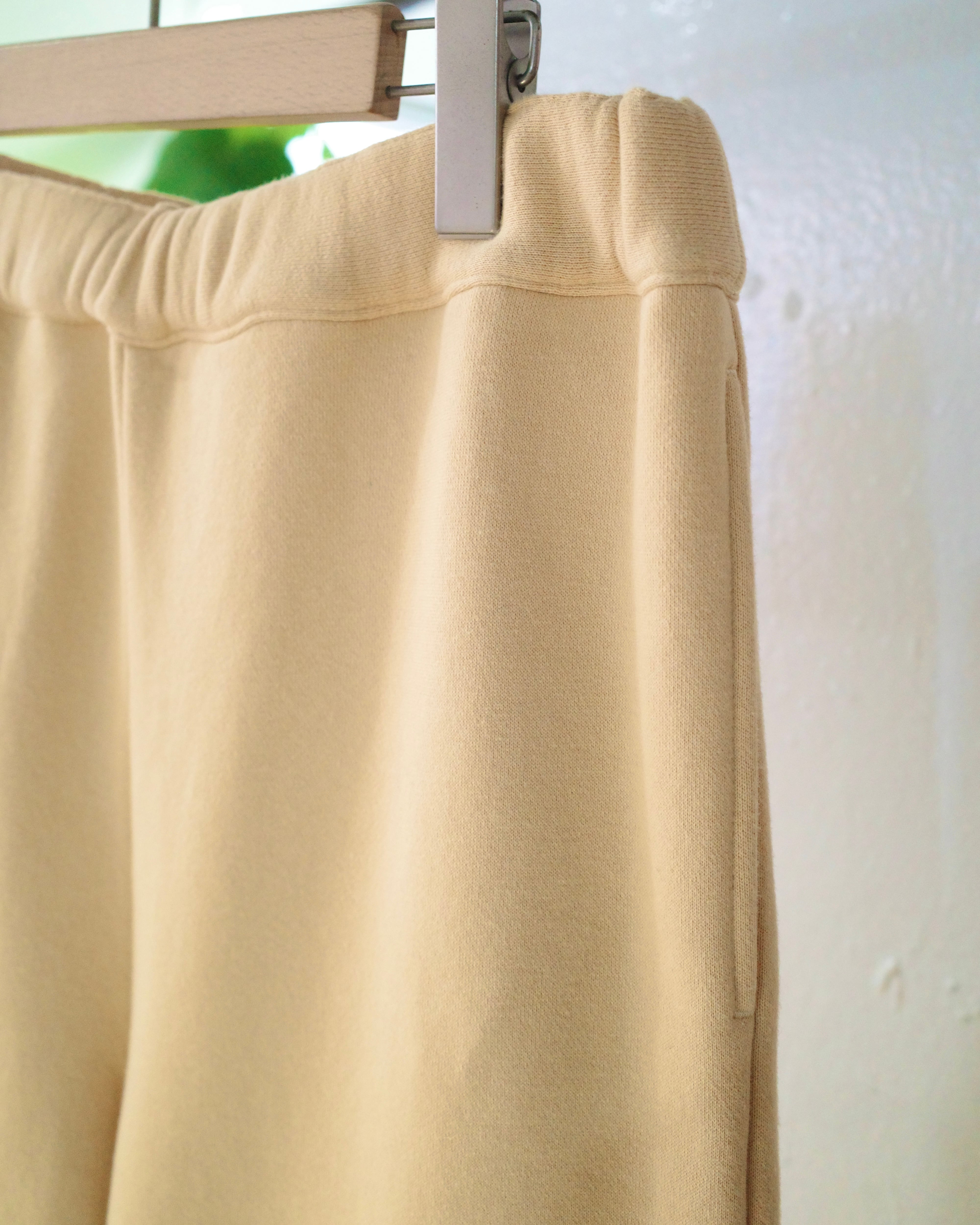 希少性の高い旧式の丸編機「アズマ裏毛機」を使用して仕上げた裏毛で仕立てたワイドフレアパンツ。