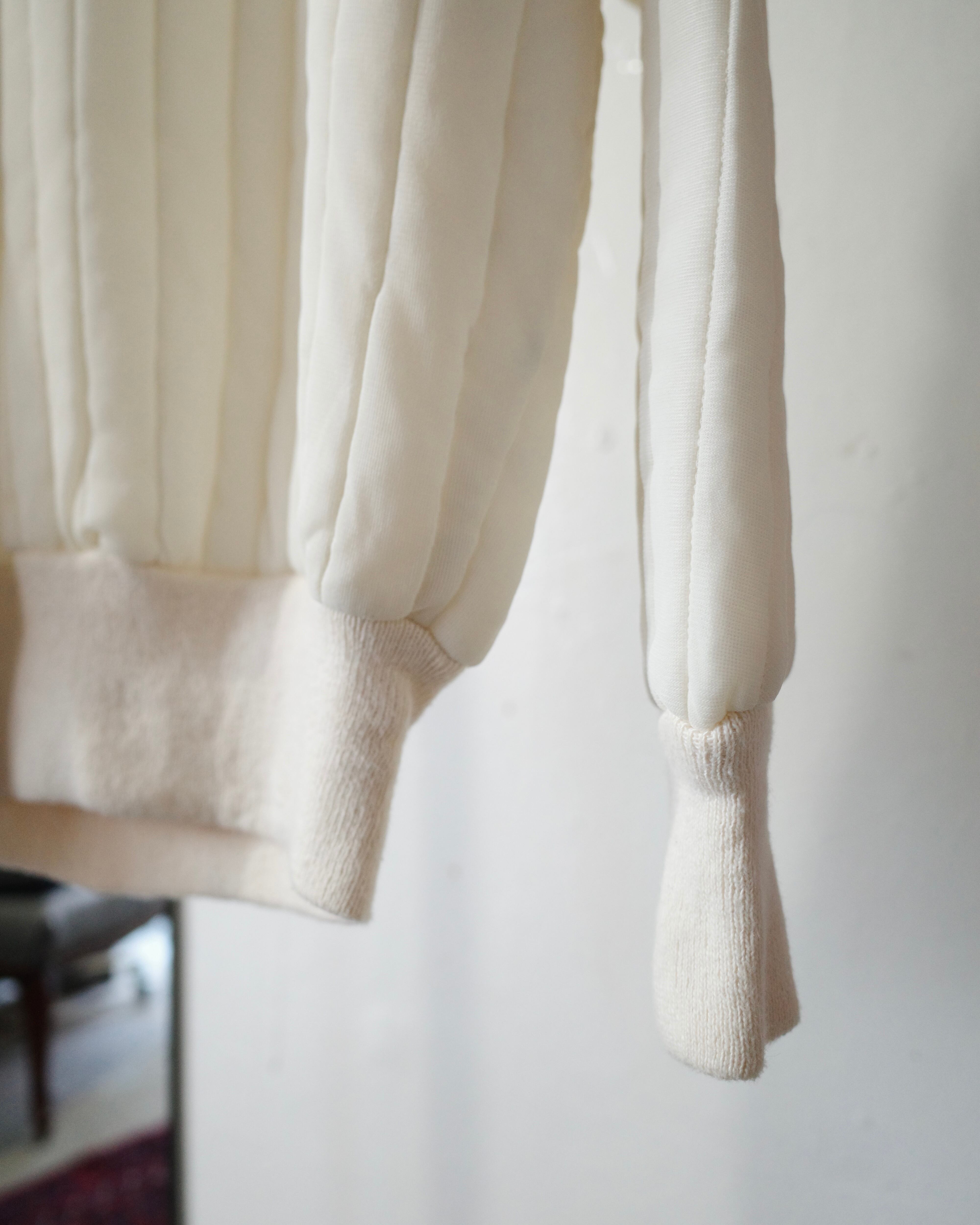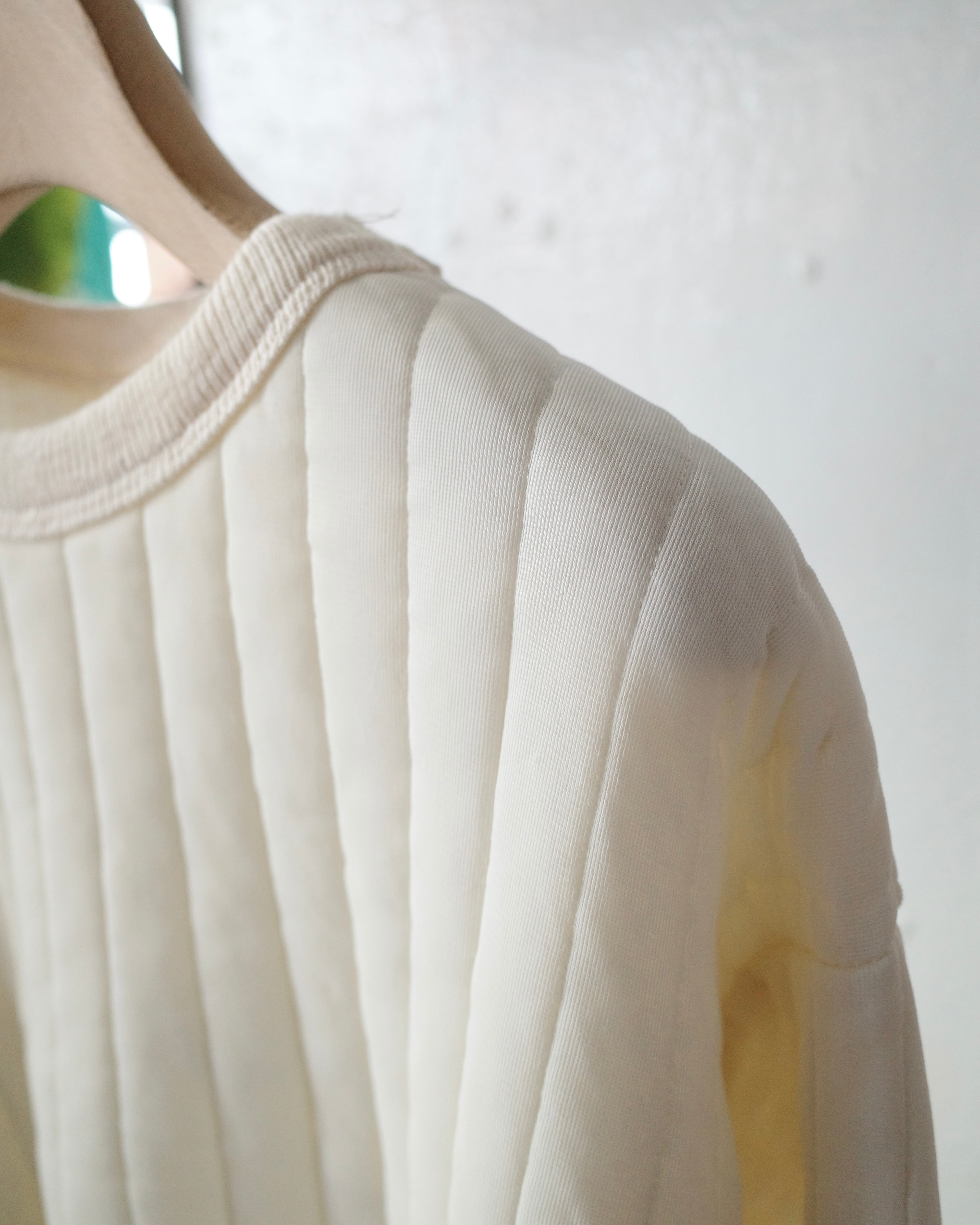 表はキルティング、裏はサーマル生地の肉厚なシルエットに長めの柔らかいリブがモードな雰囲気にも見えます