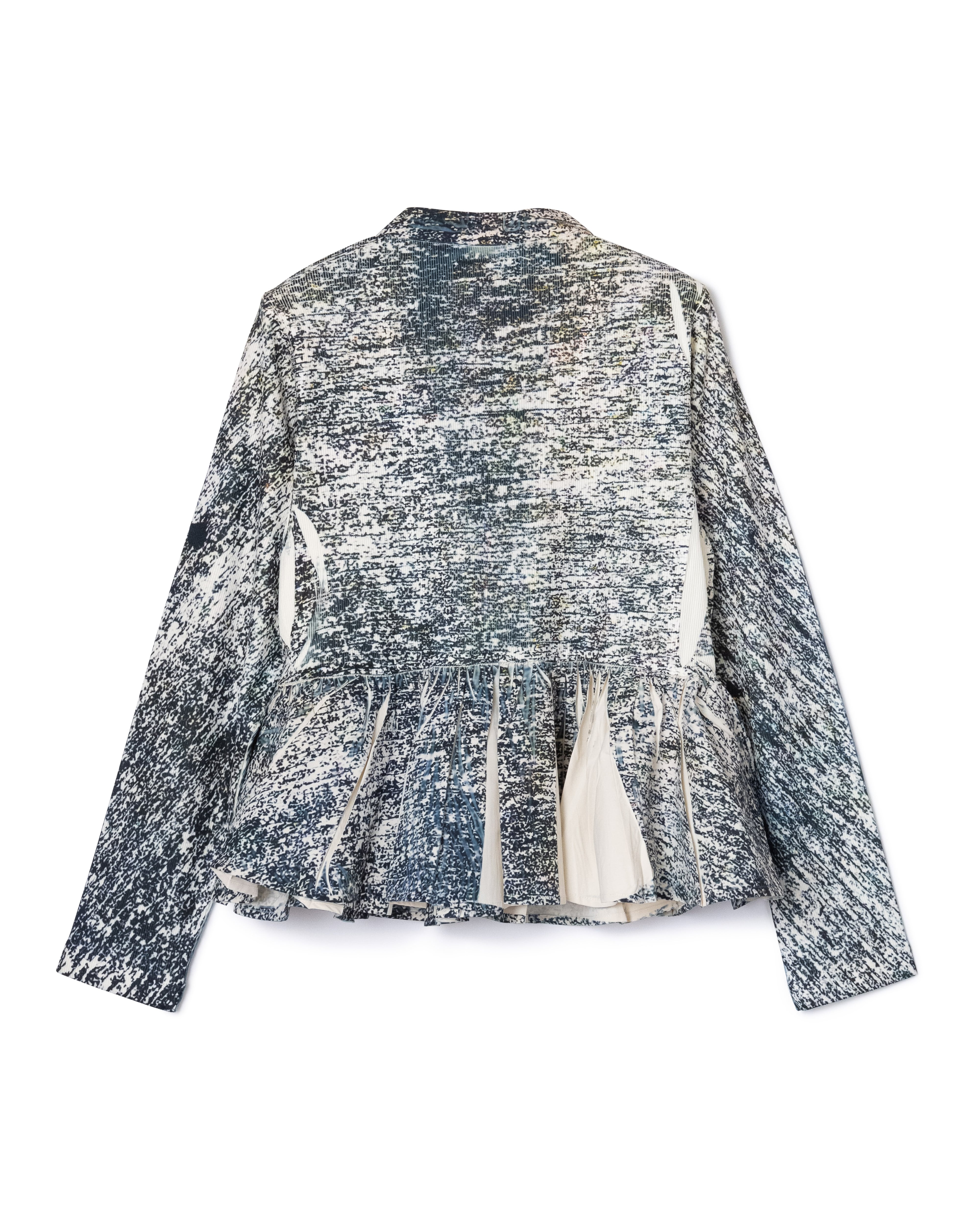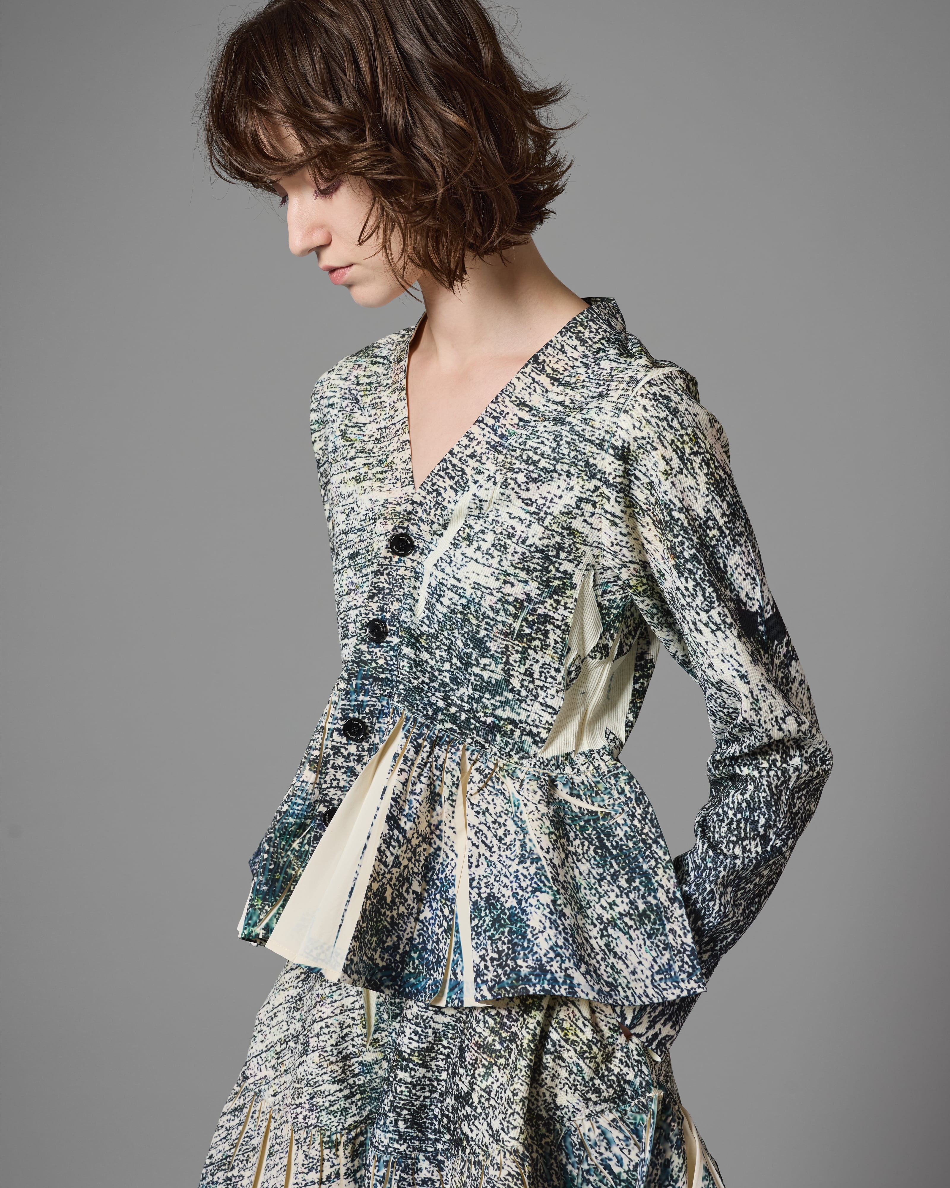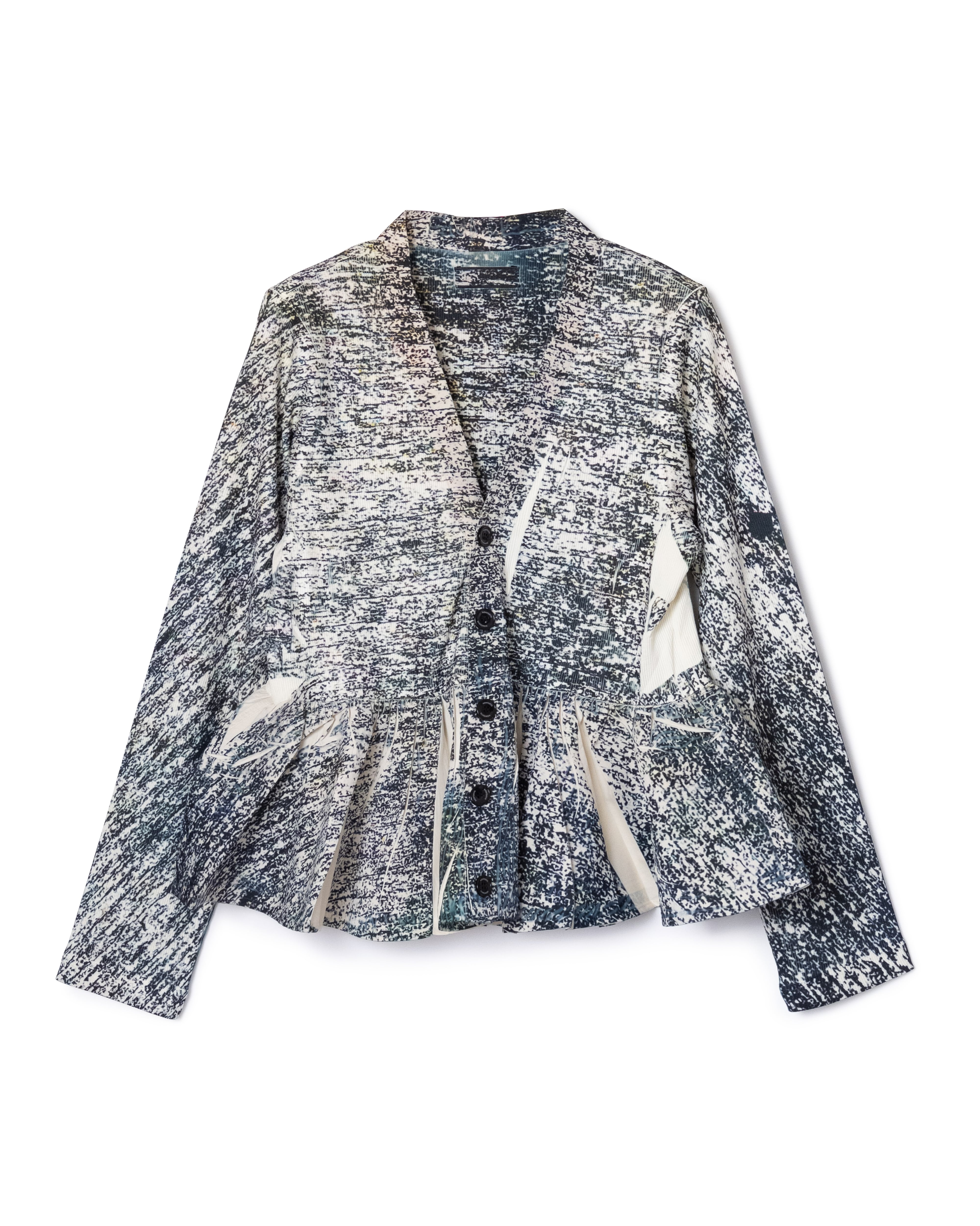 転写フォトプリントを施した、印象的なリブギャザーカーディガン