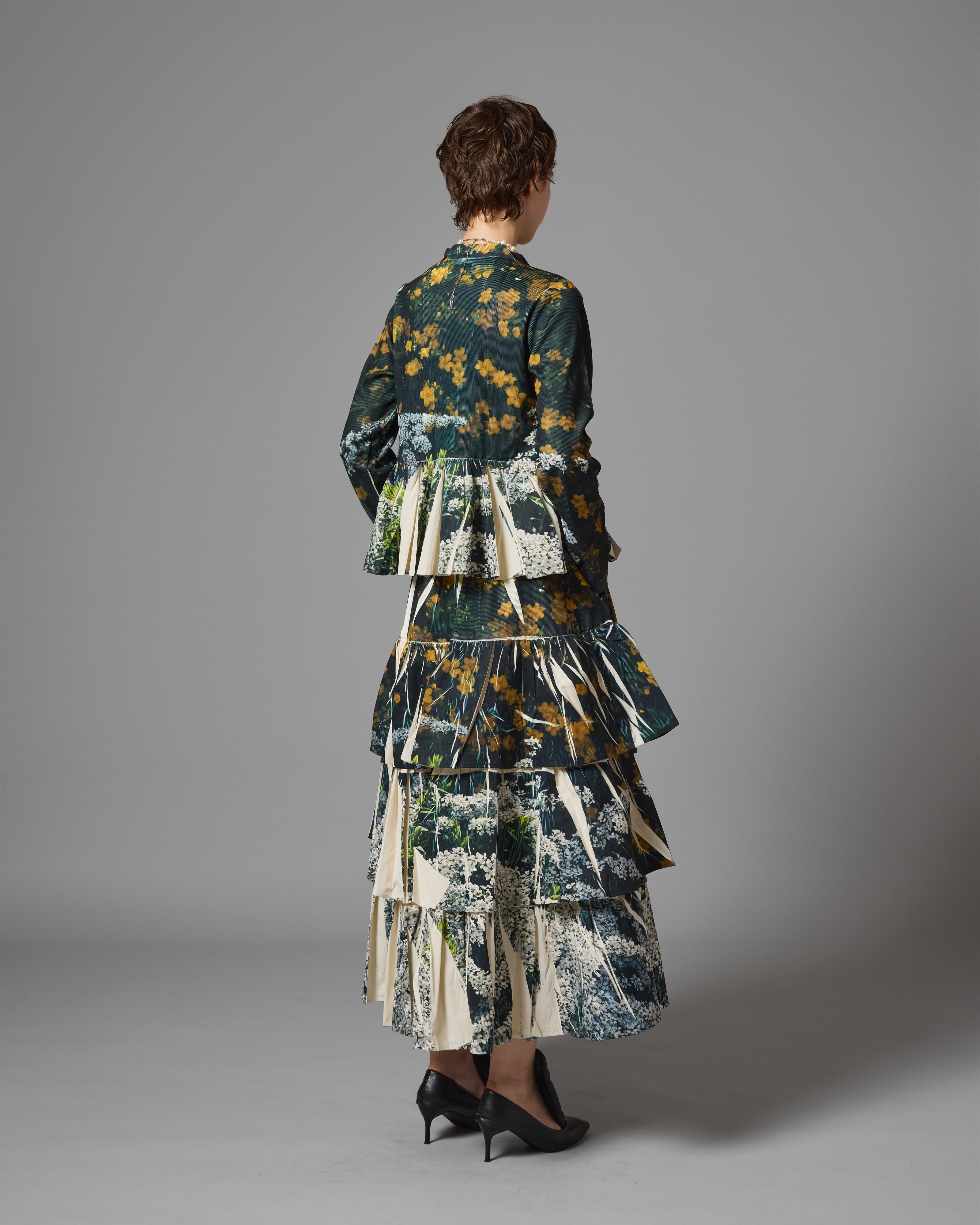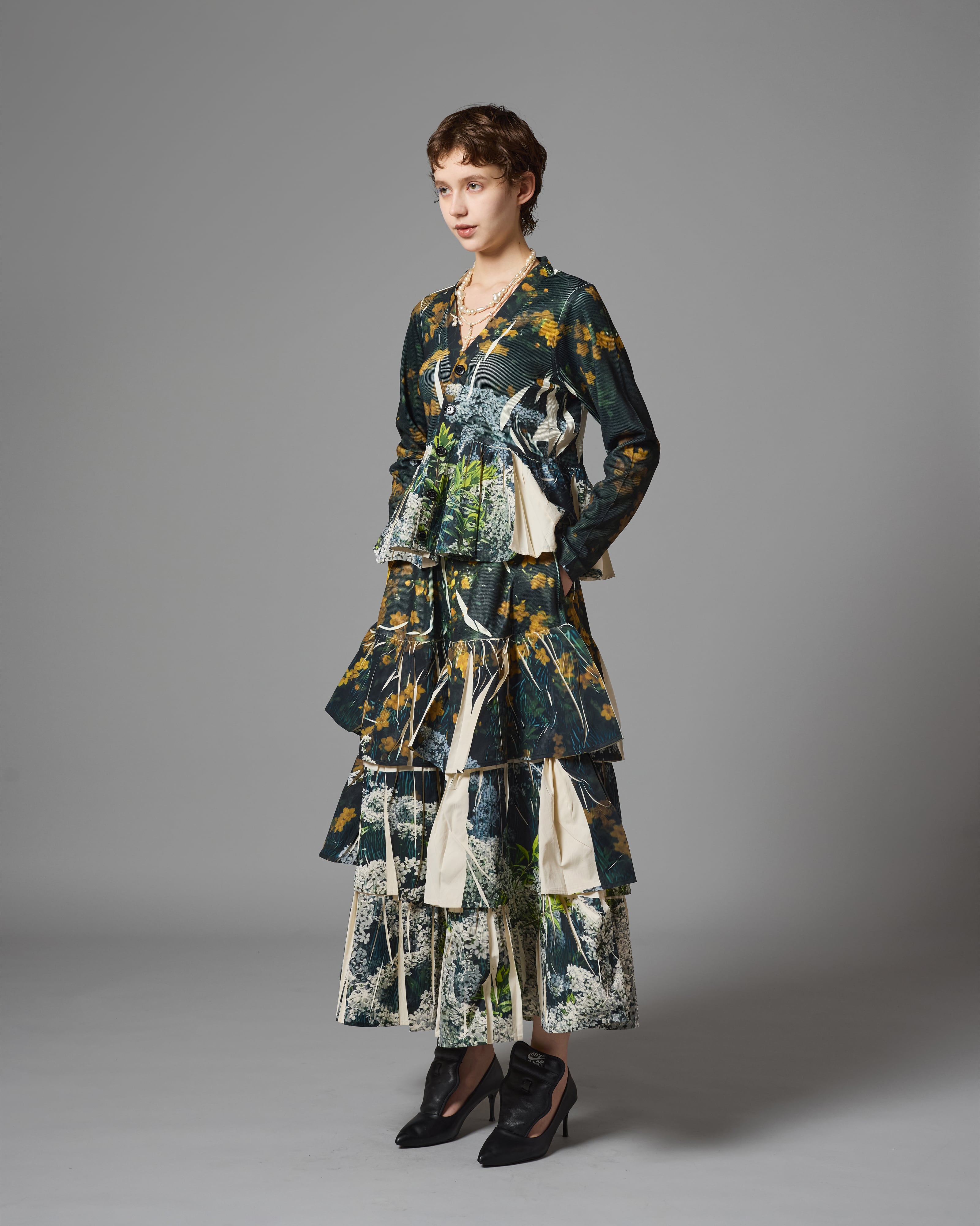切替部分にギャザーを寄せたデザインで、動きのあるフレアシルエットを演出