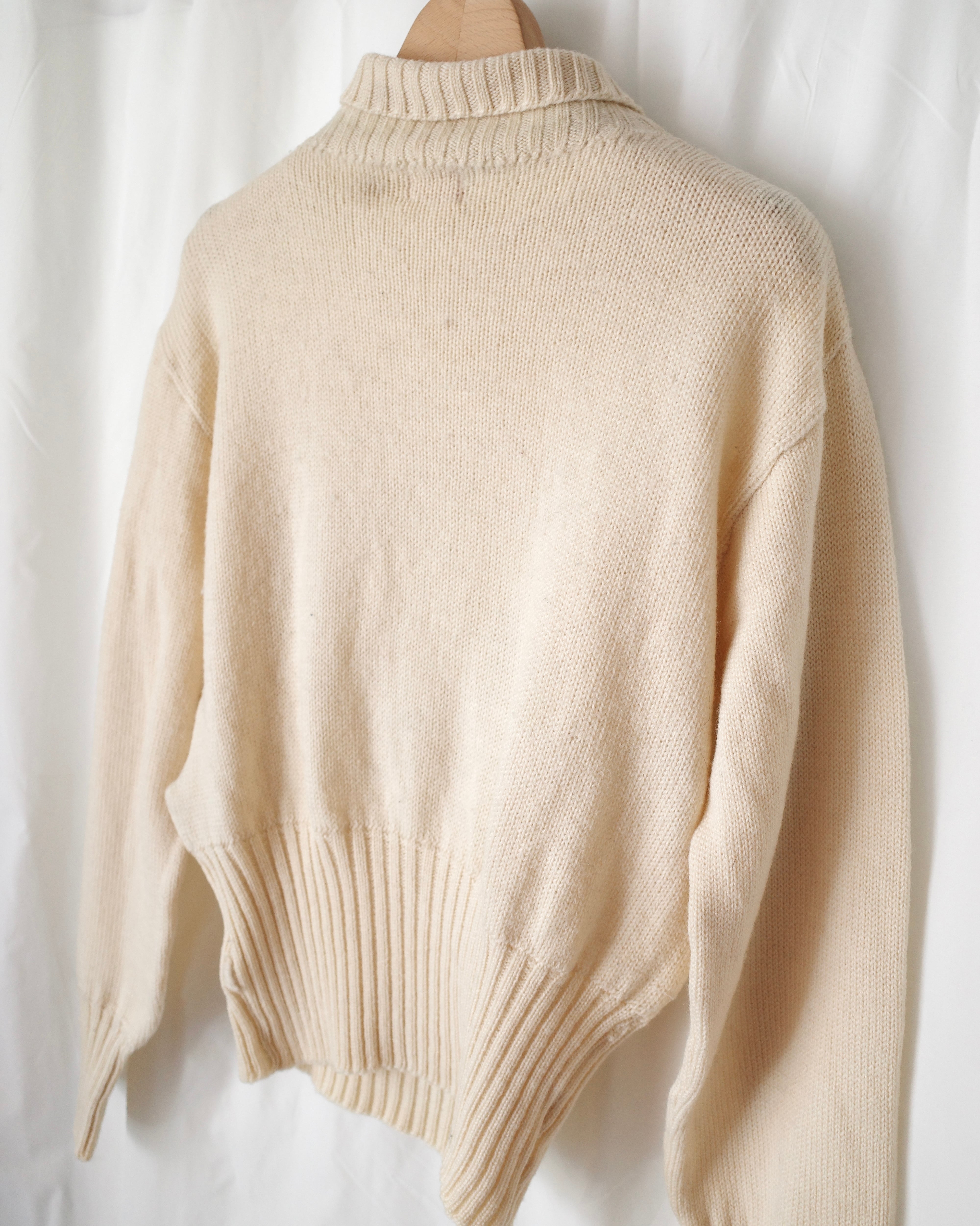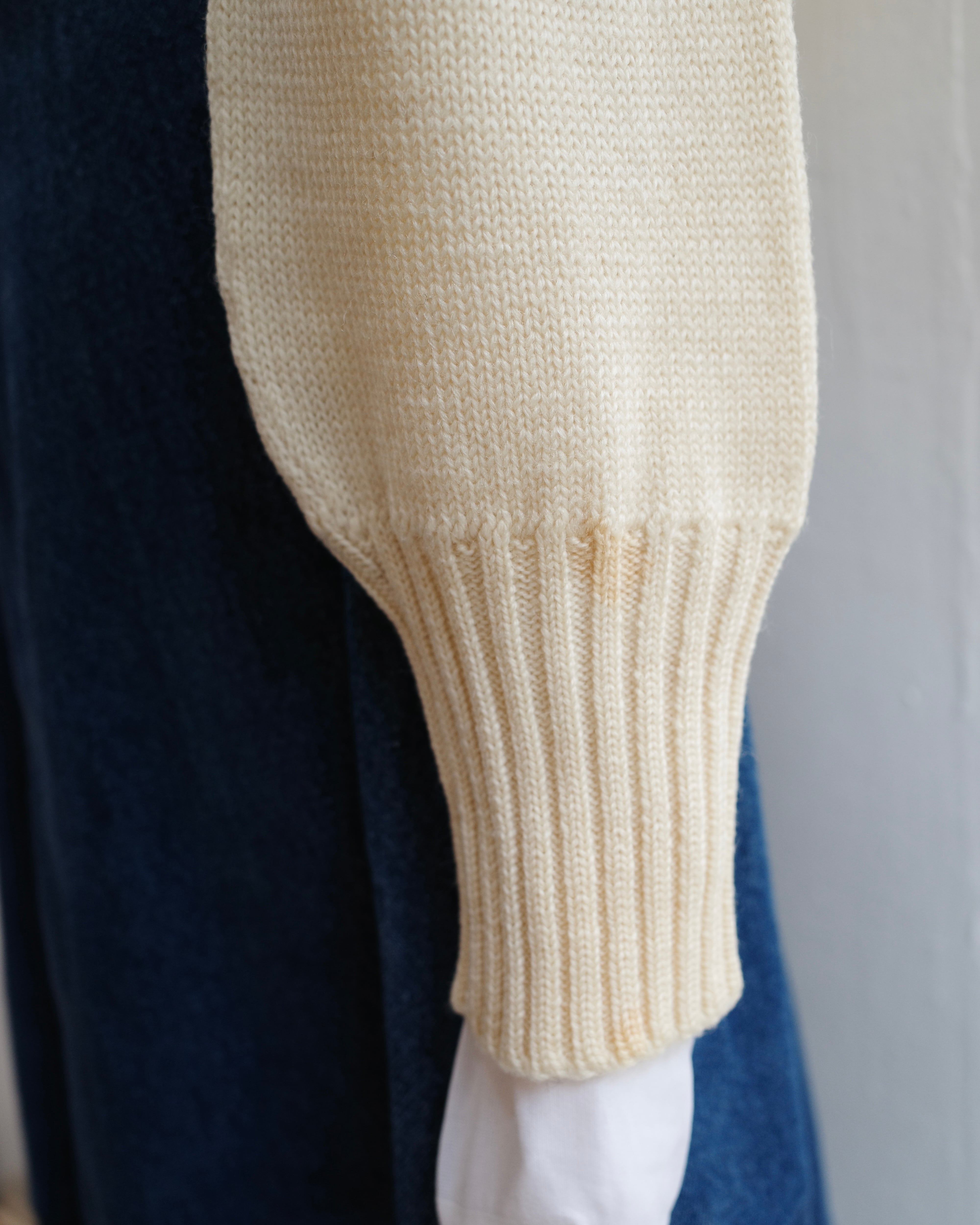 ジャストサイズなかっこいいシルエットですのでバギーのデニムやワイドめなボトムで合わせたいニットです
