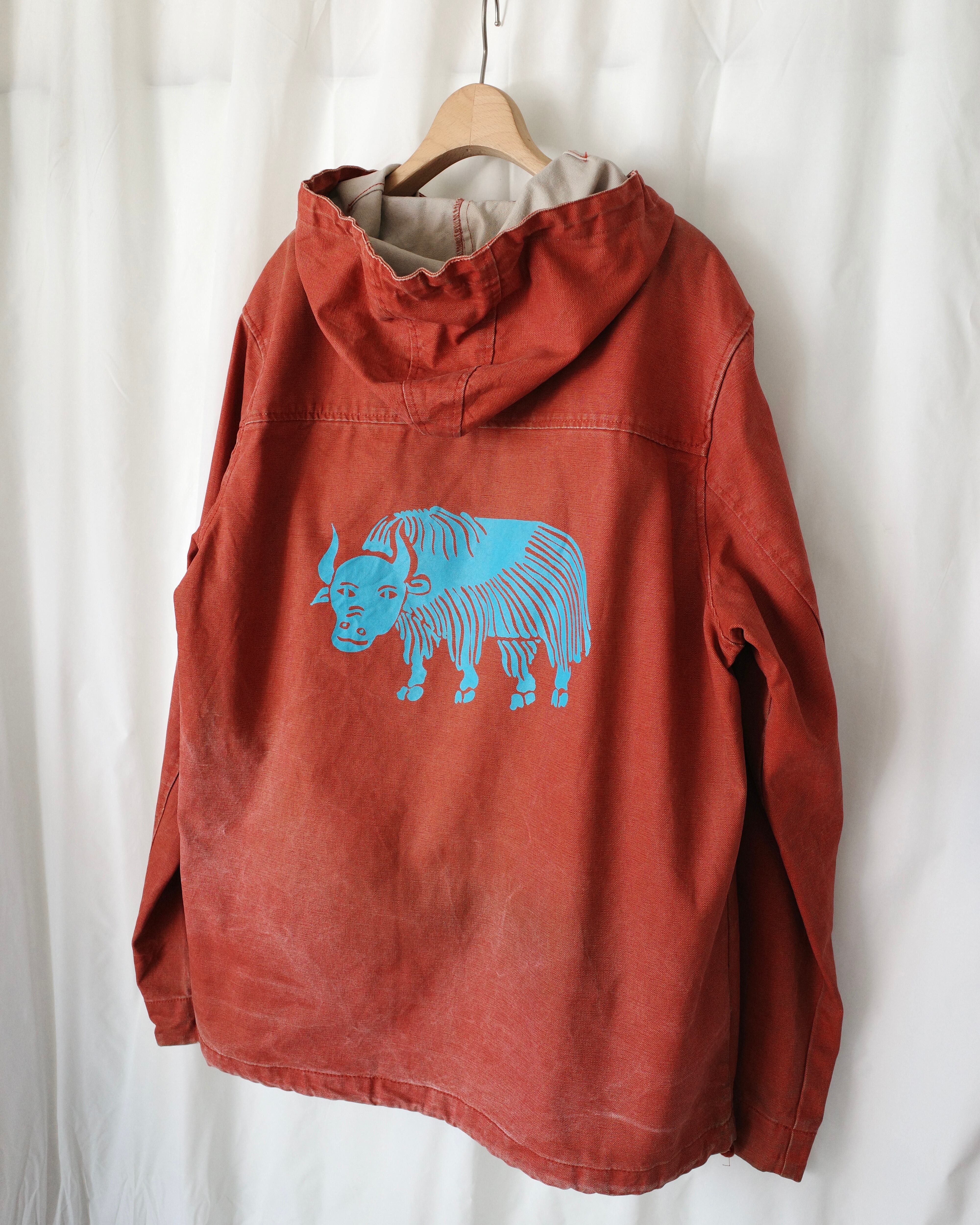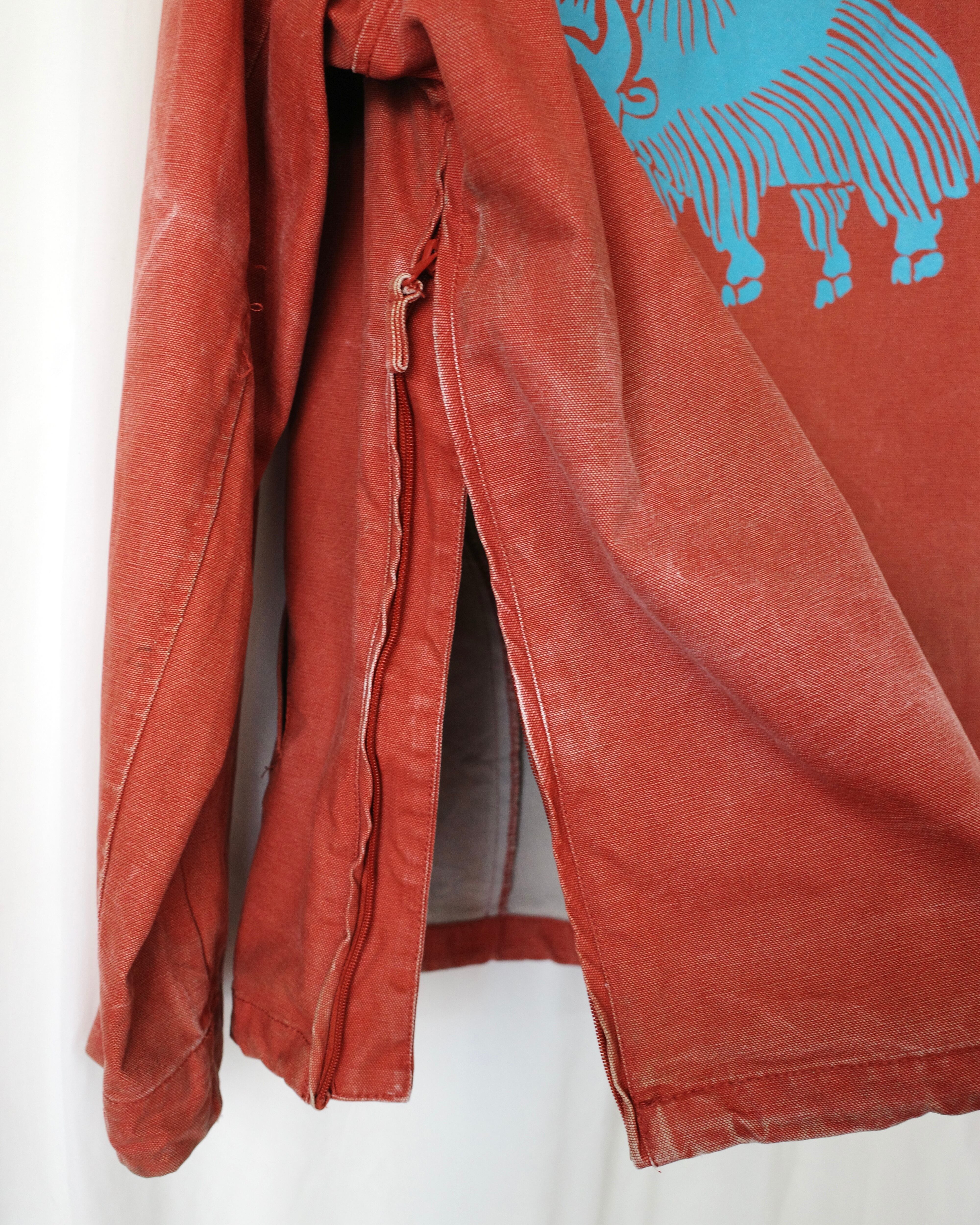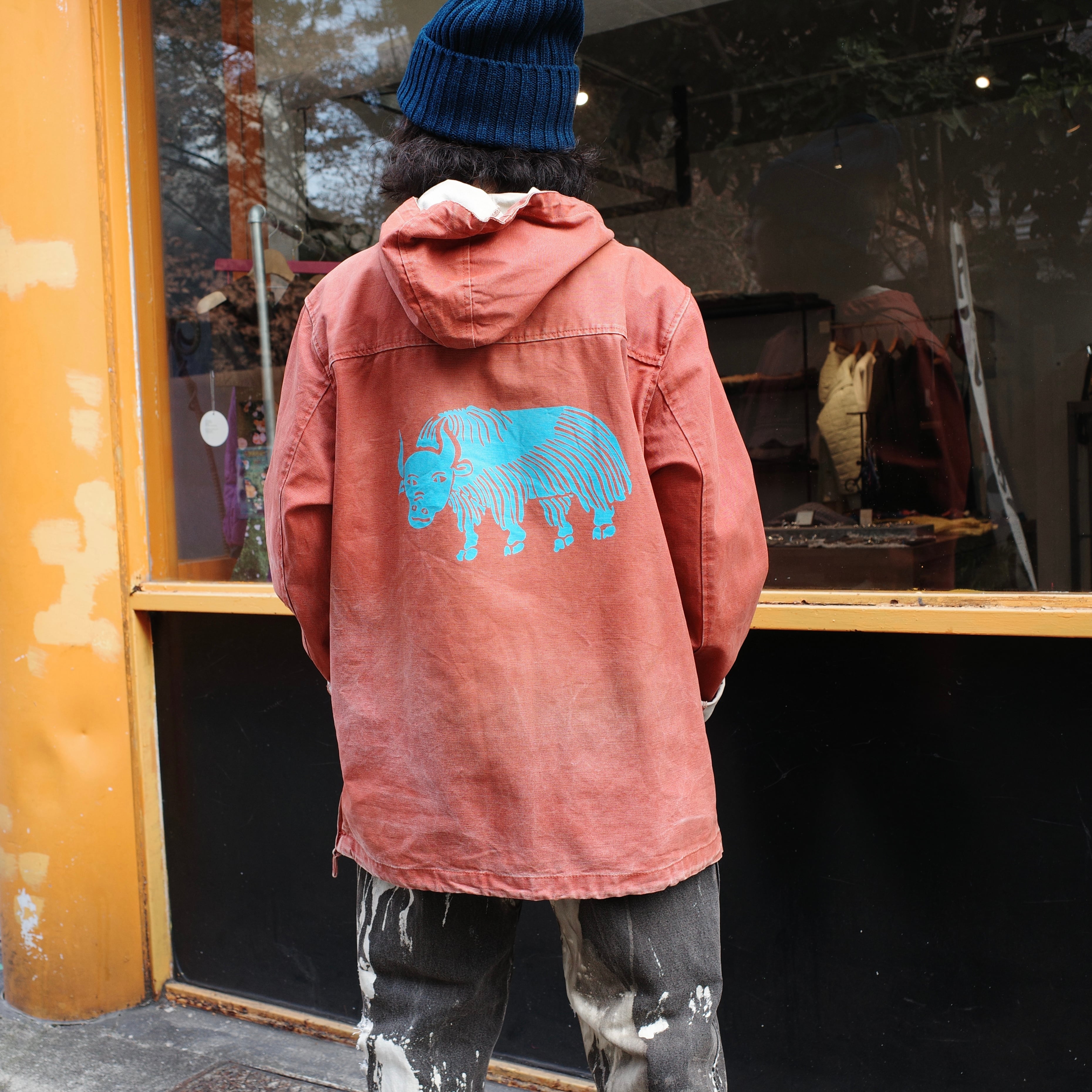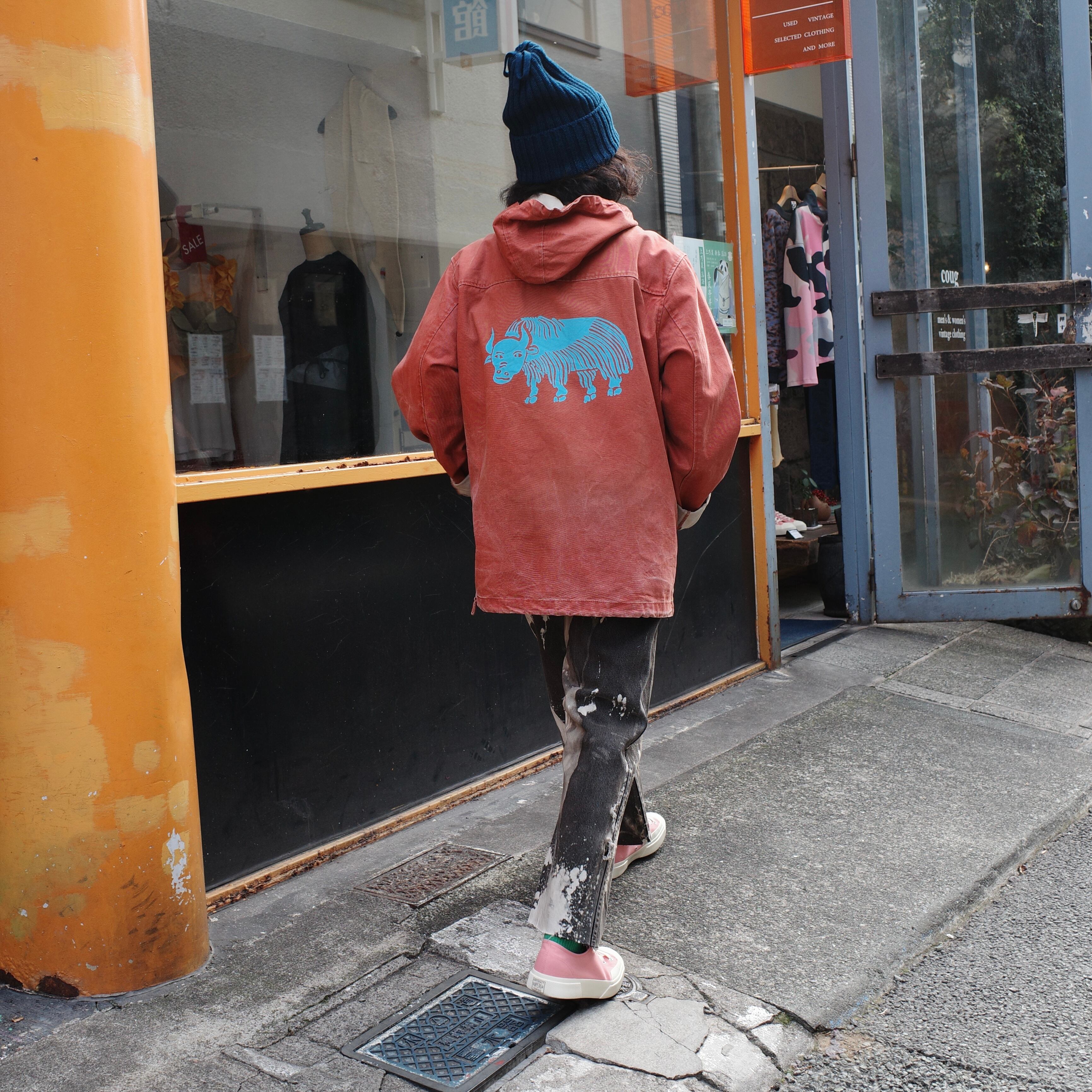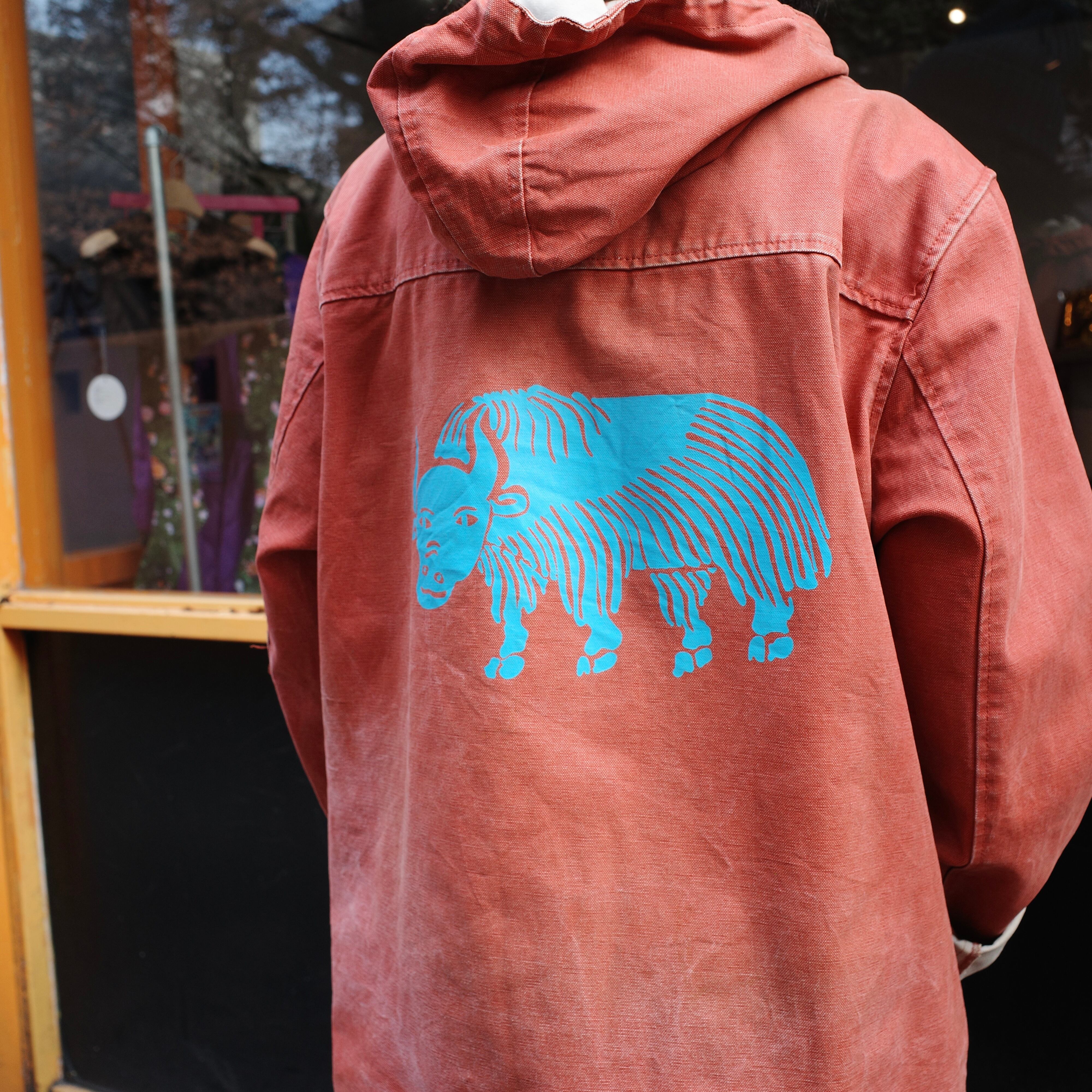 厚手オンス、帆布生地にシルクスクリーンで刷られた背中のバックプリントが可愛らしい一着