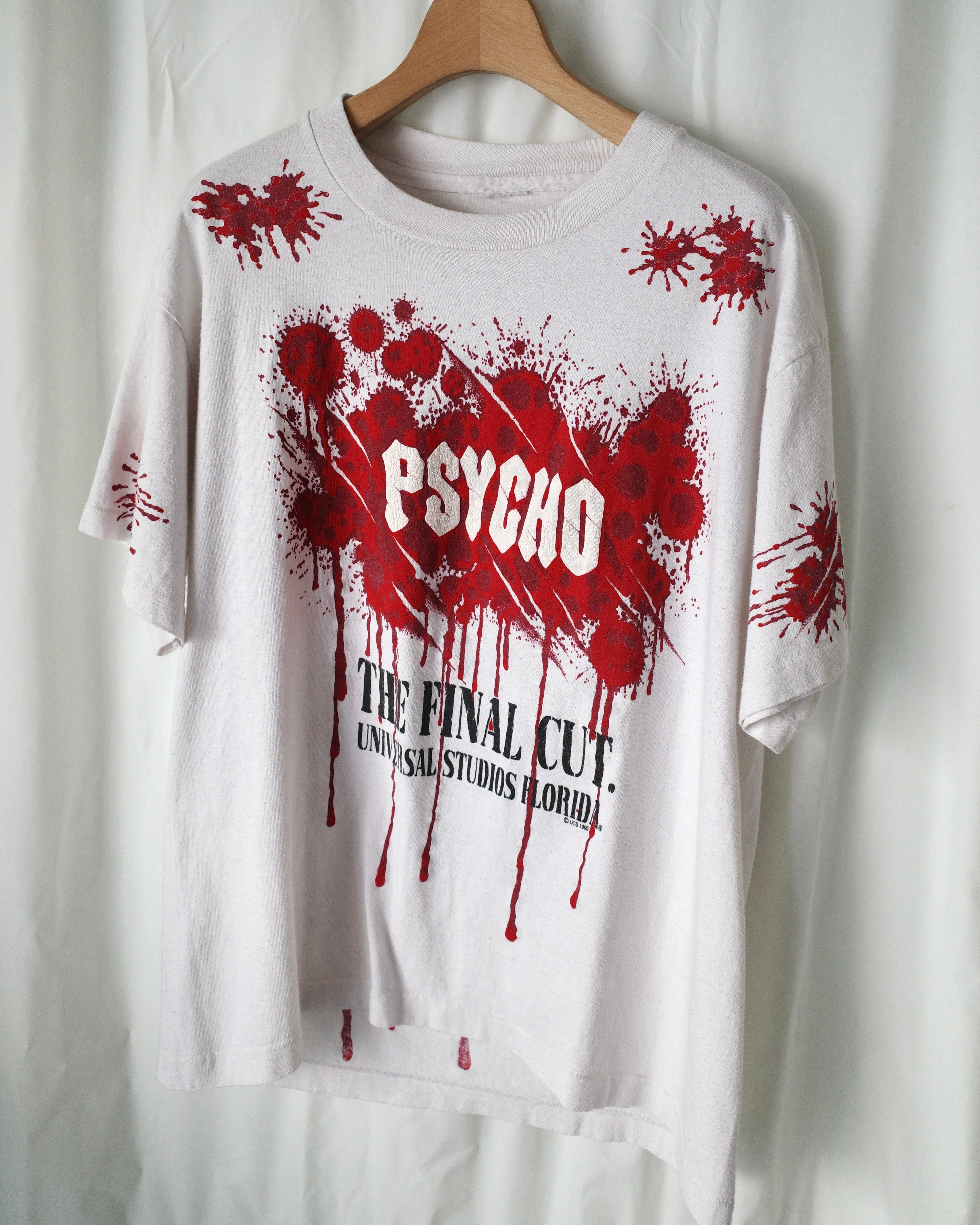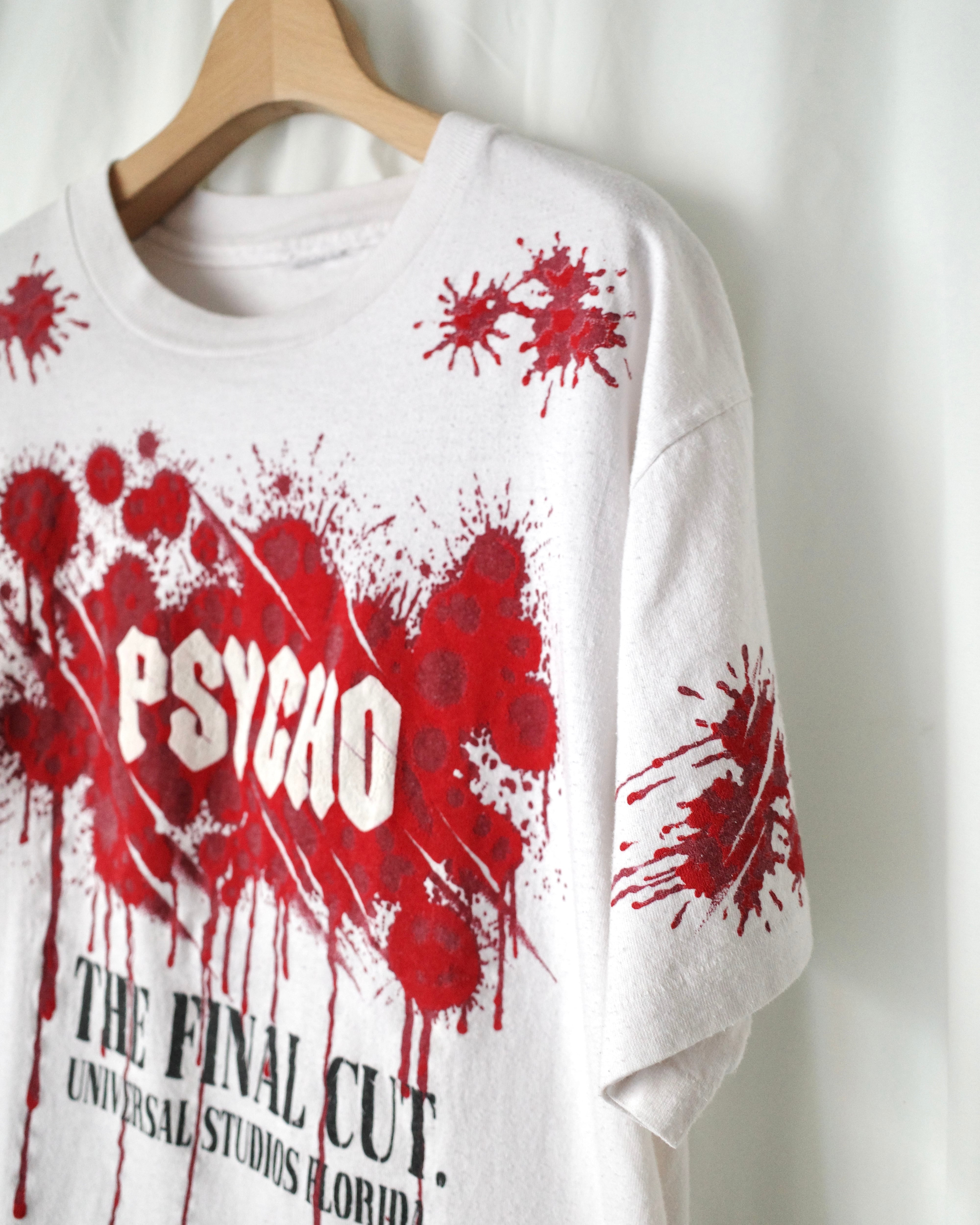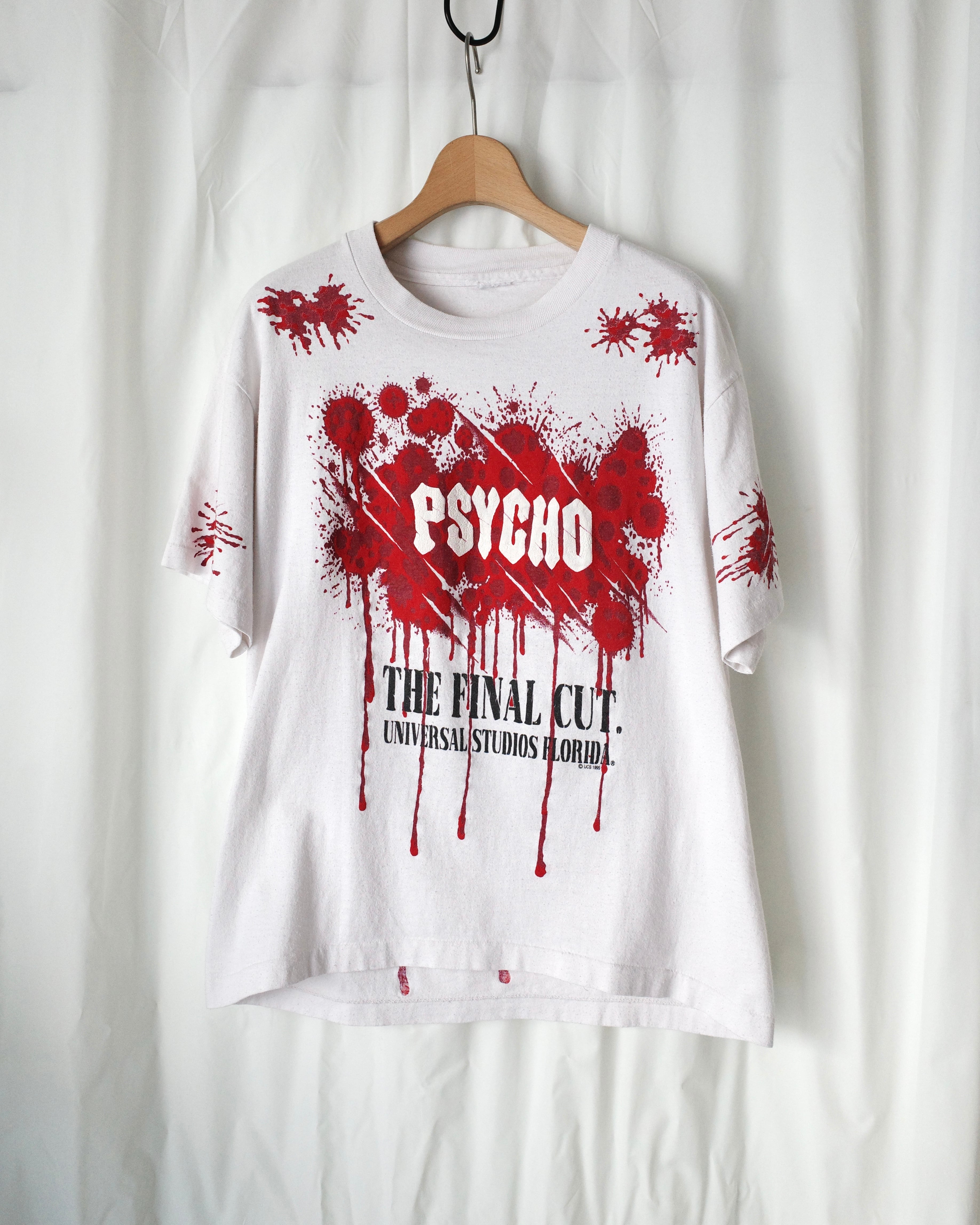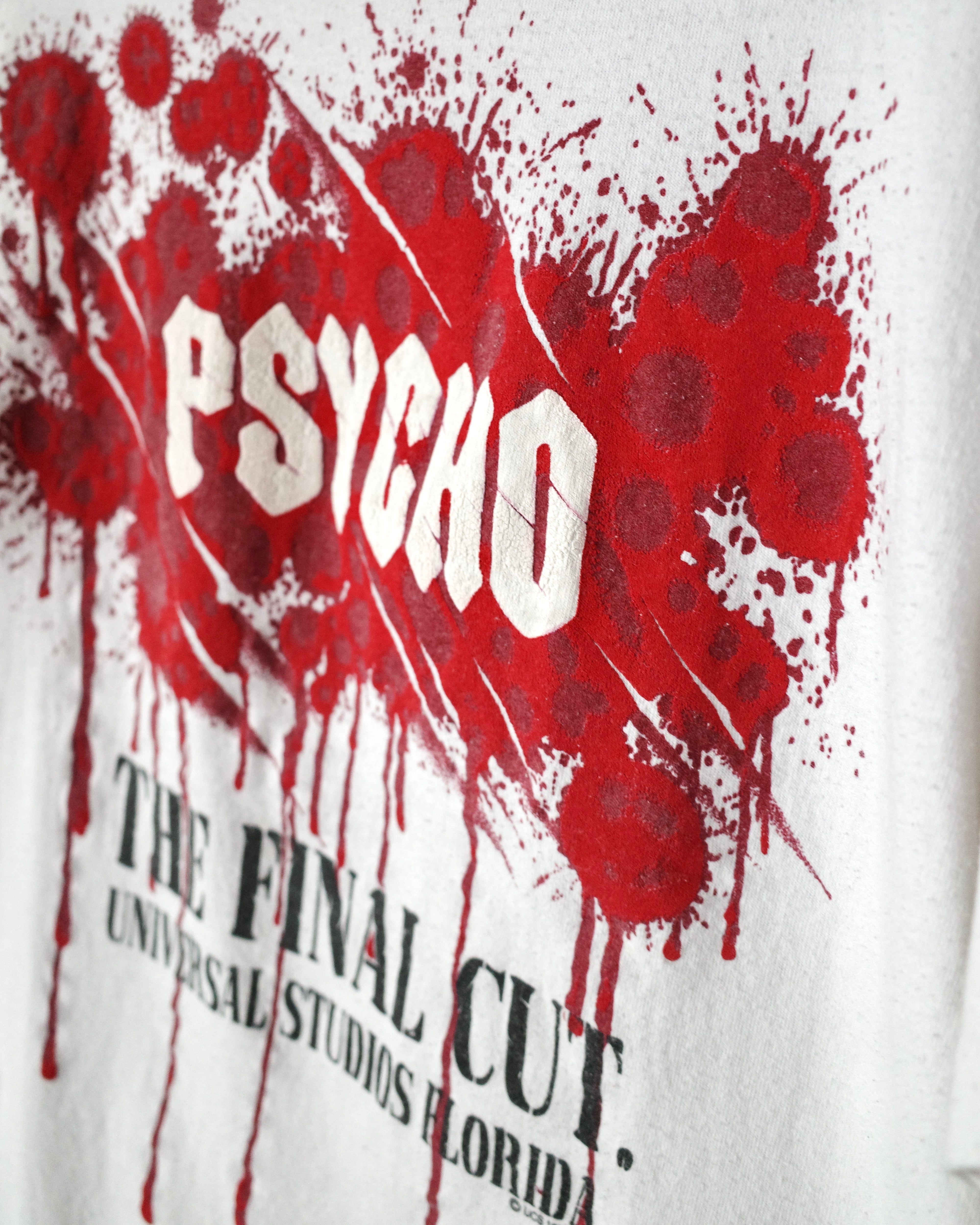 1960年公開の映画"PSYCHO"、最後の作品である"PSYCHO4"ではユニバーサル・スタジオ・フロリダをロケ地とした際のプロモTシャツと思われます