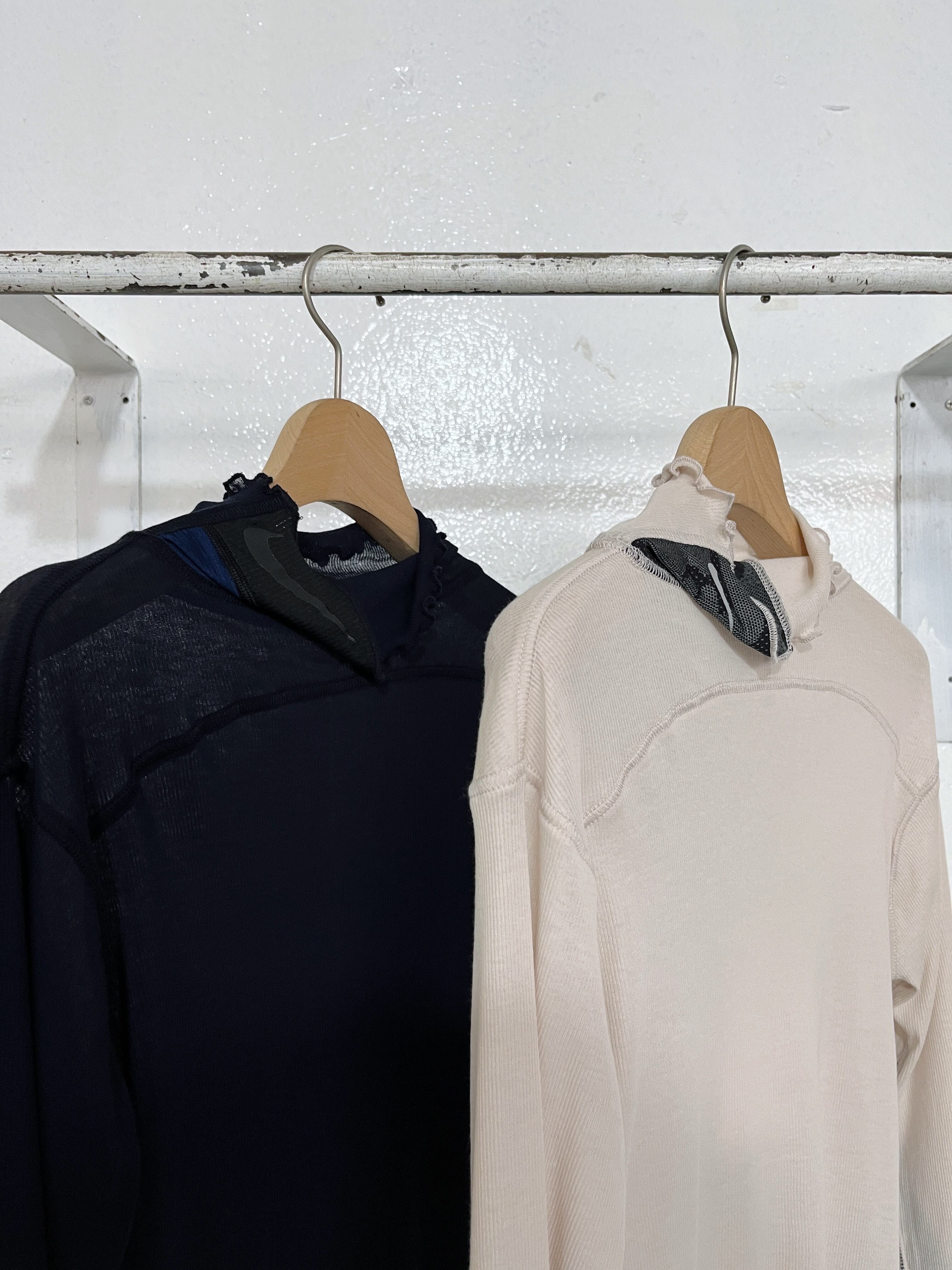 超長綿スーピマ原料の強撚糸を使用し繊細に編み上げられたテレコ(リブ)を使用したハイネックL/S T。